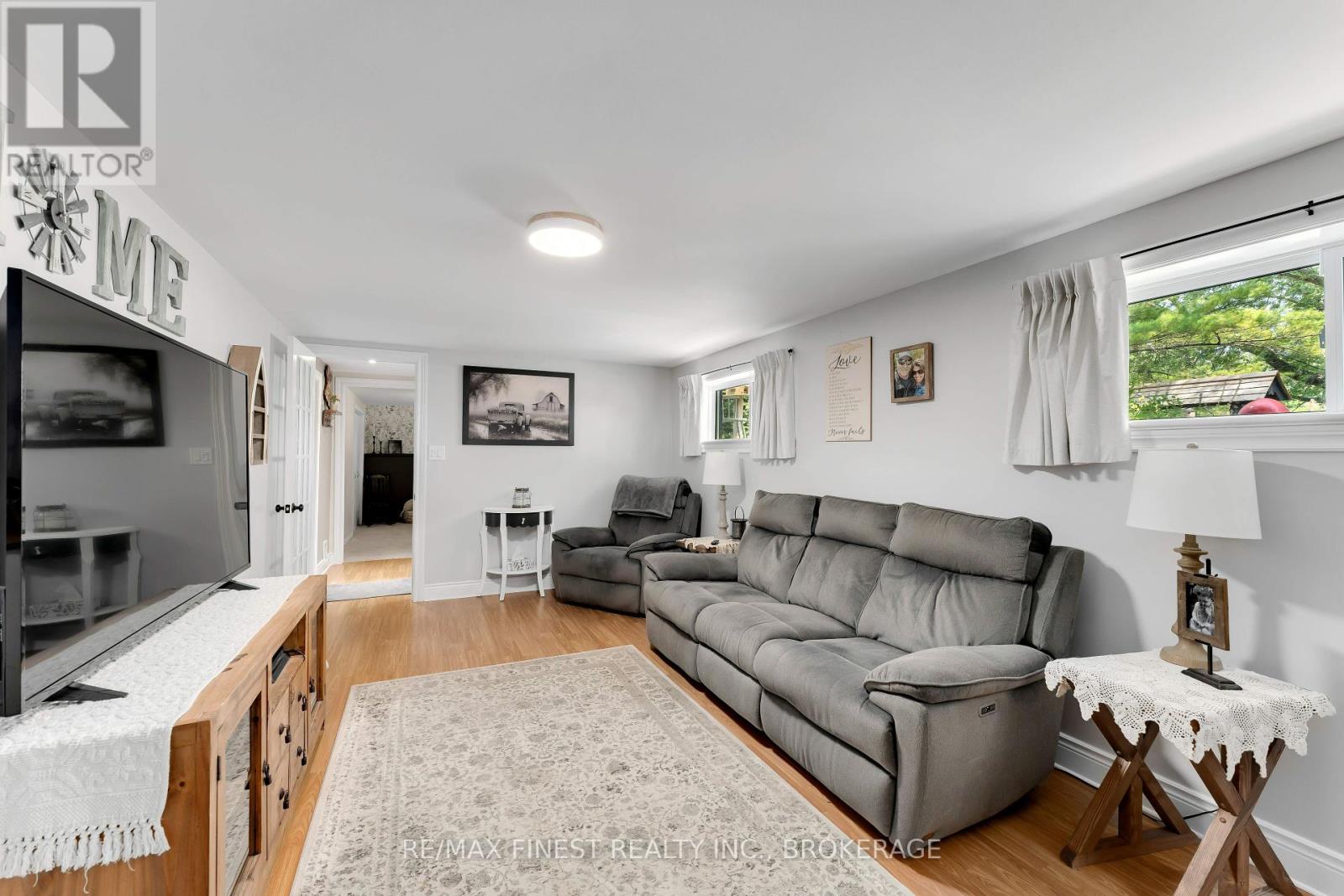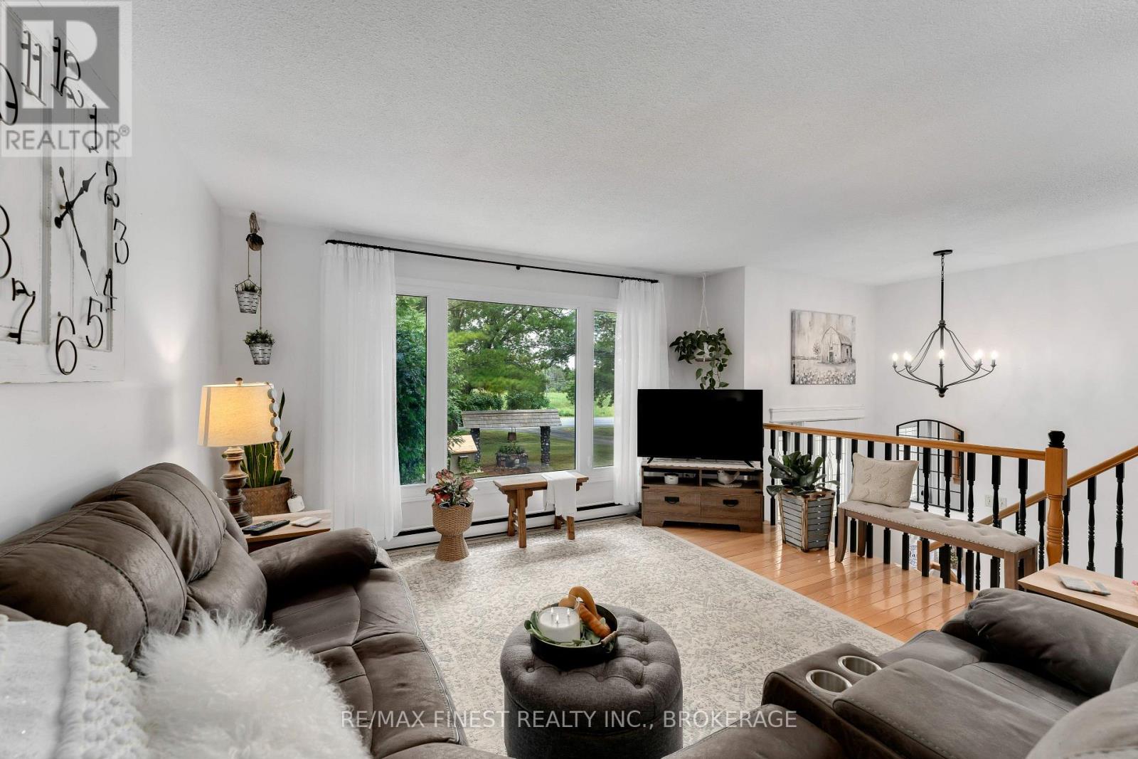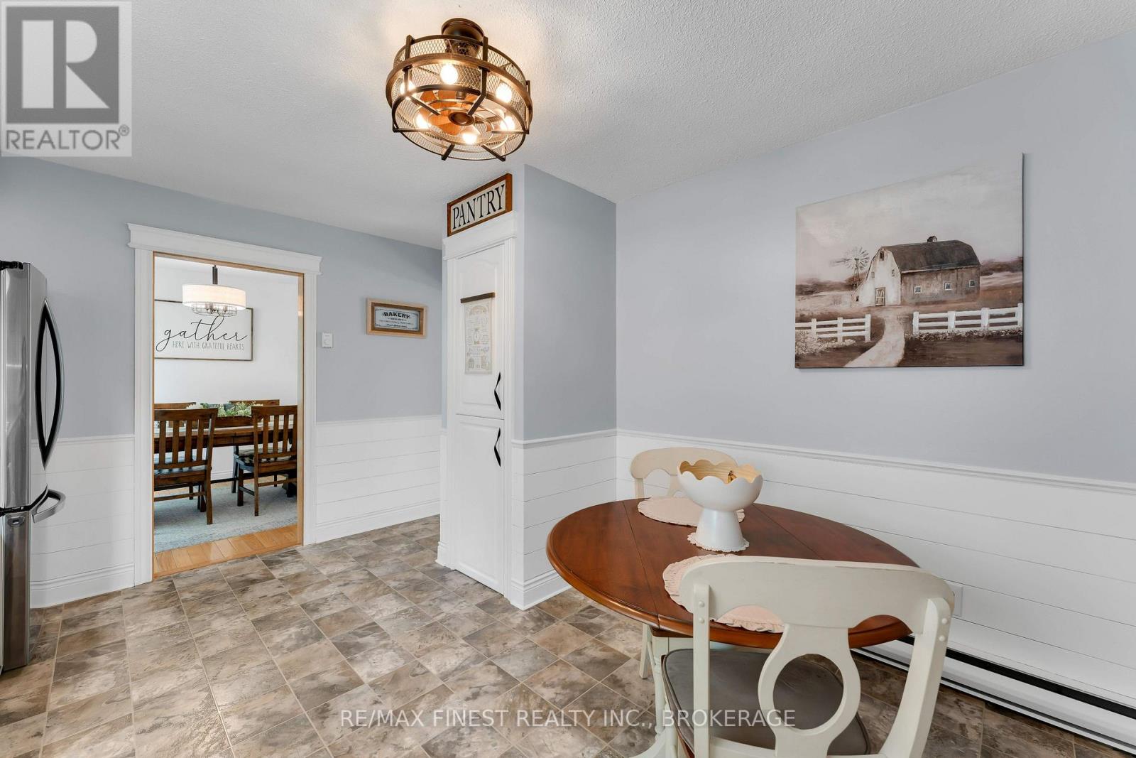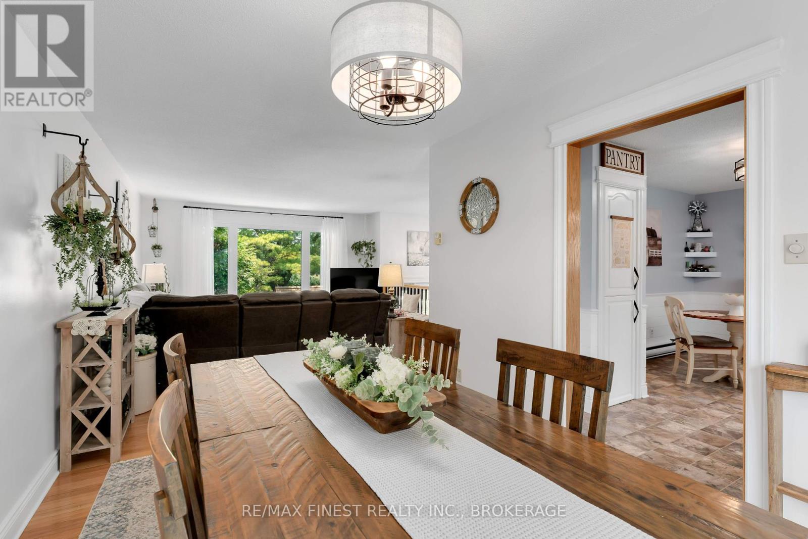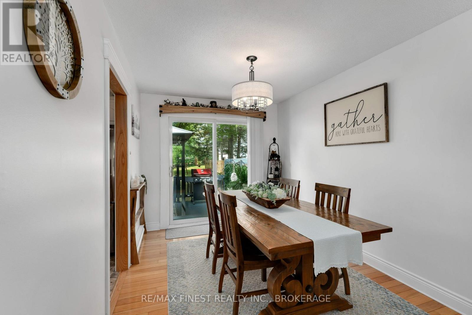 Discover the best of both worlds with this charming 3+1 bedroom, 1 Full Bath home, offering 1,200 +/- sq ft of comfortable living space on just under an acre. Enjoy the tranquility of country living while being only a short 7-minute drive to town. Step inside to warm hardwood floors and an updated kitchen that flows into the dining area, where patio doors lead out to a spacious deck overlooking your peaceful, tree-lined backyard, an ideal spot for relaxing or entertaining. The home features a generous rec room in the basement, perfect for a family space, home office, or gym. You'll also find a large storage/laundry room downstairs, offering plenty of functionality and organization options. An attached 1.5-car insulated garage includes inside entry and a convenient walk-up from the basement, adding both comfort and practicality to your everyday living. (id:29295)