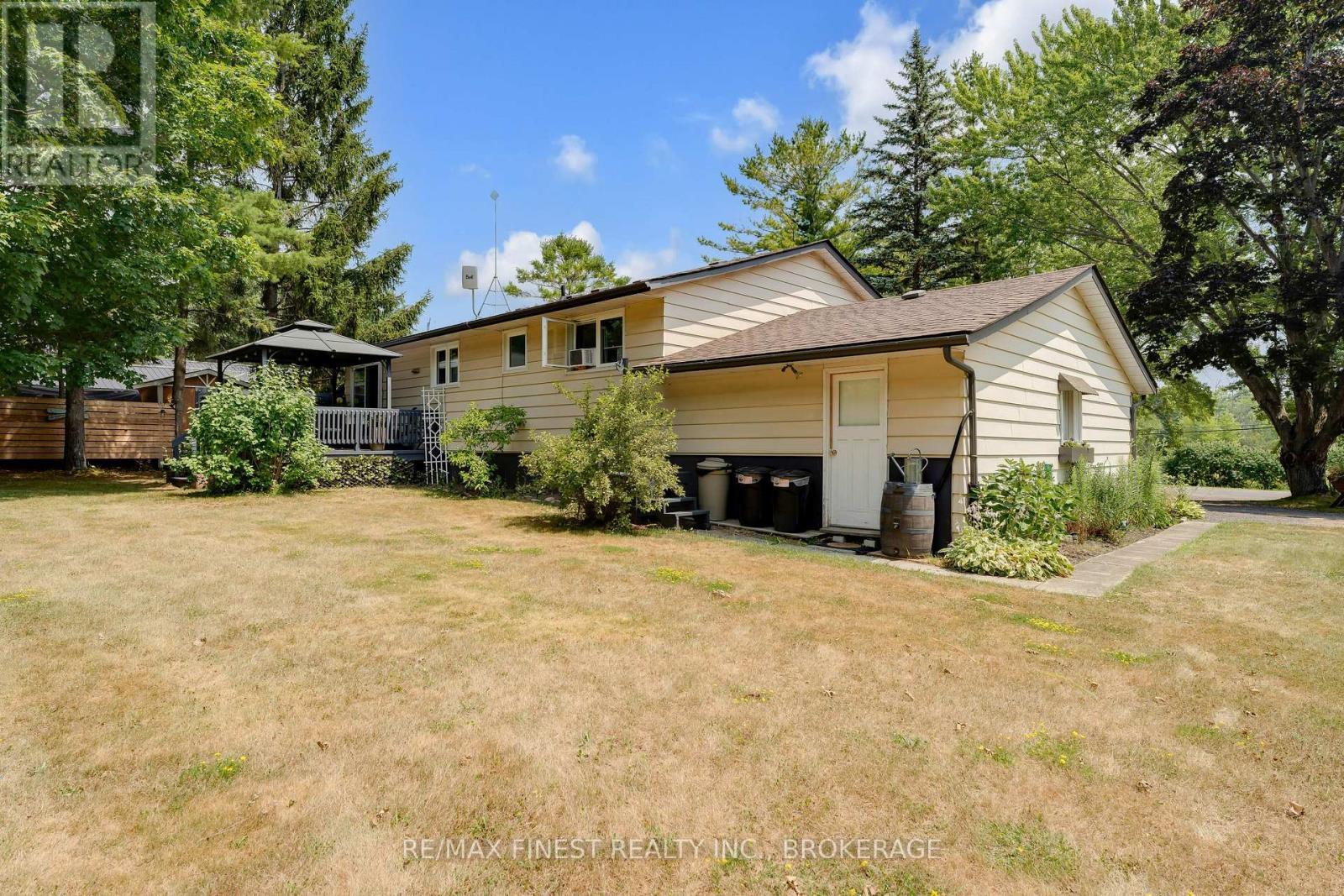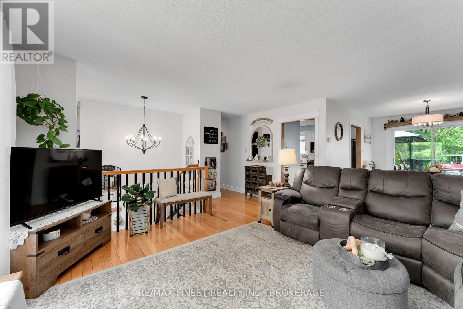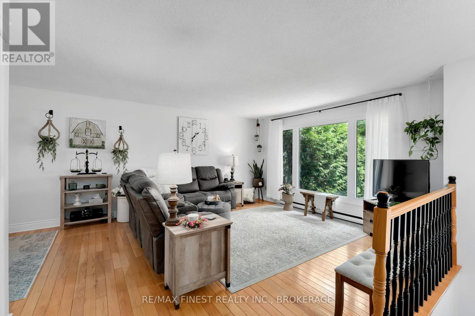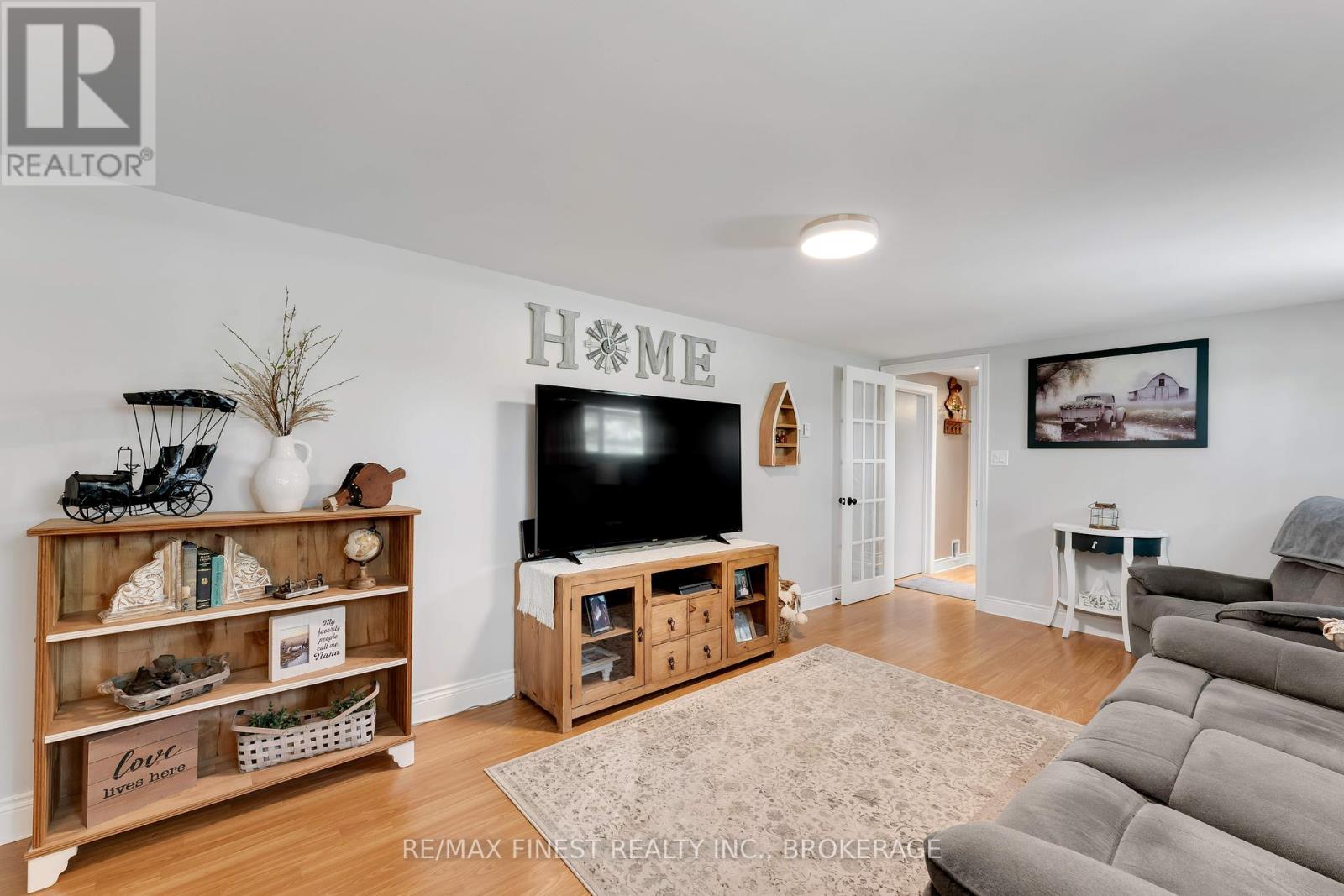 Discover the best of both worlds with this charming 3+1 bedroom, 1 Full Bath home, offering 1,200 +/- sq ft of comfortable living space on just under an acre. Enjoy the tranquility of country living while being only a short 7-minute drive to town. Step inside to warm hardwood floors and an updated kitchen that flows into the dining area, where patio doors lead out to a spacious deck overlooking your peaceful, tree-lined backyard, an ideal spot for relaxing or entertaining. The home features a generous rec room in the basement, perfect for a family space, home office, or gym. You'll also find a large storage/laundry room downstairs, offering plenty of functionality and organization options. An attached 1.5-car insulated garage includes inside entry and a convenient walk-up from the basement, adding both comfort and practicality to your everyday living. (id:29295)