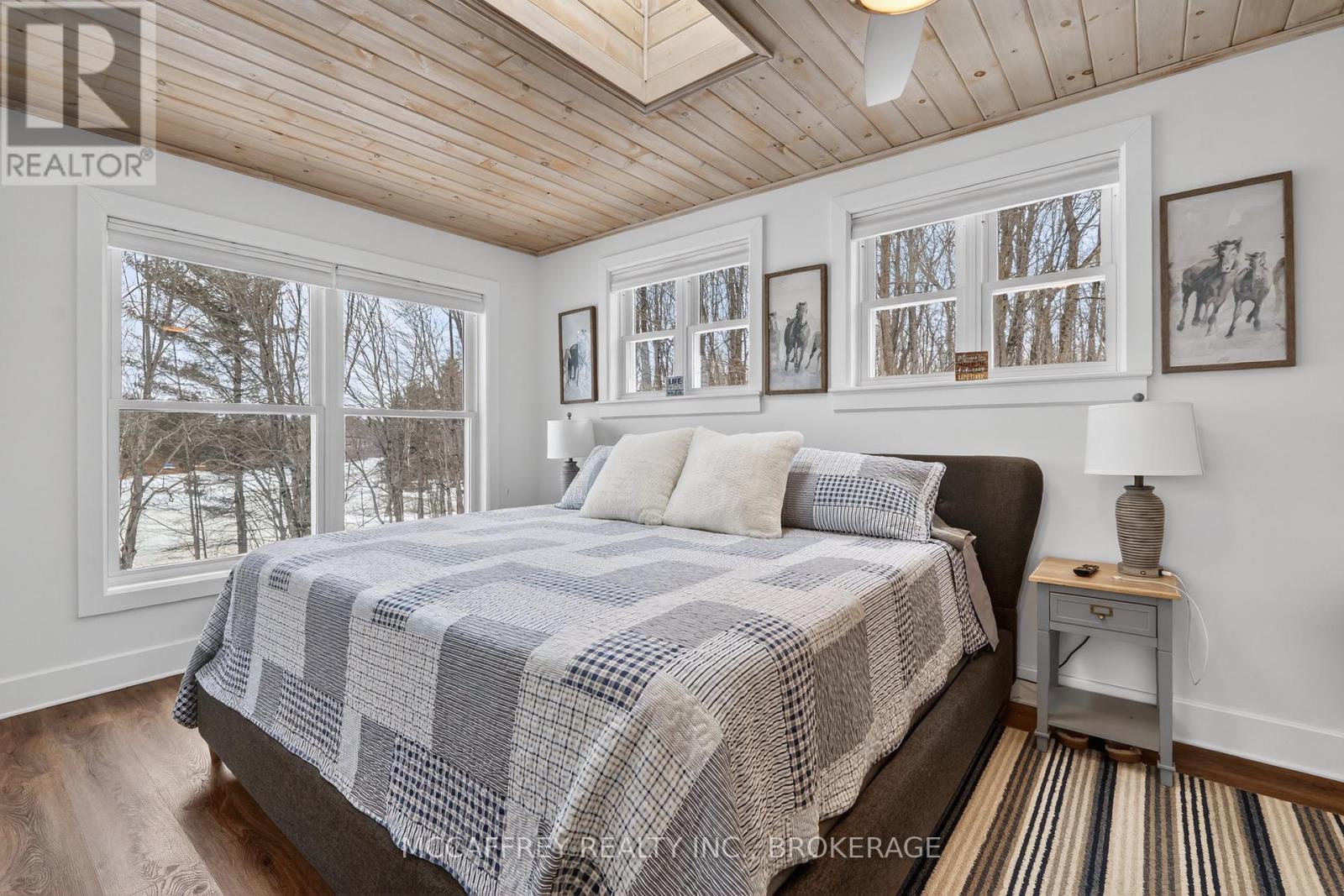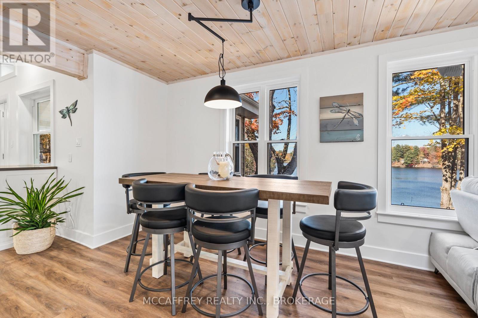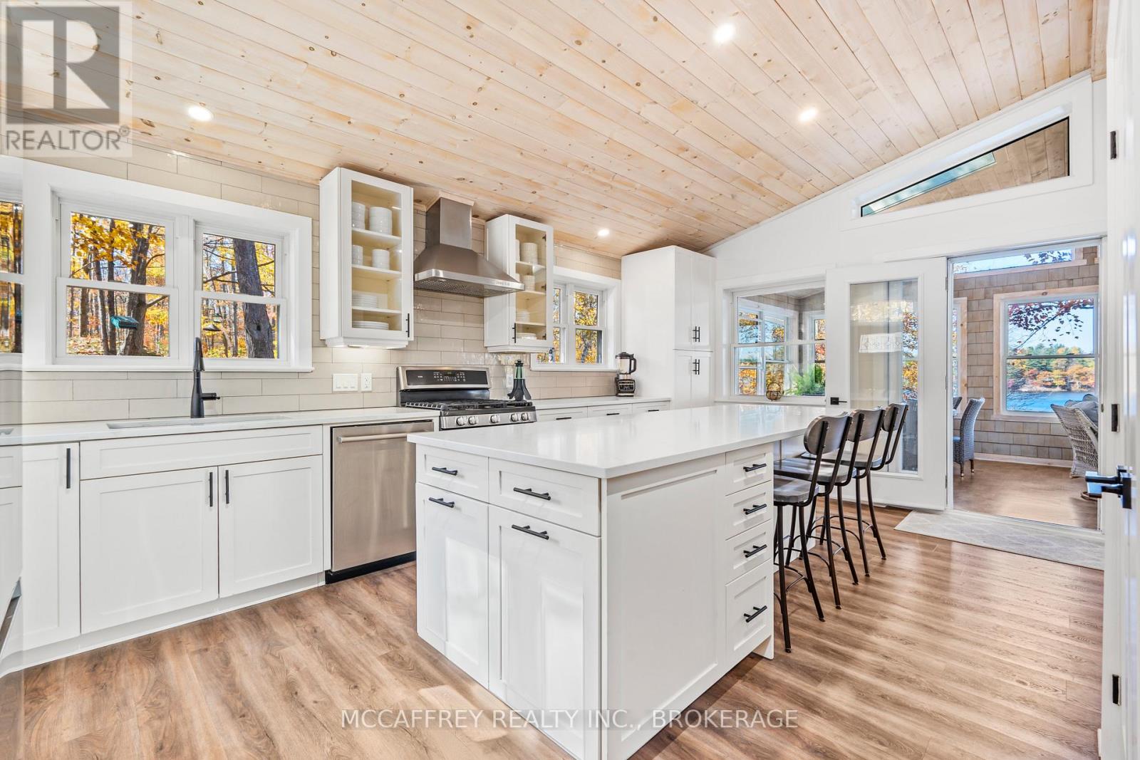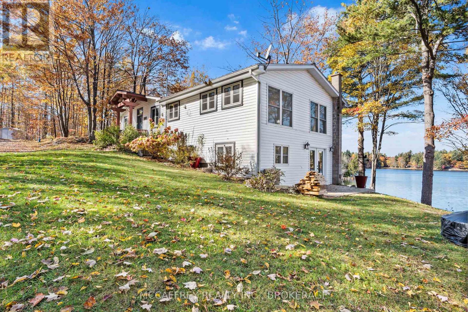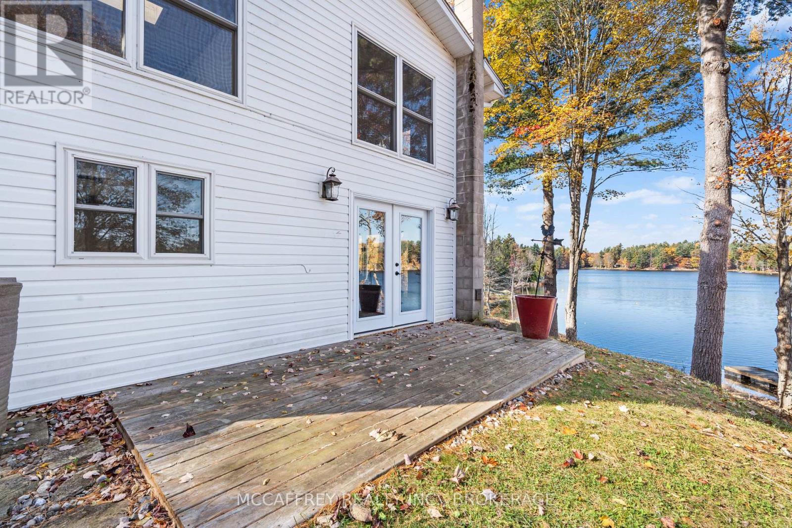 Welcome to your own slice of waterfront paradise on beautiful Elbow Lake. This beautifully updated bungalow sits on just over 140 feet of pristine shoreline, offering peaceful surroundings, mature trees, and stunning water views from nearly every room. Step inside to a gorgeous, fully updated kitchen featuring Quartz countertops, a large island, and ample cupboard space-perfect for entertaining or everyday living. The kitchen flows seamlessly into the spacious three-season sunroom, wrapped in windows that showcase breathtaking views of the lake and filled with natural light. From here, step out onto the deck overlooking the water, an ideal spot for morning coffee or evening sunsets. The main level also offers convenient main floor laundry, a 4-piece bathroom, and comfortable dining and living spaces designed to capture the beauty of the waterfront setting. The primary bedroom is a peaceful retreat, complete with a walk-in closet and private 3-piece ensuite. The fully finished walk-out basement expands the living space with two additional bedrooms, a 2-piece bathroom, and a generous utility room with plenty of storage. Patio doors lead directly outside, making it easy to enjoy the lakefront lifestyle. Outdoors, the property is framed by large mature trees that provide privacy and natural beauty. Enjoy clean, deep water from the brand new dock, perfect for swimming, boating, or simply relaxing by the shore. A convenient bunkie offers additional space for guests, making weekend gatherings and summer visits effortless. Whether you're looking for a year-round home or the perfect waterfront getaway, this exceptional property delivers the ultimate Elbow Lake lifestyle. (id:29295)