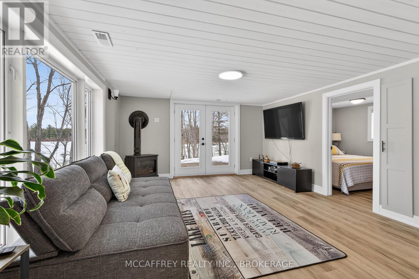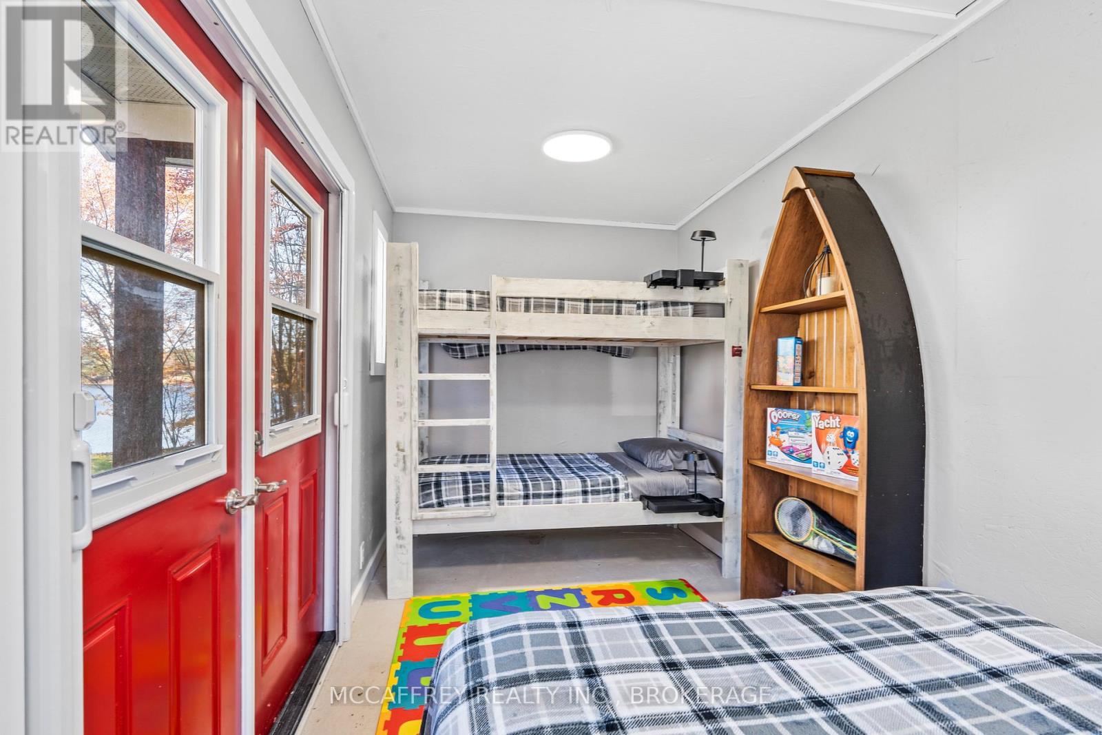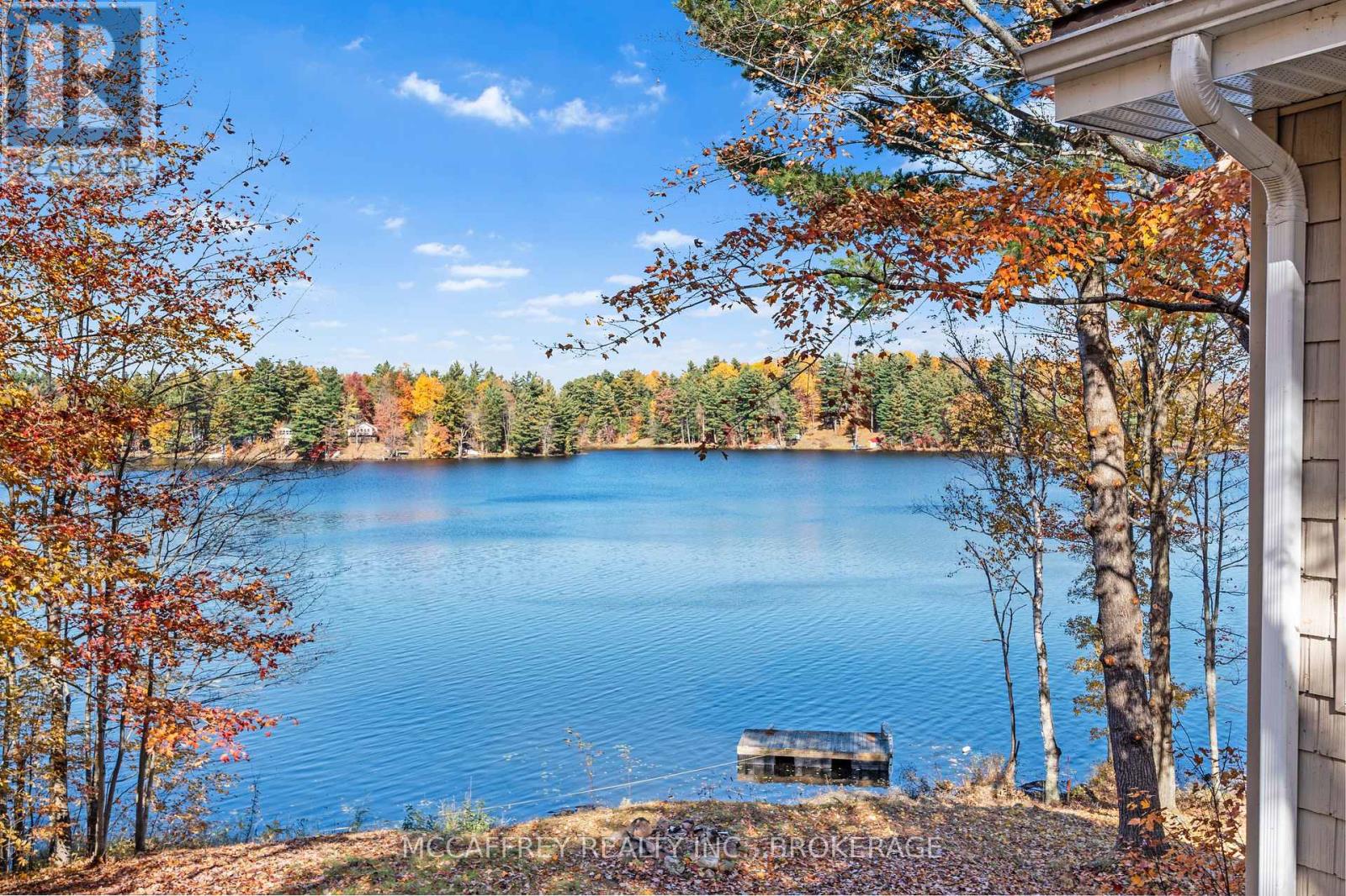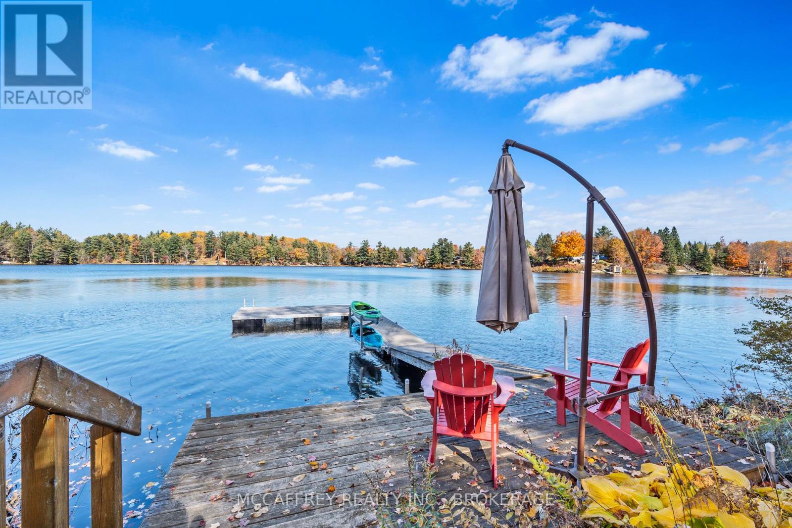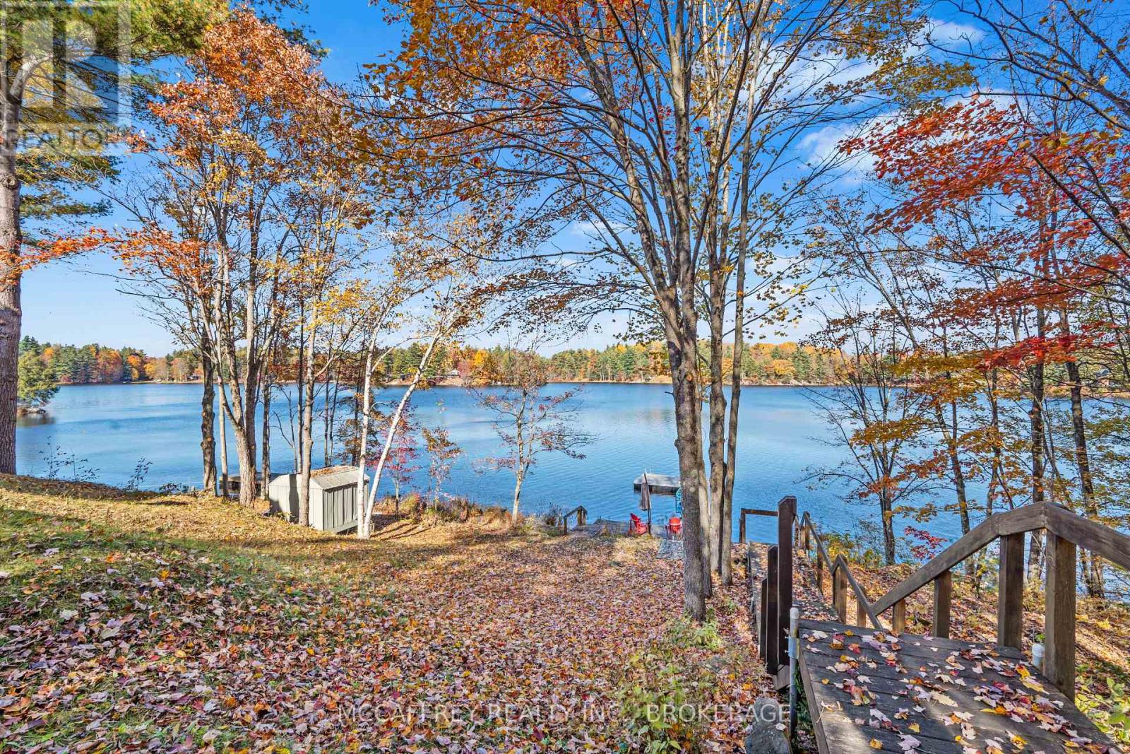 Welcome to your own slice of waterfront paradise on beautiful Elbow Lake. This beautifully updated bungalow sits on just over 140 feet of pristine shoreline, offering peaceful surroundings, mature trees, and stunning water views from nearly every room. Step inside to a gorgeous, fully updated kitchen featuring Quartz countertops, a large island, and ample cupboard space-perfect for entertaining or everyday living. The kitchen flows seamlessly into the spacious three-season sunroom, wrapped in windows that showcase breathtaking views of the lake and filled with natural light. From here, step out onto the deck overlooking the water, an ideal spot for morning coffee or evening sunsets. The main level also offers convenient main floor laundry, a 4-piece bathroom, and comfortable dining and living spaces designed to capture the beauty of the waterfront setting. The primary bedroom is a peaceful retreat, complete with a walk-in closet and private 3-piece ensuite. The fully finished walk-out basement expands the living space with two additional bedrooms, a 2-piece bathroom, and a generous utility room with plenty of storage. Patio doors lead directly outside, making it easy to enjoy the lakefront lifestyle. Outdoors, the property is framed by large mature trees that provide privacy and natural beauty. Enjoy clean, deep water from the brand new dock, perfect for swimming, boating, or simply relaxing by the shore. A convenient bunkie offers additional space for guests, making weekend gatherings and summer visits effortless. Whether you're looking for a year-round home or the perfect waterfront getaway, this exceptional property delivers the ultimate Elbow Lake lifestyle. (id:29295)