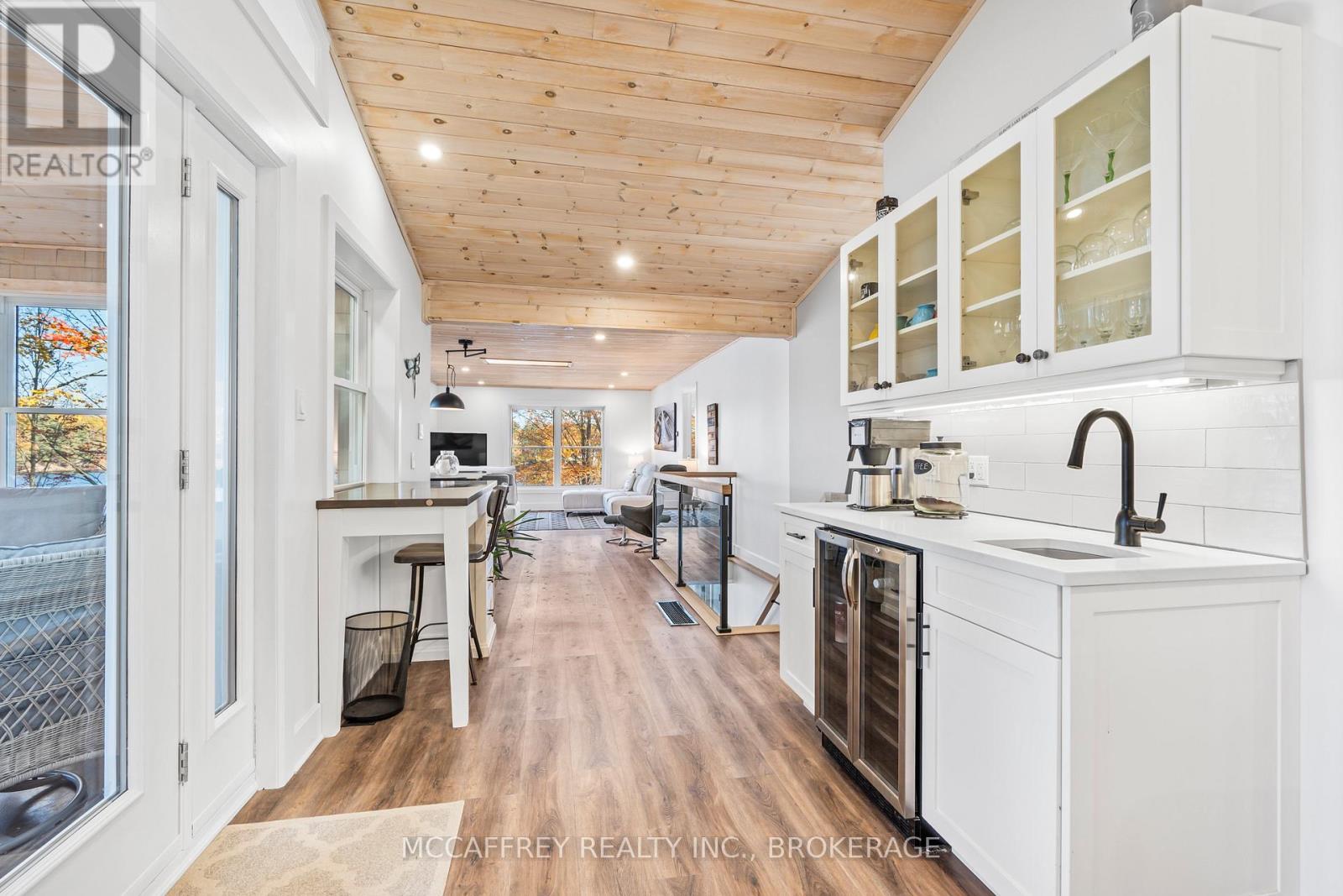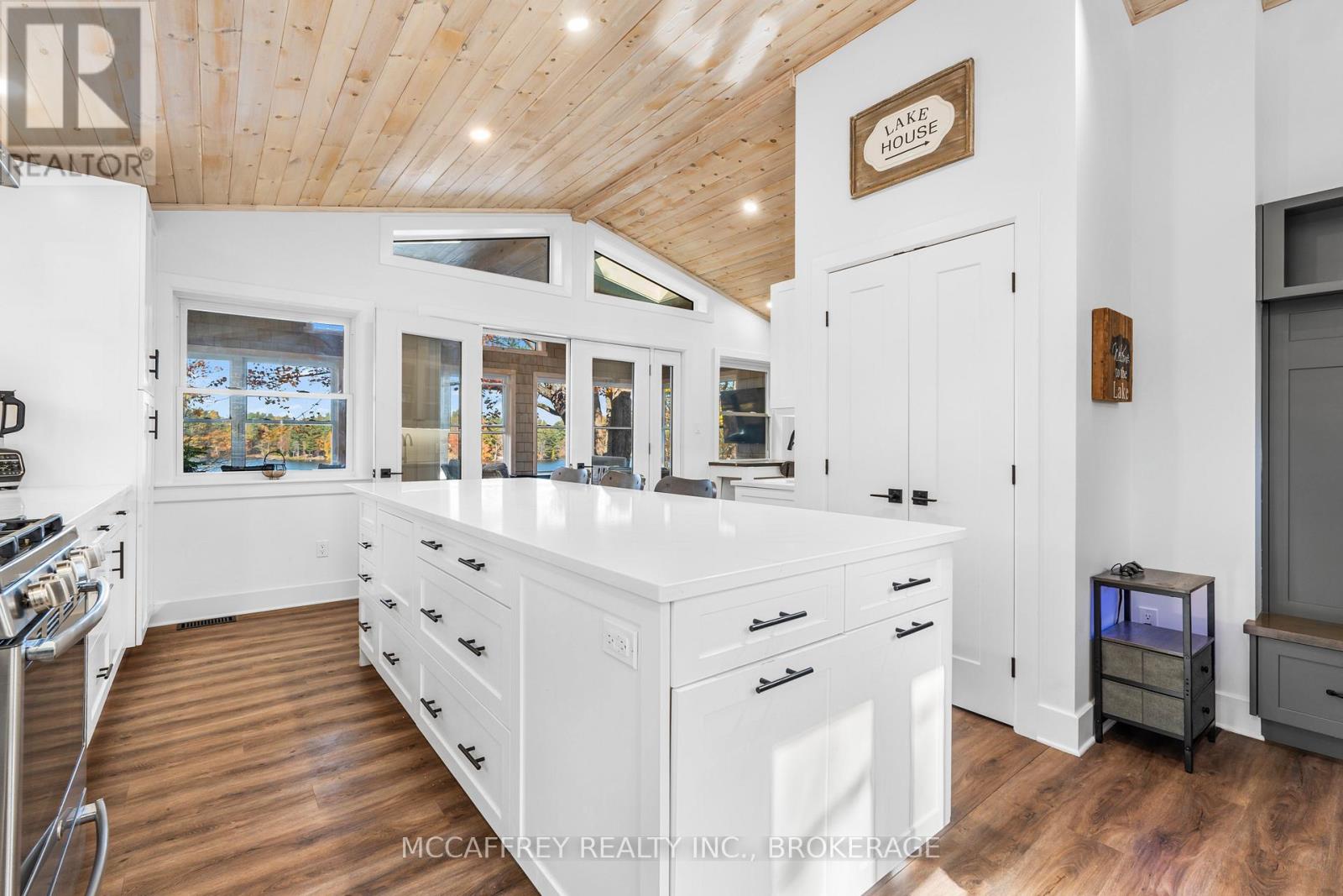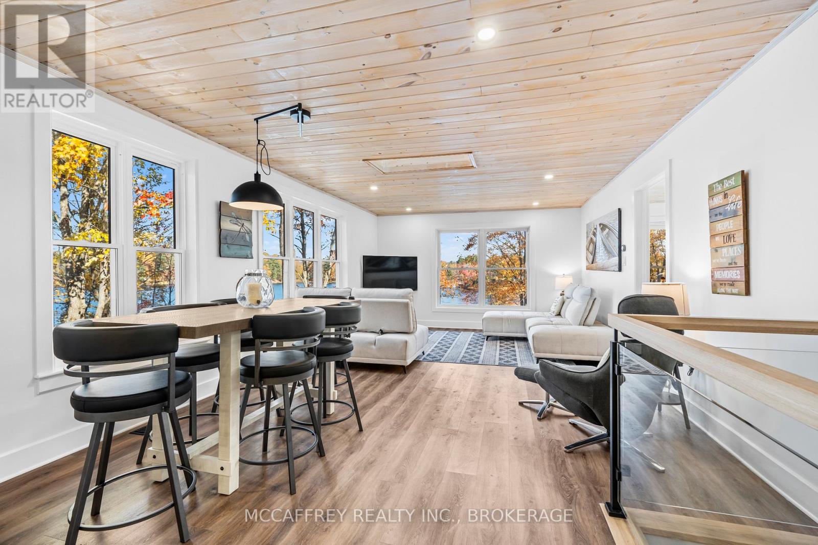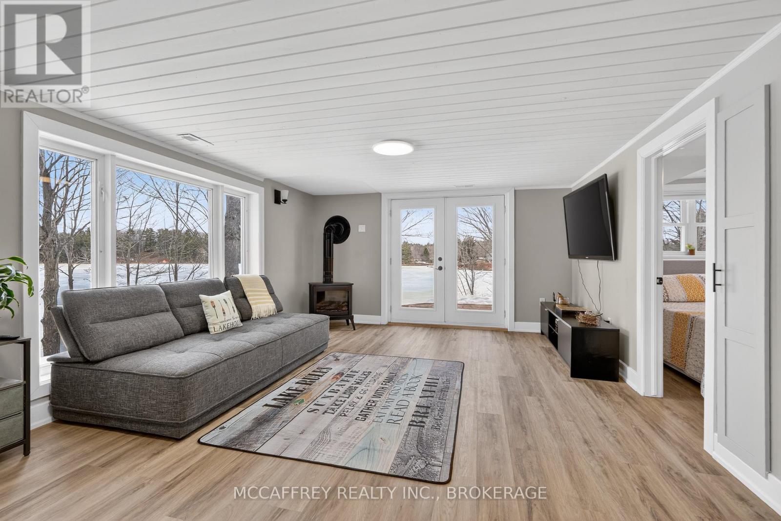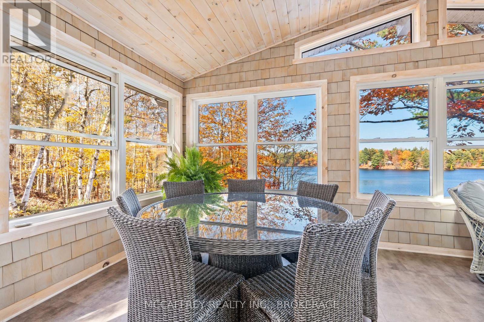 Welcome to your own slice of waterfront paradise on beautiful Elbow Lake. This beautifully updated bungalow sits on just over 140 feet of pristine shoreline, offering peaceful surroundings, mature trees, and stunning water views from nearly every room. Step inside to a gorgeous, fully updated kitchen featuring Quartz countertops, a large island, and ample cupboard space-perfect for entertaining or everyday living. The kitchen flows seamlessly into the spacious three-season sunroom, wrapped in windows that showcase breathtaking views of the lake and filled with natural light. From here, step out onto the deck overlooking the water, an ideal spot for morning coffee or evening sunsets. The main level also offers convenient main floor laundry, a 4-piece bathroom, and comfortable dining and living spaces designed to capture the beauty of the waterfront setting. The primary bedroom is a peaceful retreat, complete with a walk-in closet and private 3-piece ensuite. The fully finished walk-out basement expands the living space with two additional bedrooms, a 2-piece bathroom, and a generous utility room with plenty of storage. Patio doors lead directly outside, making it easy to enjoy the lakefront lifestyle. Outdoors, the property is framed by large mature trees that provide privacy and natural beauty. Enjoy clean, deep water from the brand new dock, perfect for swimming, boating, or simply relaxing by the shore. A convenient bunkie offers additional space for guests, making weekend gatherings and summer visits effortless. Whether you're looking for a year-round home or the perfect waterfront getaway, this exceptional property delivers the ultimate Elbow Lake lifestyle. (id:29295)