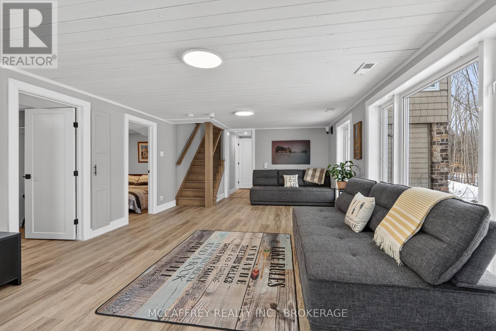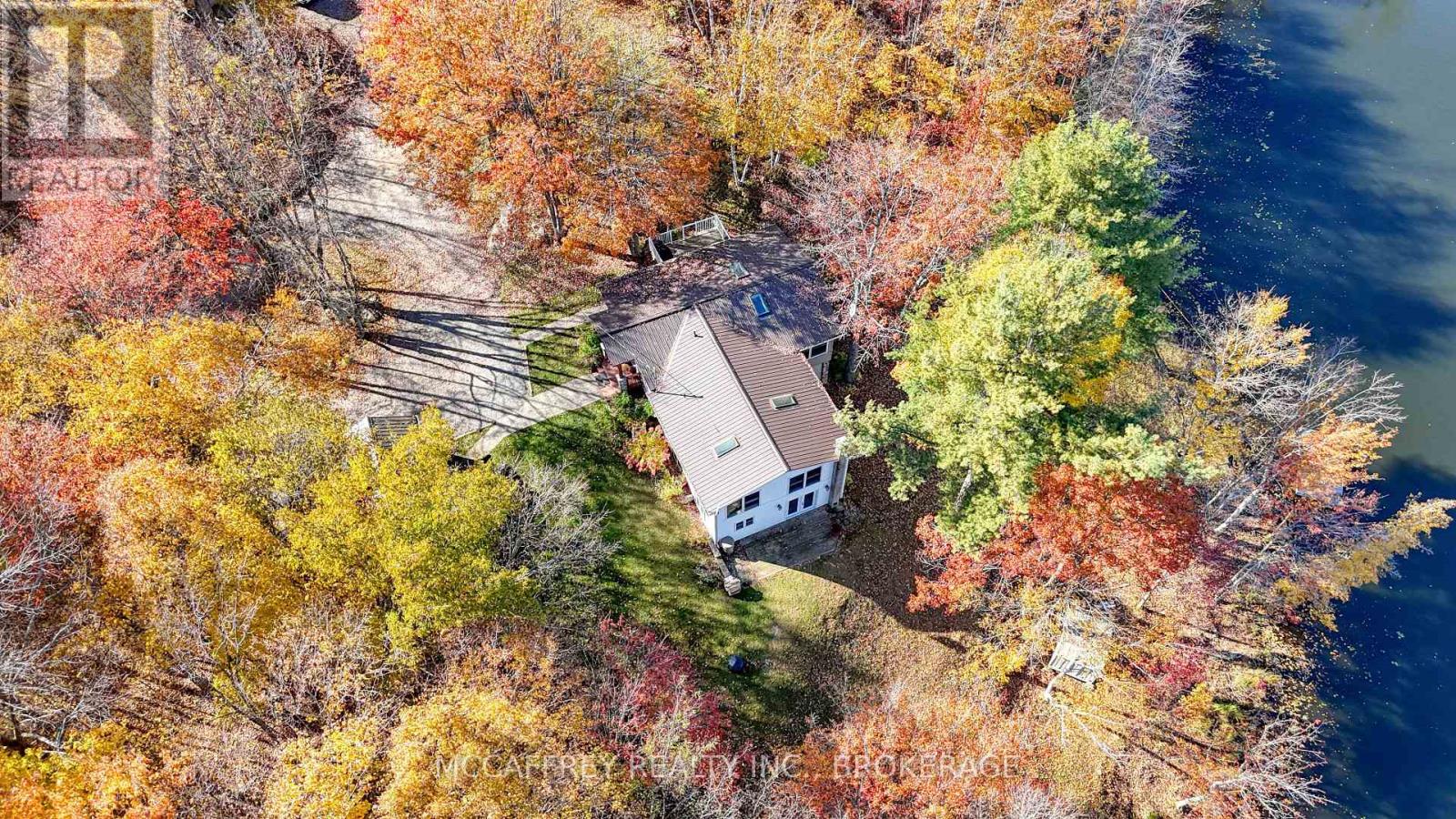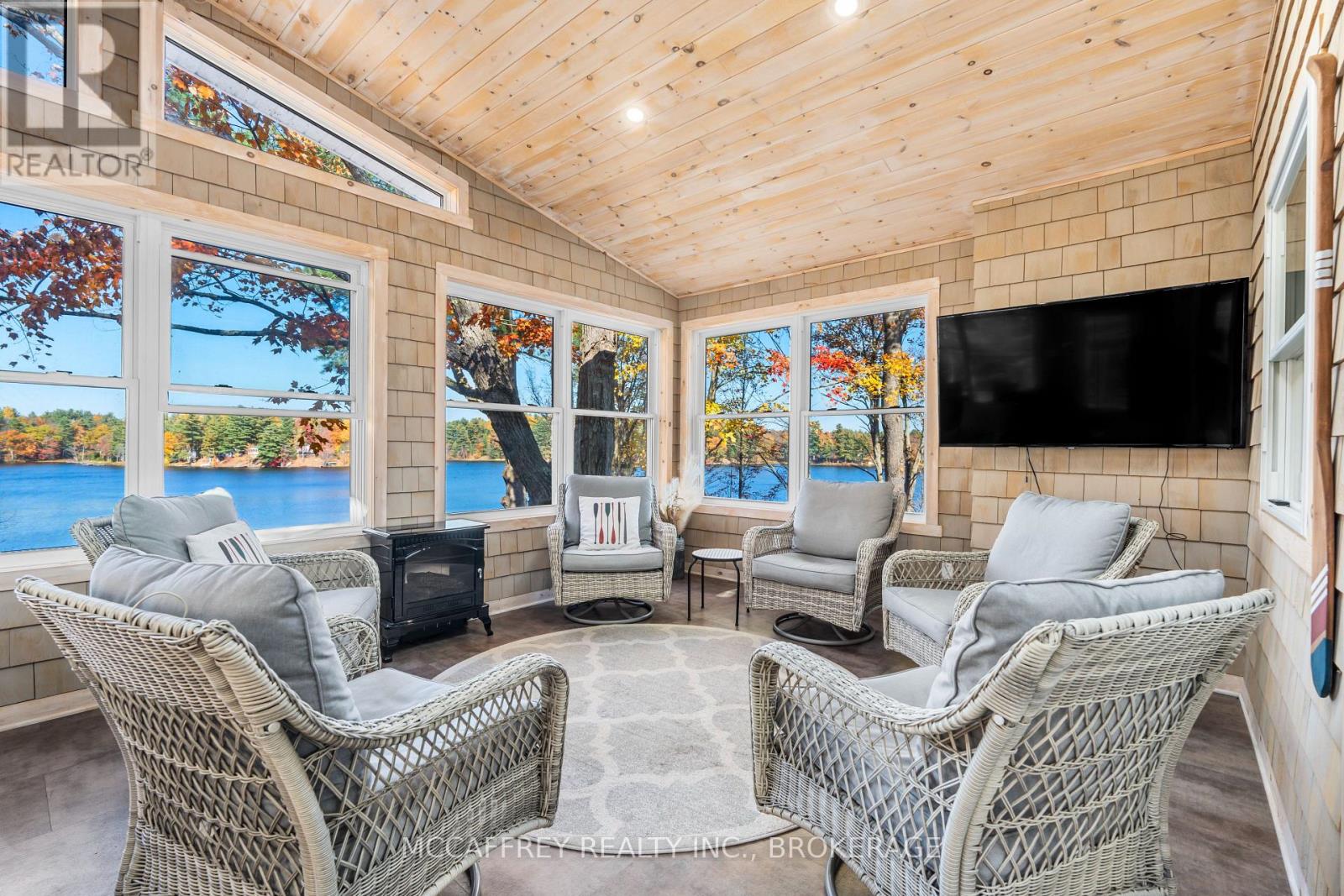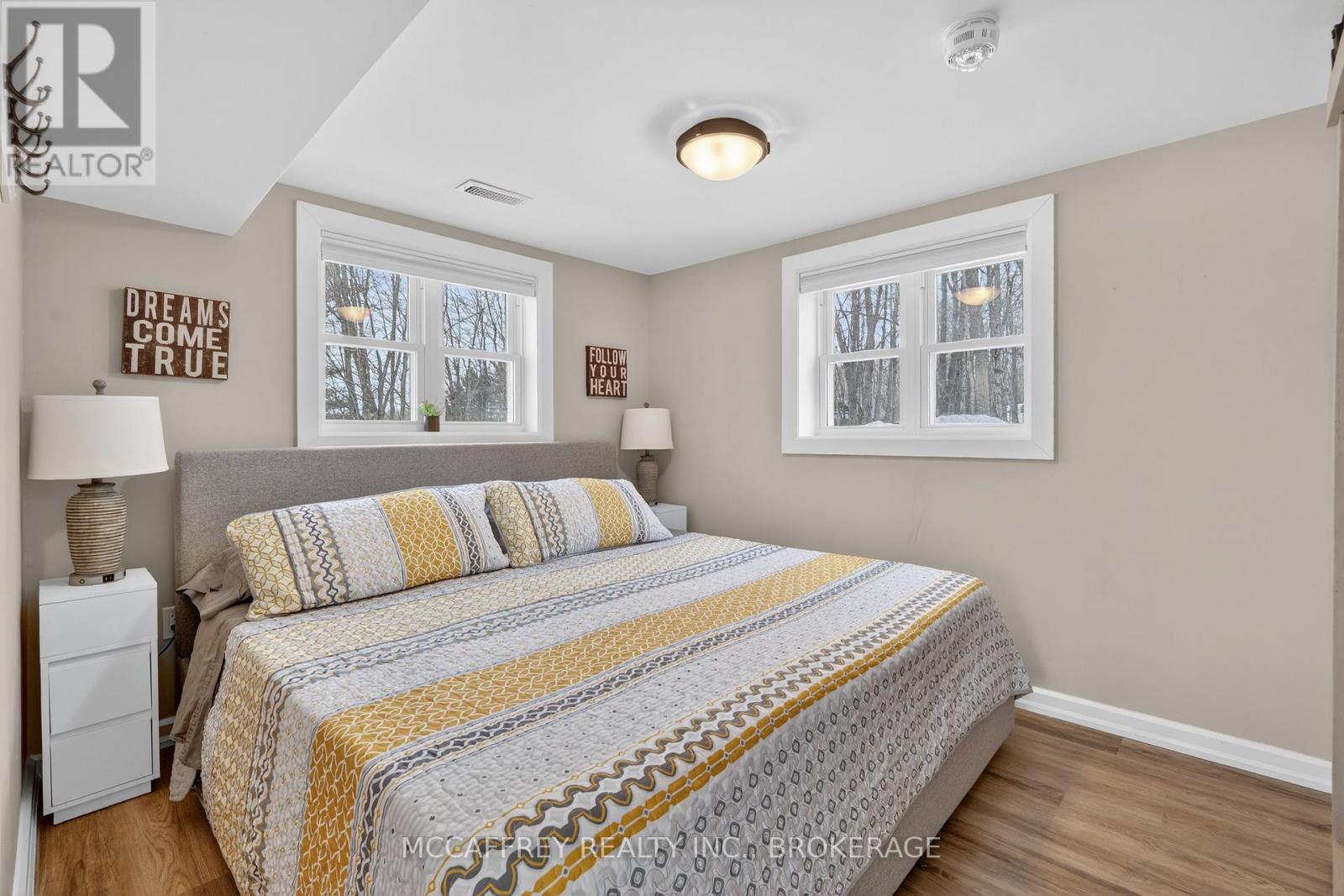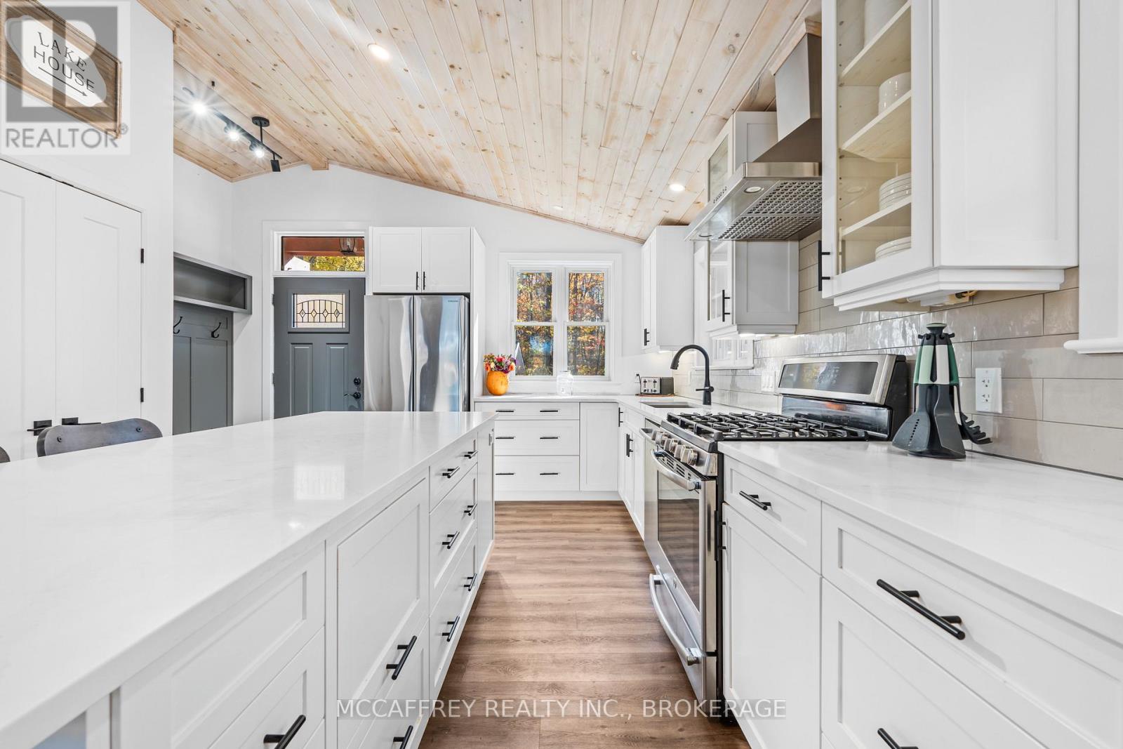 Welcome to your own slice of waterfront paradise on beautiful Elbow Lake. This beautifully updated bungalow sits on just over 140 feet of pristine shoreline, offering peaceful surroundings, mature trees, and stunning water views from nearly every room. Step inside to a gorgeous, fully updated kitchen featuring Quartz countertops, a large island, and ample cupboard space-perfect for entertaining or everyday living. The kitchen flows seamlessly into the spacious three-season sunroom, wrapped in windows that showcase breathtaking views of the lake and filled with natural light. From here, step out onto the deck overlooking the water, an ideal spot for morning coffee or evening sunsets. The main level also offers convenient main floor laundry, a 4-piece bathroom, and comfortable dining and living spaces designed to capture the beauty of the waterfront setting. The primary bedroom is a peaceful retreat, complete with a walk-in closet and private 3-piece ensuite. The fully finished walk-out basement expands the living space with two additional bedrooms, a 2-piece bathroom, and a generous utility room with plenty of storage. Patio doors lead directly outside, making it easy to enjoy the lakefront lifestyle. Outdoors, the property is framed by large mature trees that provide privacy and natural beauty. Enjoy clean, deep water from the brand new dock, perfect for swimming, boating, or simply relaxing by the shore. A convenient bunkie offers additional space for guests, making weekend gatherings and summer visits effortless. Whether you're looking for a year-round home or the perfect waterfront getaway, this exceptional property delivers the ultimate Elbow Lake lifestyle. (id:29295)