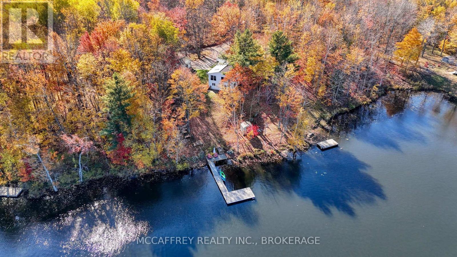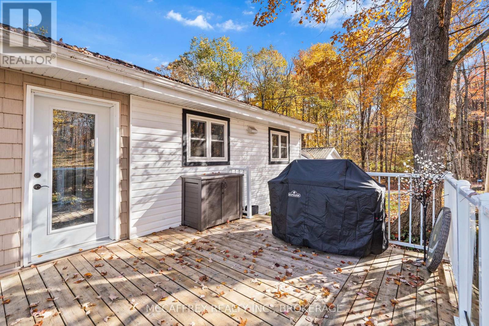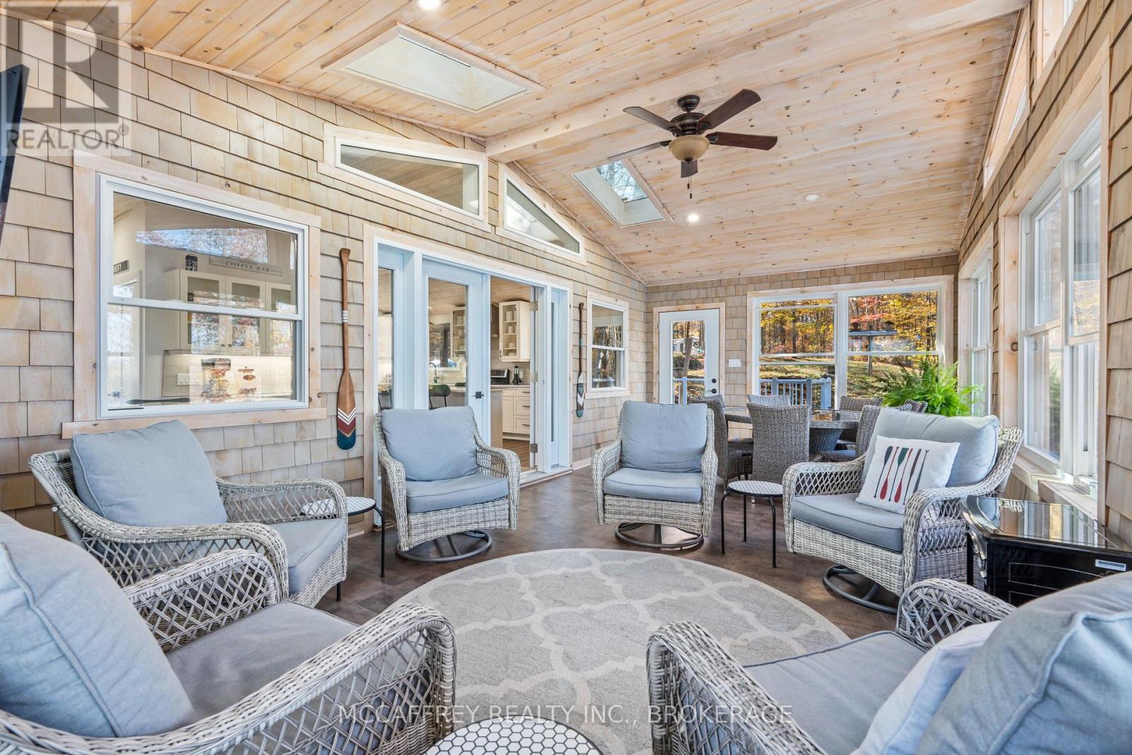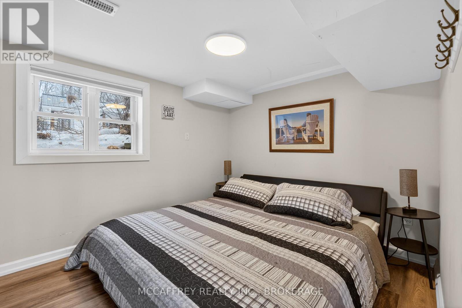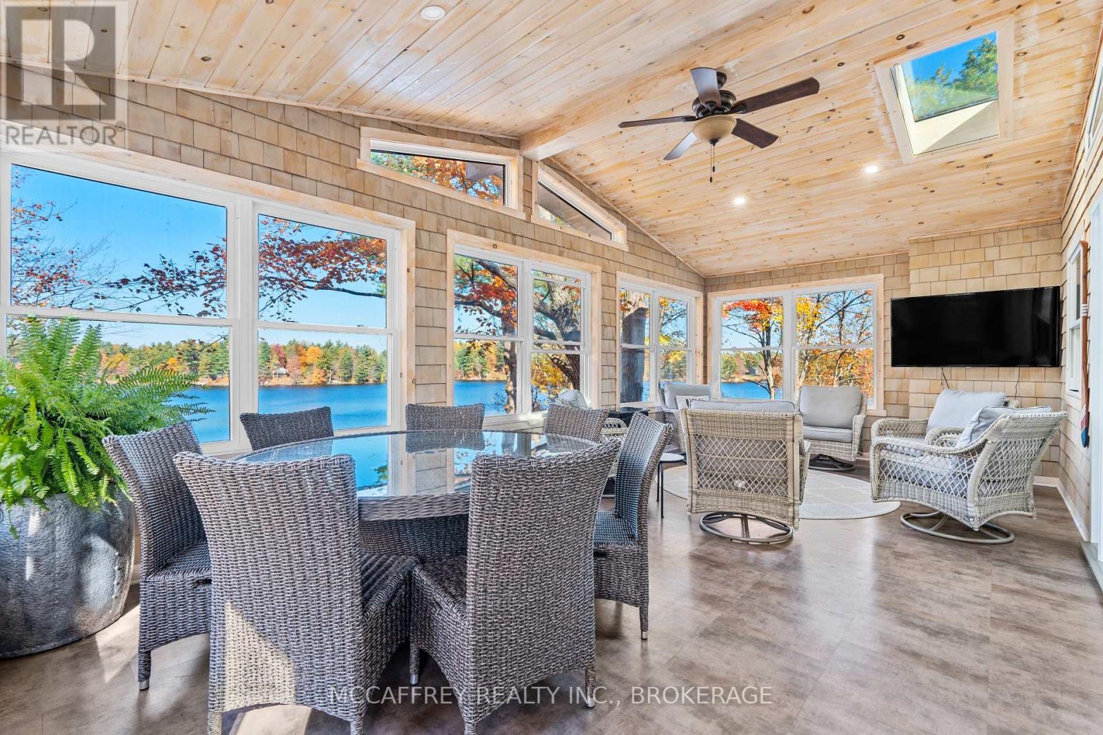 Welcome to your own slice of waterfront paradise on beautiful Elbow Lake. This beautifully updated bungalow sits on just over 140 feet of pristine shoreline, offering peaceful surroundings, mature trees, and stunning water views from nearly every room. Step inside to a gorgeous, fully updated kitchen featuring Quartz countertops, a large island, and ample cupboard space-perfect for entertaining or everyday living. The kitchen flows seamlessly into the spacious three-season sunroom, wrapped in windows that showcase breathtaking views of the lake and filled with natural light. From here, step out onto the deck overlooking the water, an ideal spot for morning coffee or evening sunsets. The main level also offers convenient main floor laundry, a 4-piece bathroom, and comfortable dining and living spaces designed to capture the beauty of the waterfront setting. The primary bedroom is a peaceful retreat, complete with a walk-in closet and private 3-piece ensuite. The fully finished walk-out basement expands the living space with two additional bedrooms, a 2-piece bathroom, and a generous utility room with plenty of storage. Patio doors lead directly outside, making it easy to enjoy the lakefront lifestyle. Outdoors, the property is framed by large mature trees that provide privacy and natural beauty. Enjoy clean, deep water from the brand new dock, perfect for swimming, boating, or simply relaxing by the shore. A convenient bunkie offers additional space for guests, making weekend gatherings and summer visits effortless. Whether you're looking for a year-round home or the perfect waterfront getaway, this exceptional property delivers the ultimate Elbow Lake lifestyle. (id:29295)