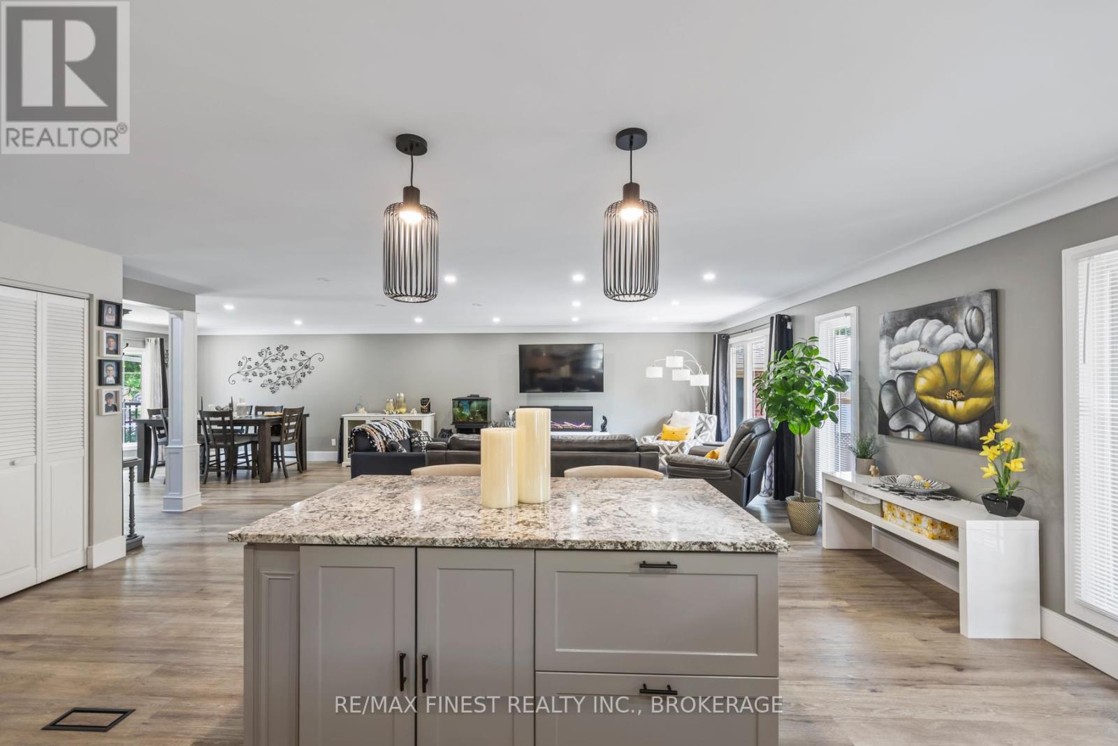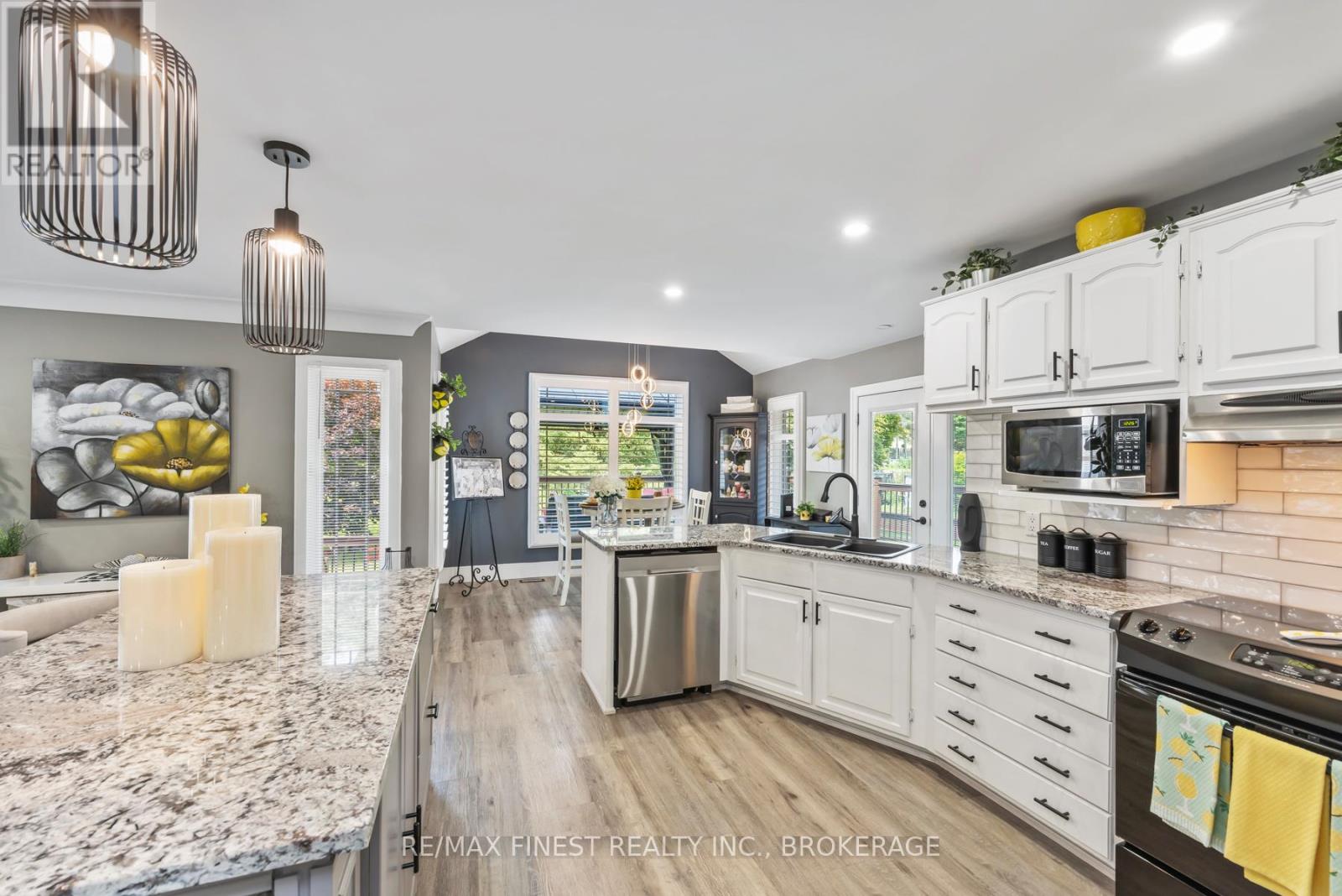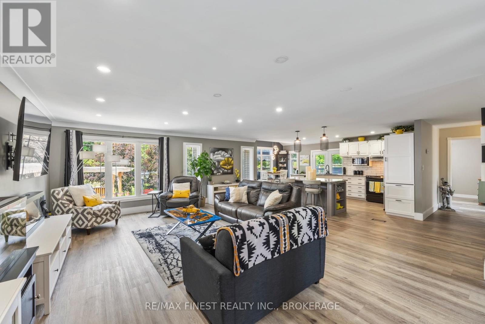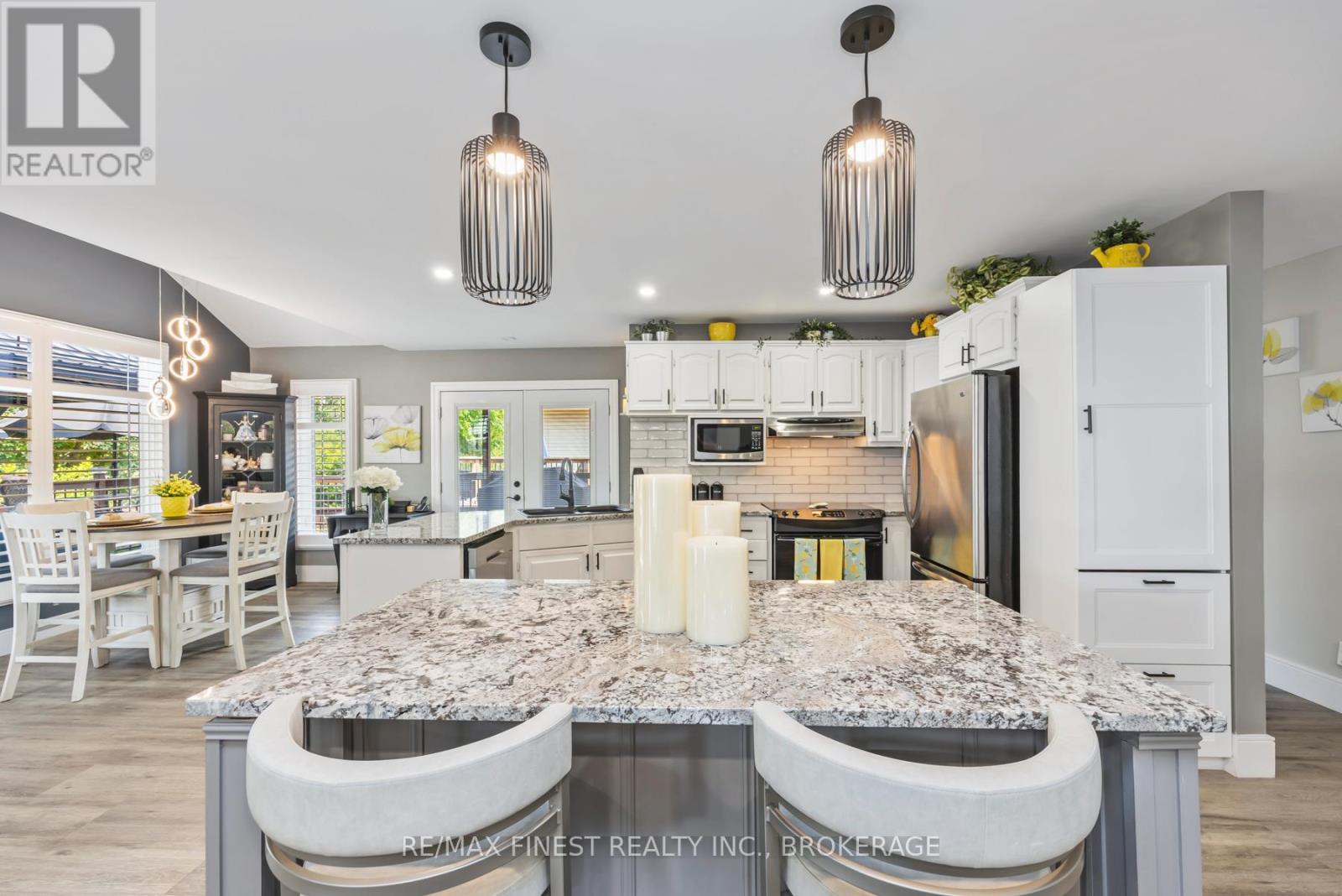 Welcome to this beautifully updated custom built elevated bungalow nestled in one of the areas most sought-after neighborhoods. Thoughtfully renovated from top to bottom, this 3 bedroom plus office, 2.5 bath home perfectly blends modern design with everyday comfort. Step inside to discover a bright, open-concept layout featuring sleek flooring, pot lighting and a chef-inspired kitchen complete with stainless steel appliances, granite countertops and ample cabinetry. The spacious living and dining area is ideal for both entertaining and relaxing, while the large windows with vaulted ceilings offer plenty of natural light. The primary bedroom is a true retreat, showcasing a striking stone accent wall, high ceilings, a spa-like ensuite bath and a generous walk-in closet. Two additional bedrooms on the main floor provide versatility for family, guests, or a home office. The fully finished basement expands your living space with a massive rec-room, an additional office space and a bathroom perfect for a growing family or in-law potential. Outside, you'll find a professionally landscaped oasis with no rear neighbors, offering privacy and tranquility. Enjoy multiple stone patios, lush gardens and a custom outdoor kitchen perfect for hosting summer gatherings or simply unwinding in nature. Located close to top-rated schools, parks, shopping, and all amenities, this home truly offers the best of both indoor luxury and outdoor lifestyle. Don't miss your chance to own this rare gem! (id:29295)