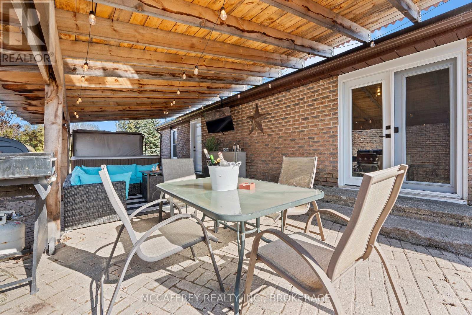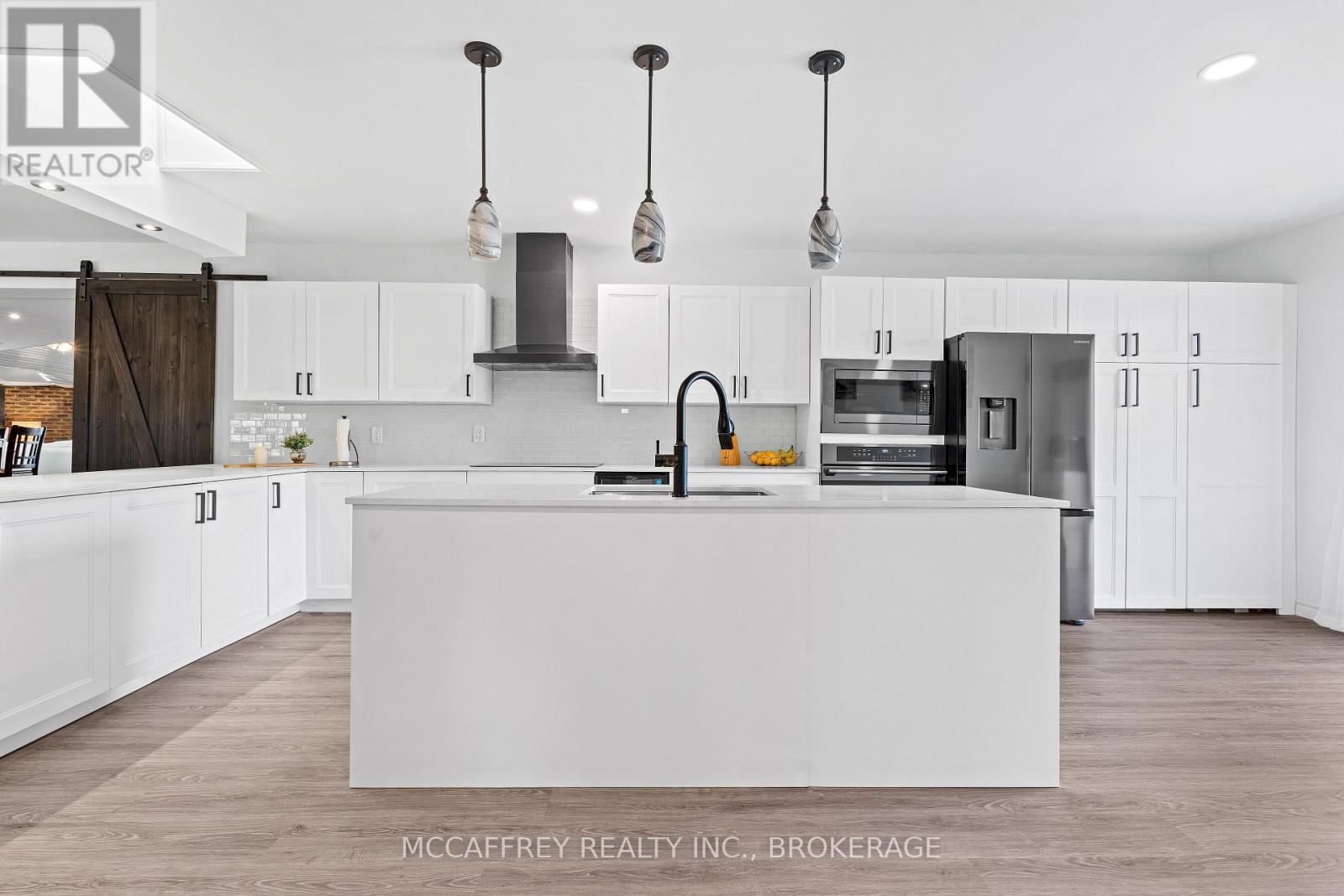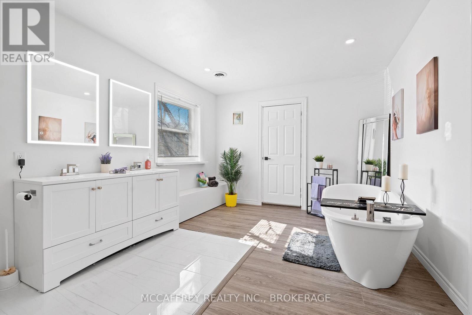 This beautifully updated 4-bedroom, 3-bathroom gem blends modern elegance with homey comfort in a serene neighborhood. Designed with luxury and functionality in mind, this 1.5-story residence is a true find. The spacious kitchen features exquisite quartz countertops and sleek black stainless-steel appliances. Enjoy slow-close drawers with hidden utensil compartments and a built-in garbage/recycling drawer, making it a chefs paradise. Luxury vinyl floors flow through the main living areas, complemented by all-new trim, while updated windows and doors, on the main level, provide abundant natural light. Entertain effortlessly in the large family room with a stylish bar area, perfect for gatherings. Two of the bedrooms boast plush new carpet, offering comfort and warmth. The primary bedroom is a retreat, featuring a lavish 5-piece ensuite with a deep soaker tub, dual waterfall shower heads with handheld attachment, and anti-fog backlit mirrors. Adjacent is a spacious his and hers walk-in closet with motion lighting. The additional 3-piece bathroom offers new flooring and a sleek shower stall for guests convenience. The backyard is a private haven designed for relaxation and entertainment. A beautiful brick privacy wall and pergola create the ideal setting for outdoor dining, while 15 newly planted cedar trees enhance the landscape, providing beauty and privacy.This property combines contemporary upgrades with timeless charm. Don't miss the chance to call this stunning house your home! Updates: Kitchen 2021-2025, Pergola 2022, New carpet in two bedrooms 2025, Main floor windows/doors 2021. (id:29295)