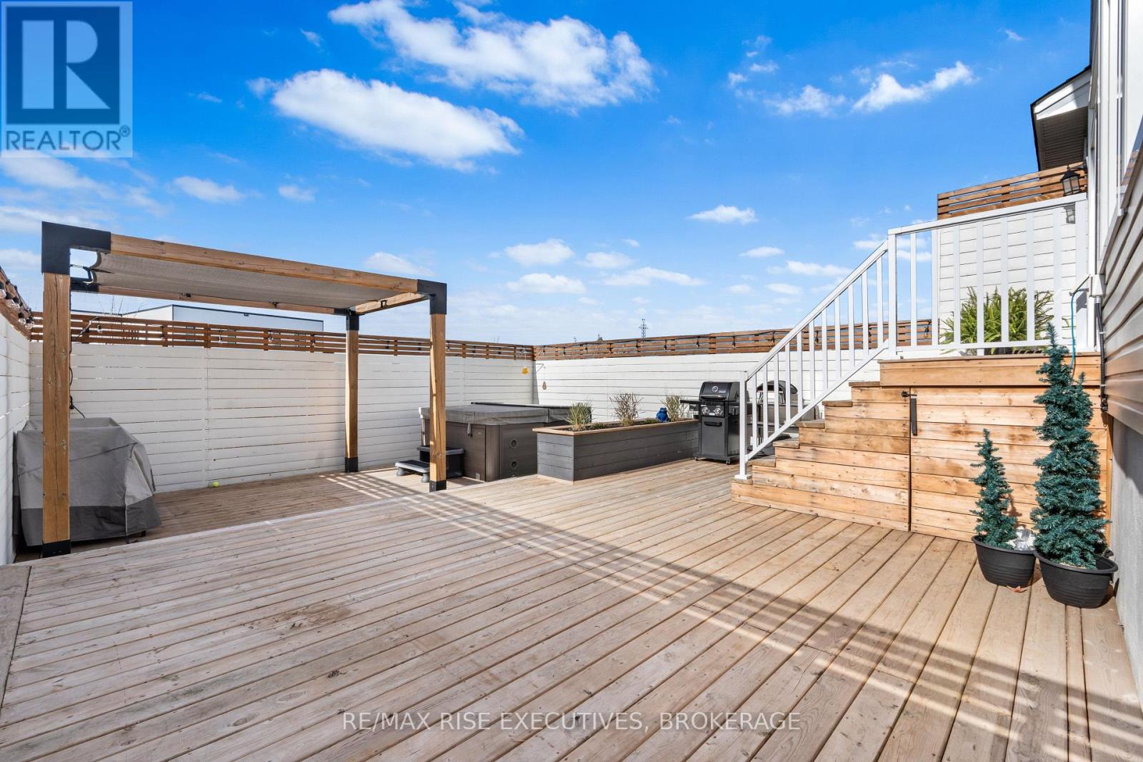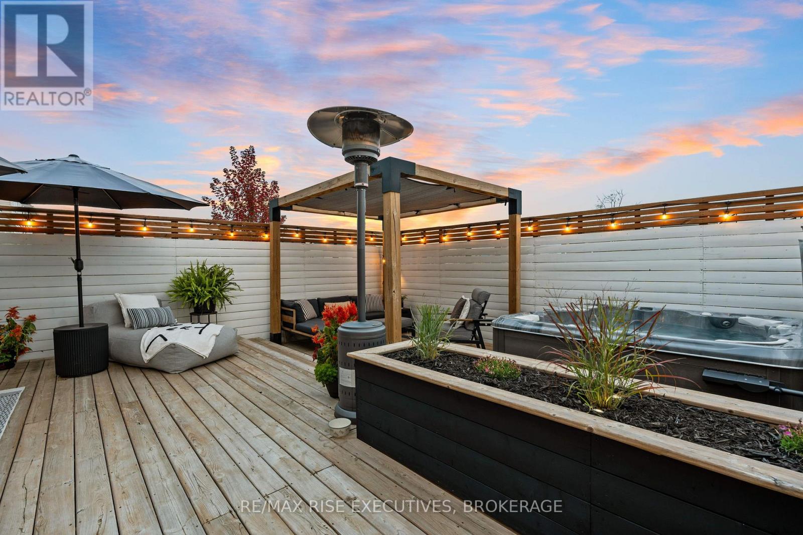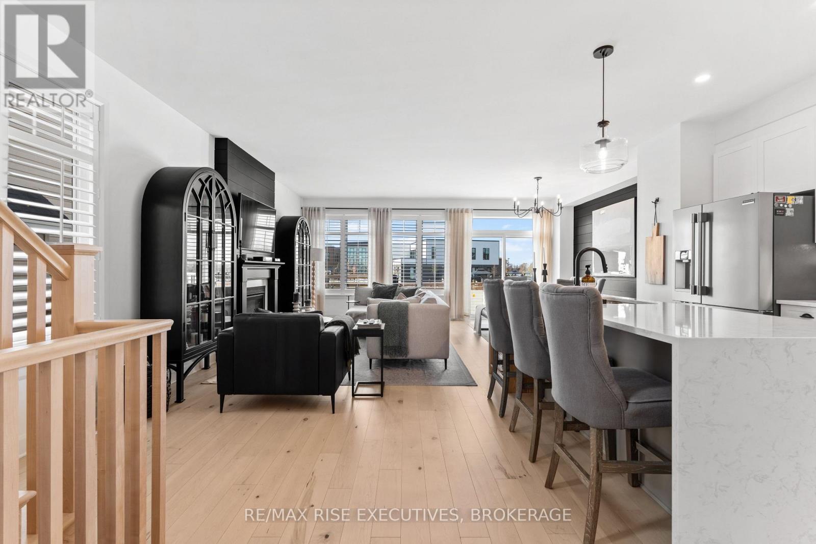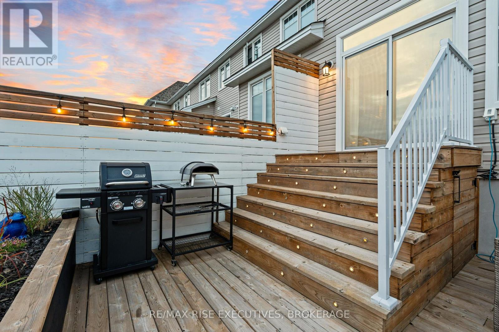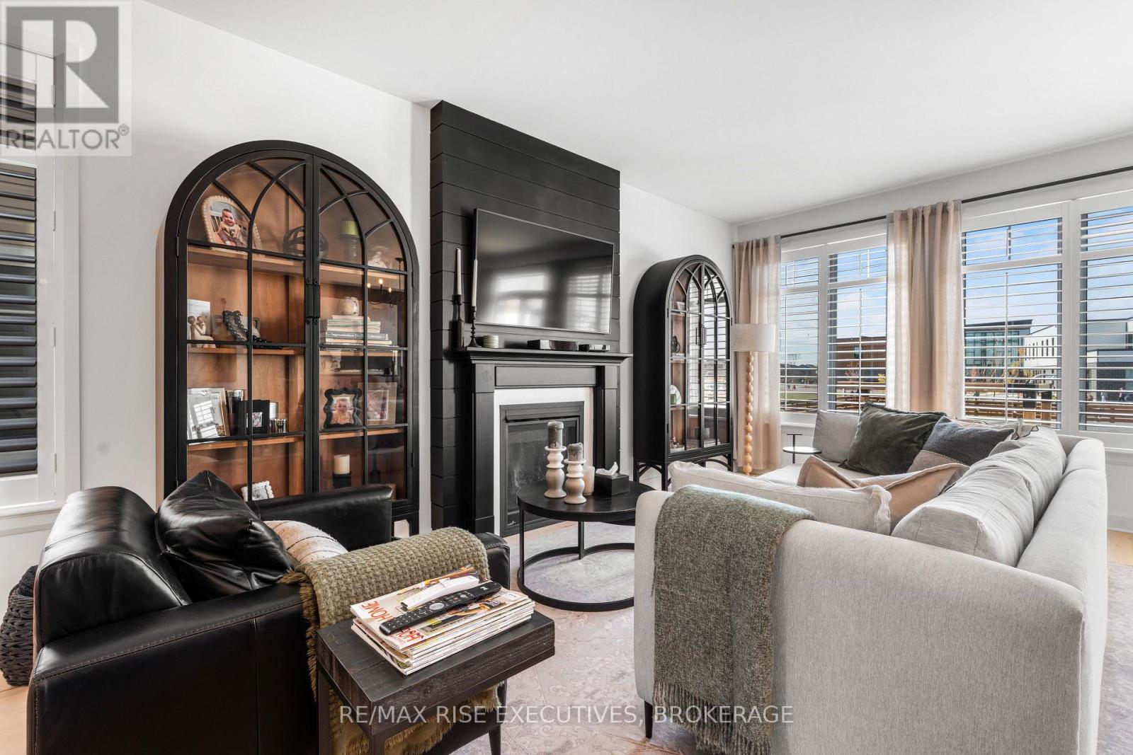 This premium Tamarack residence sits on a standout, fully landscaped lot with patio stone, a custom walkway, and manicured gardens that create an inviting entrance. The backyard is a private retreat with a relaxation hot tub, professional turf for low maintenance, illuminated steps, a raised flower garden, a full fence, and an expansive deck with zones for lounging, dining, entertaining, and storage. With the property backing onto St. Genevieve Catholic School and a new park and walking paths coming soon, this West-End location delivers long-term convenience and family-friendly appeal. Inside, the home showcases quality craftsmanship and a bright, open main level with Maple cabinetry, a custom coffee bar and pantry, quartz countertops, a waterfall island, professional stainless steel appliances, California shutters, and a warm gas fireplace. A beautifully crafted staircase, custom cabinetry, refined finishes, and a stylish powder room elevate the space. The lower level offers a cozy, flexible area for a movie lounge, music space, or children's playroom, plus a rough-in for a future fourth bathroom. Upstairs, the large primary suite features a king-sized layout, walk-in closet, and spa-style ensuite with a soaker tub. A well-designed upper-level laundry room includes quartz counters, a wash sink, cabinets, a folding station, and Electrolux appliances. Two additional bedrooms and a four-piece bath complete this level. With 2,200 sq. ft. of finished living space, upgraded lighting, an extended driveway, full eavestrough system, Celebright exterior lighting, and EV-ready wiring in the garage, this executive townhome blends upscale finishes with modern functionality. A must-see opportunity. (id:29295)