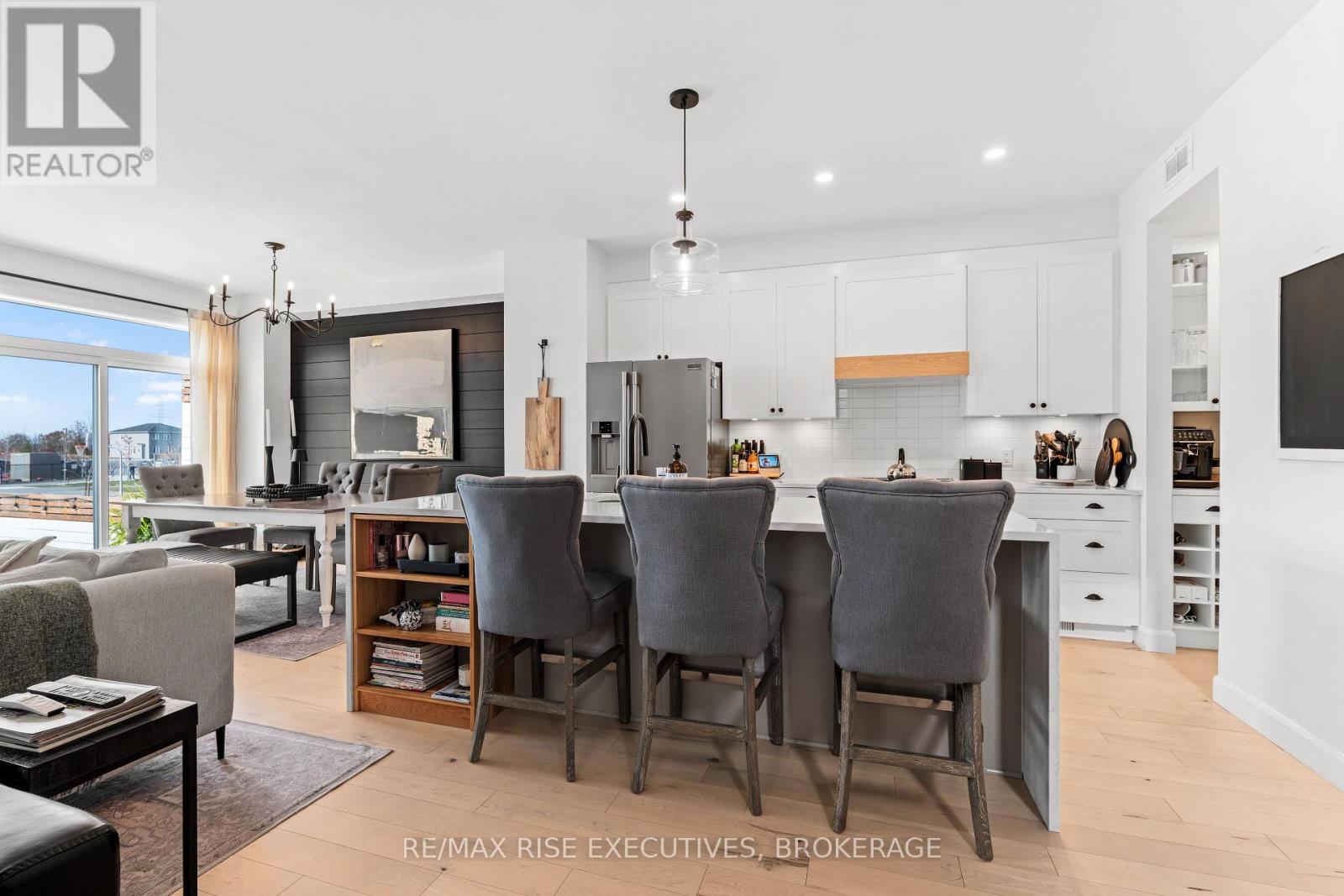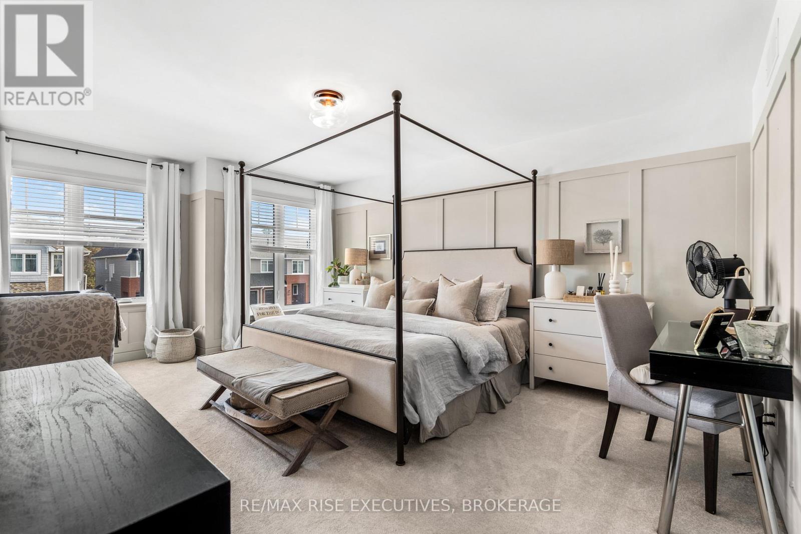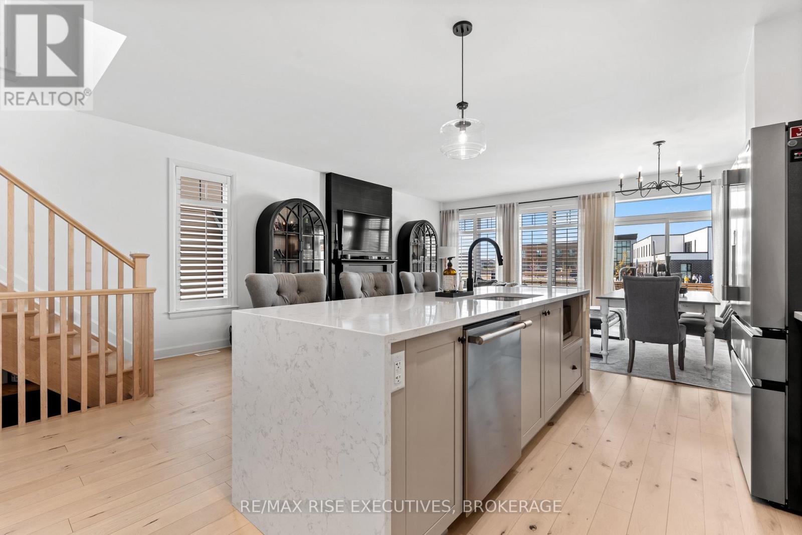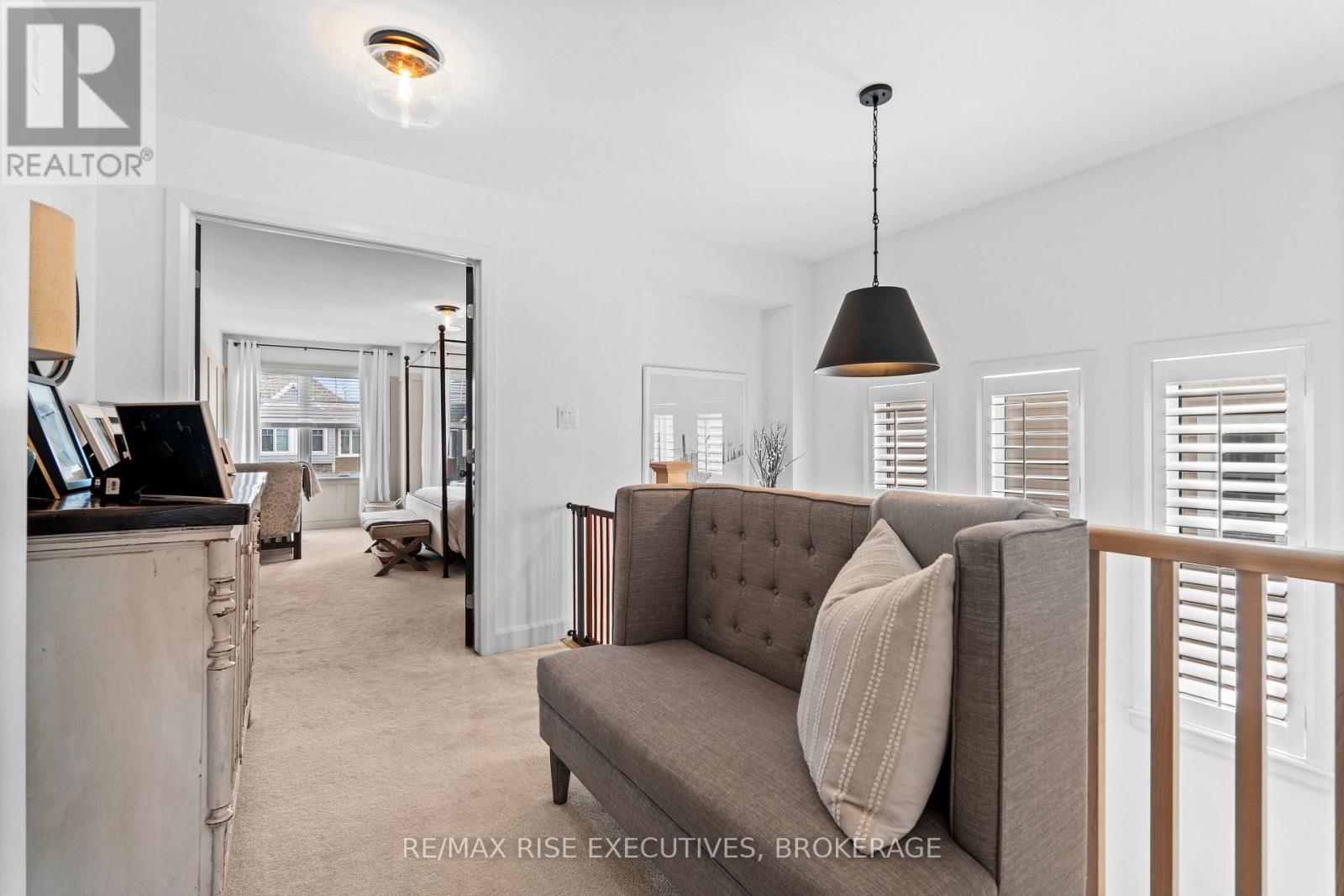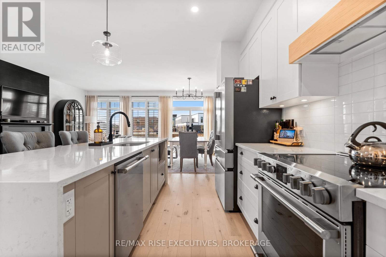 This premium Tamarack residence sits on a standout, fully landscaped lot with patio stone, a custom walkway, and manicured gardens that create an inviting entrance. The backyard is a private retreat with a relaxation hot tub, professional turf for low maintenance, illuminated steps, a raised flower garden, a full fence, and an expansive deck with zones for lounging, dining, entertaining, and storage. With the property backing onto St. Genevieve Catholic School and a new park and walking paths coming soon, this West-End location delivers long-term convenience and family-friendly appeal. Inside, the home showcases quality craftsmanship and a bright, open main level with Maple cabinetry, a custom coffee bar and pantry, quartz countertops, a waterfall island, professional stainless steel appliances, California shutters, and a warm gas fireplace. A beautifully crafted staircase, custom cabinetry, refined finishes, and a stylish powder room elevate the space. The lower level offers a cozy, flexible area for a movie lounge, music space, or children's playroom, plus a rough-in for a future fourth bathroom. Upstairs, the large primary suite features a king-sized layout, walk-in closet, and spa-style ensuite with a soaker tub. A well-designed upper-level laundry room includes quartz counters, a wash sink, cabinets, a folding station, and Electrolux appliances. Two additional bedrooms and a four-piece bath complete this level. With 2,200 sq. ft. of finished living space, upgraded lighting, an extended driveway, full eavestrough system, Celebright exterior lighting, and EV-ready wiring in the garage, this executive townhome blends upscale finishes with modern functionality. A must-see opportunity. (id:29295)