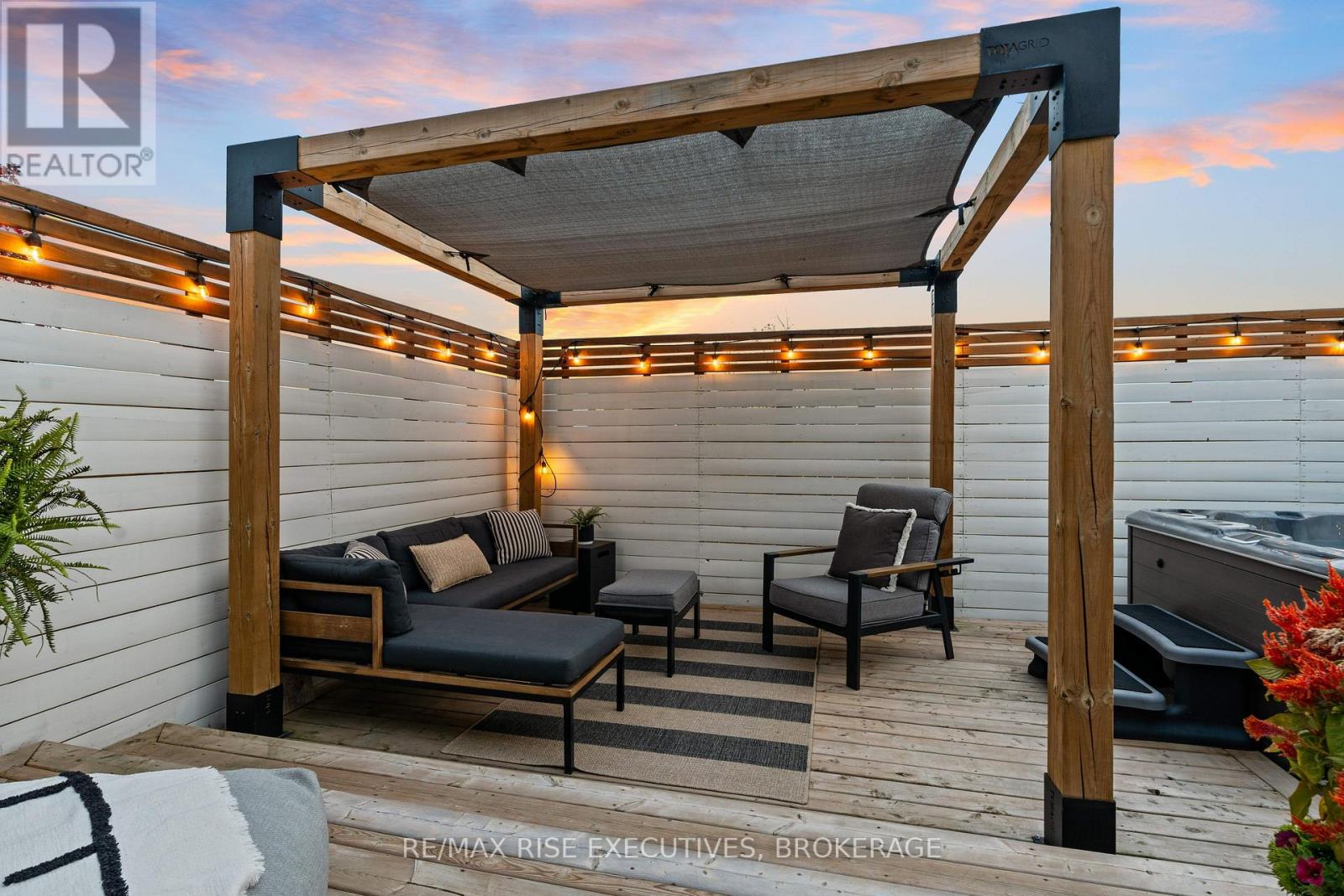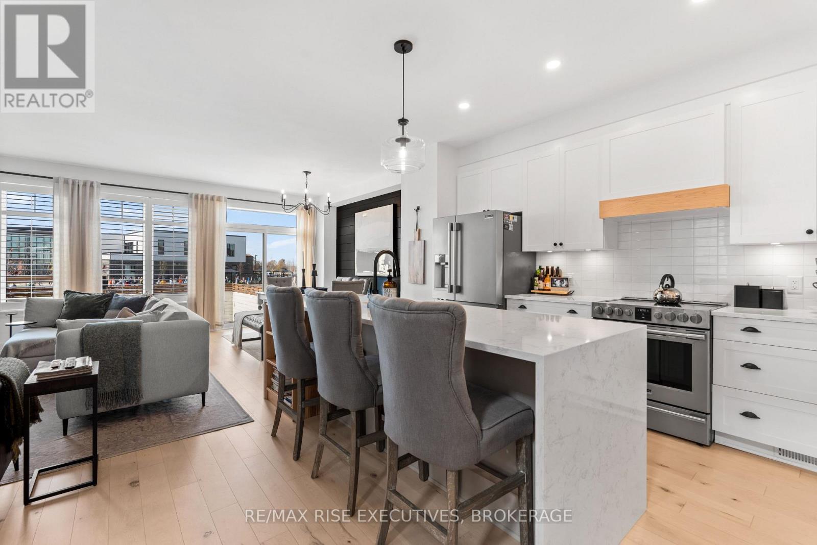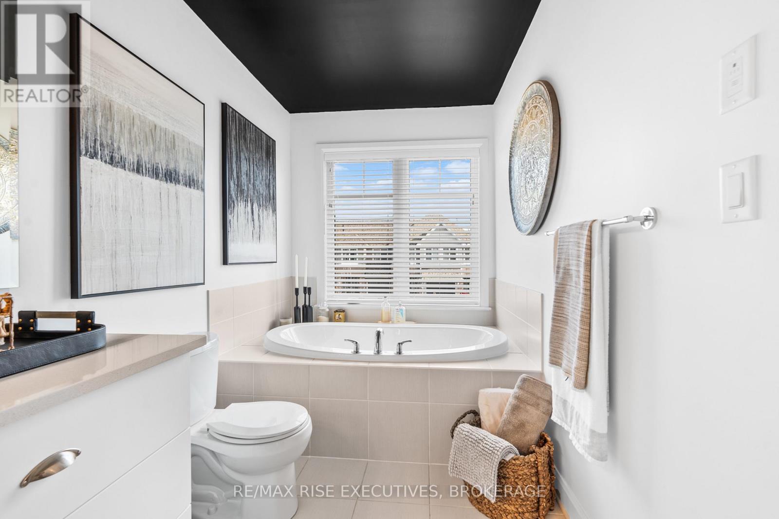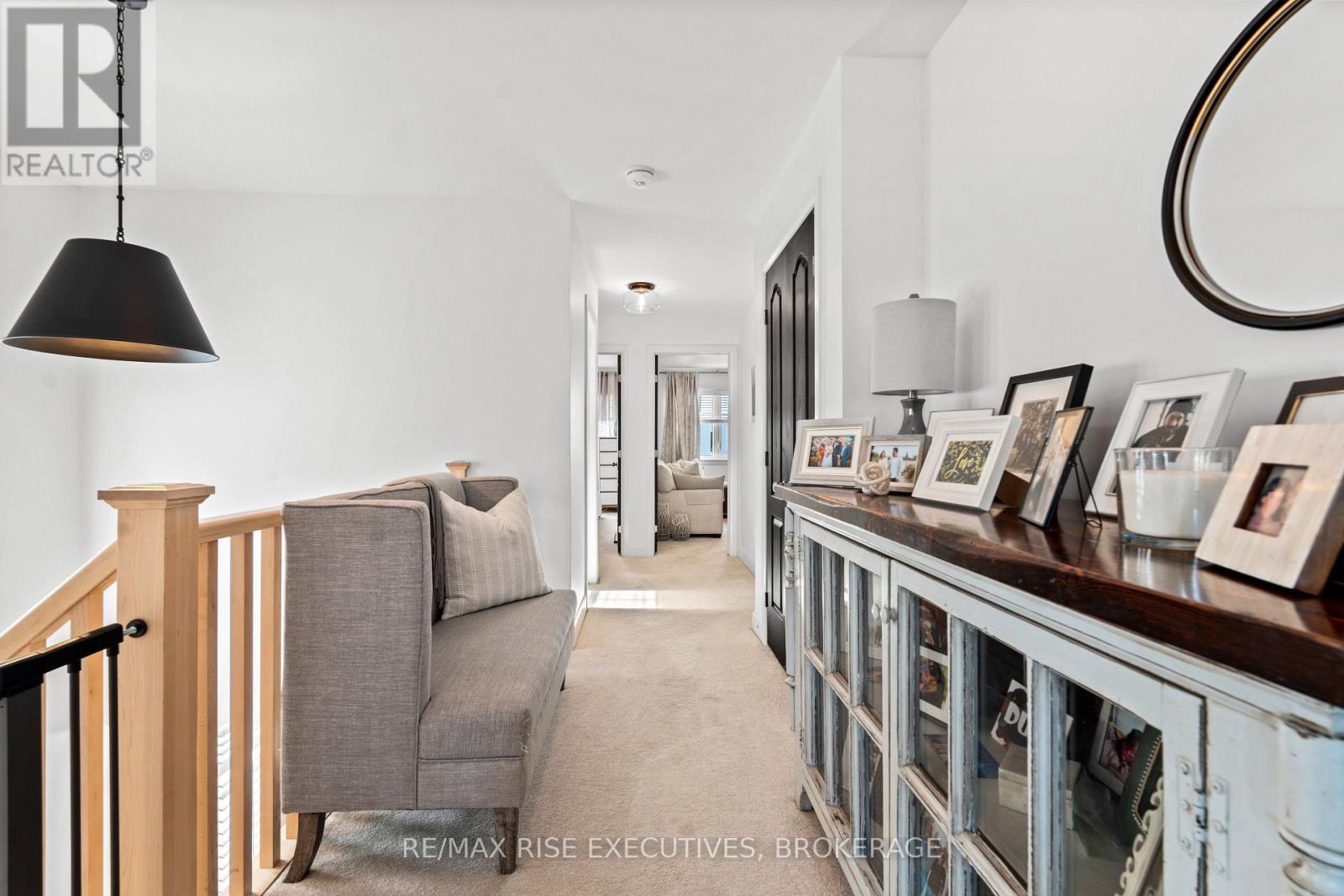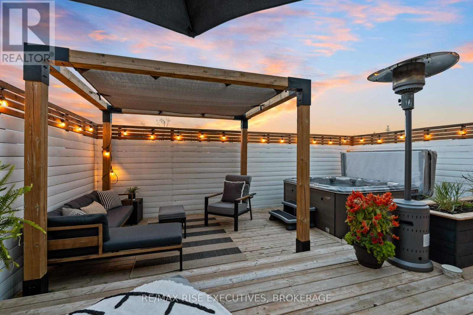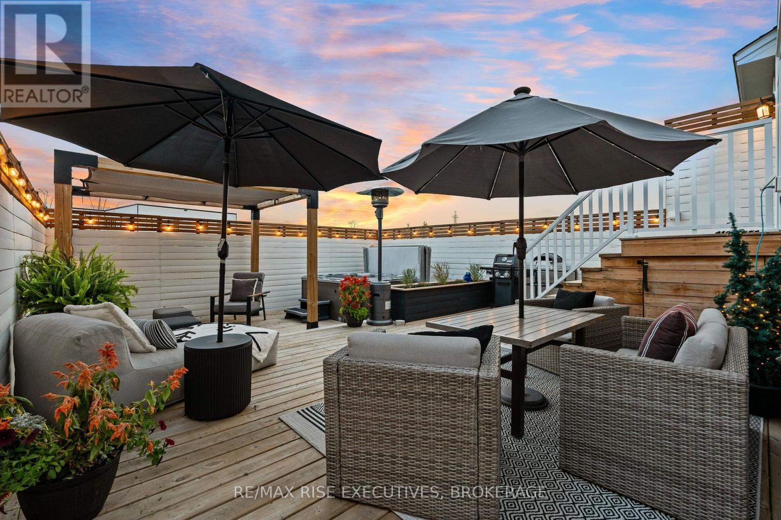This premium Tamarack residence sits on a standout, fully landscaped lot with patio stone, a custom walkway, and manicured gardens that create an inviting entrance. The backyard is a private retreat with a relaxation hot tub, professional turf for low maintenance, illuminated steps, a raised flower garden, a full fence, and an expansive deck with zones for lounging, dining, entertaining, and storage. With the property backing onto St. Genevieve Catholic School and a new park and walking paths coming soon, this West-End location delivers long-term convenience and family-friendly appeal. Inside, the home showcases quality craftsmanship and a bright, open main level with Maple cabinetry, a custom coffee bar and pantry, quartz countertops, a waterfall island, professional stainless steel appliances, California shutters, and a warm gas fireplace. A beautifully crafted staircase, custom cabinetry, refined finishes, and a stylish powder room elevate the space. The lower level offers a cozy, flexible area for a movie lounge, music space, or children's playroom, plus a rough-in for a future fourth bathroom. Upstairs, the large primary suite features a king-sized layout, walk-in closet, and spa-style ensuite with a soaker tub. A well-designed upper-level laundry room includes quartz counters, a wash sink, cabinets, a folding station, and Electrolux appliances. Two additional bedrooms and a four-piece bath complete this level. With 2,200 sq. ft. of finished living space, upgraded lighting, an extended driveway, full eavestrough system, Celebright exterior lighting, and EV-ready wiring in the garage, this executive townhome blends upscale finishes with modern functionality. A must-see opportunity. (id:29295)