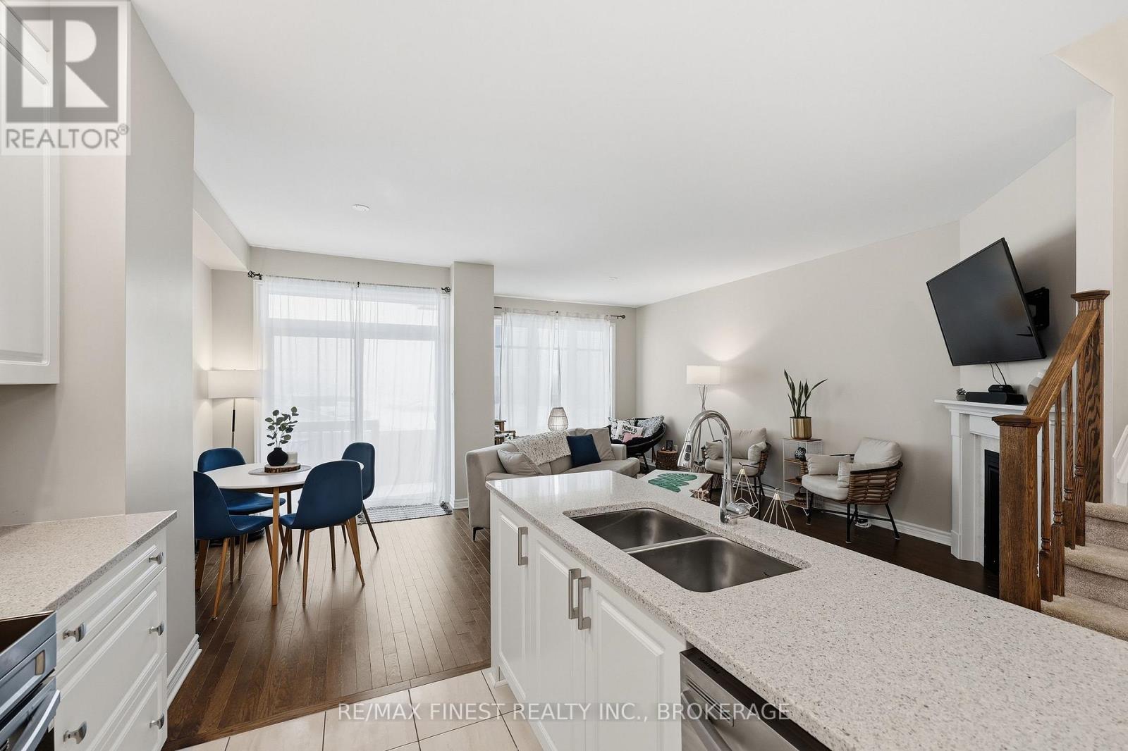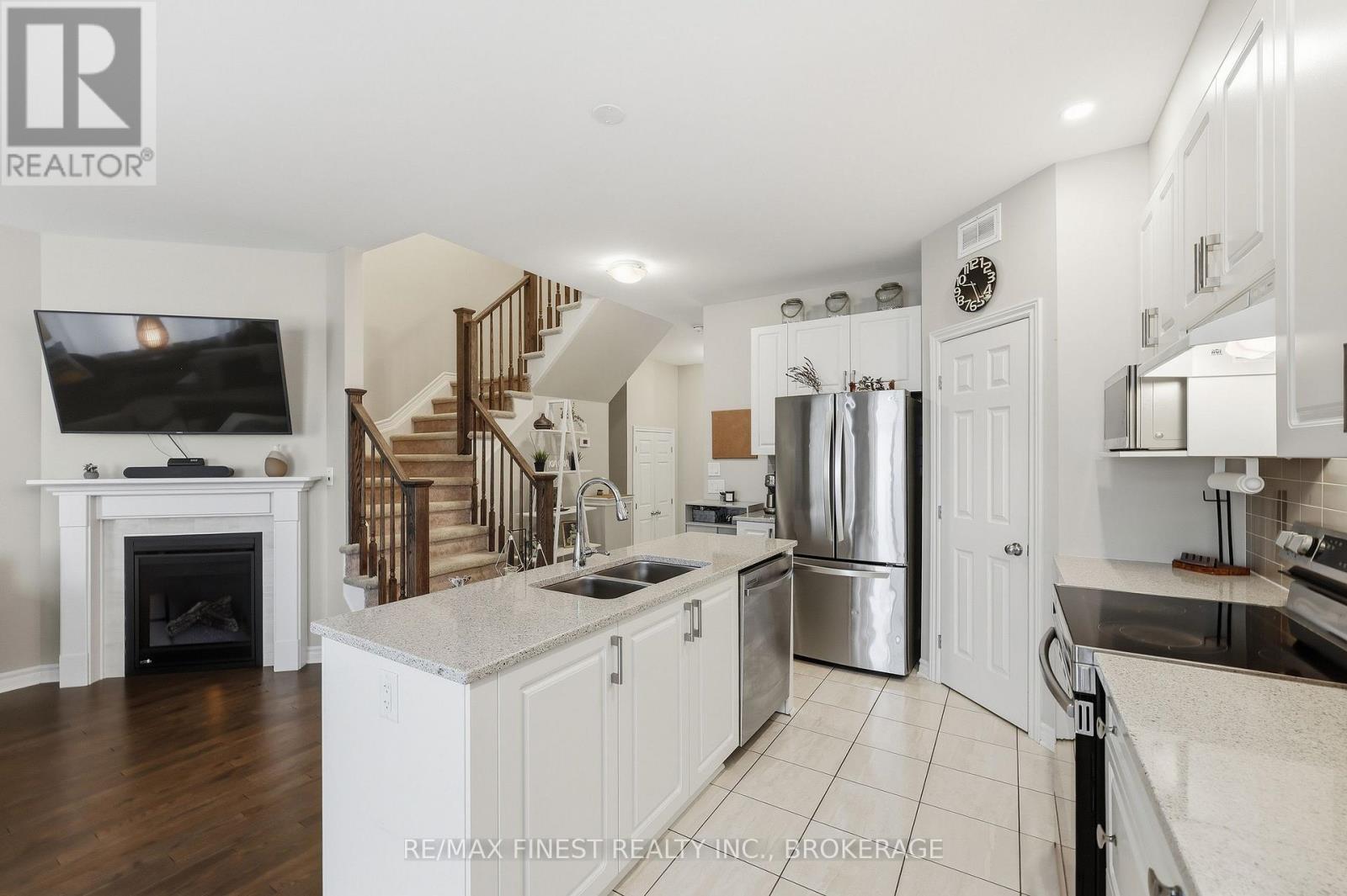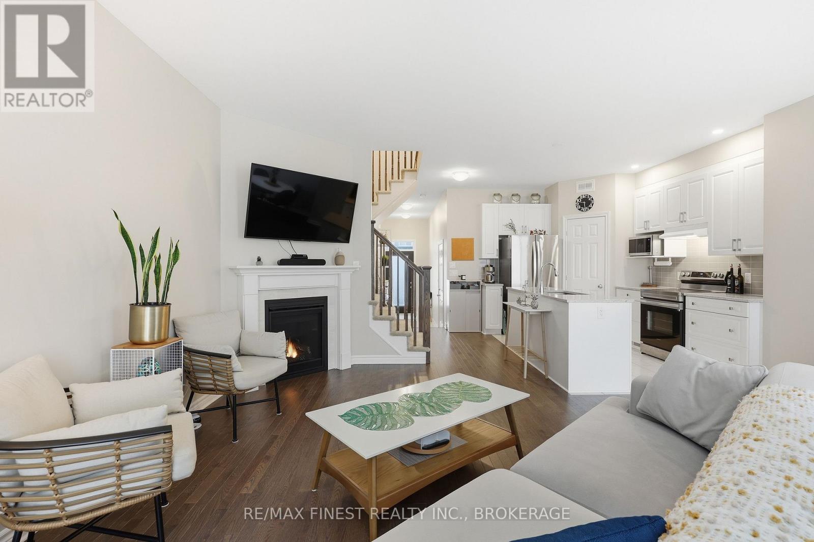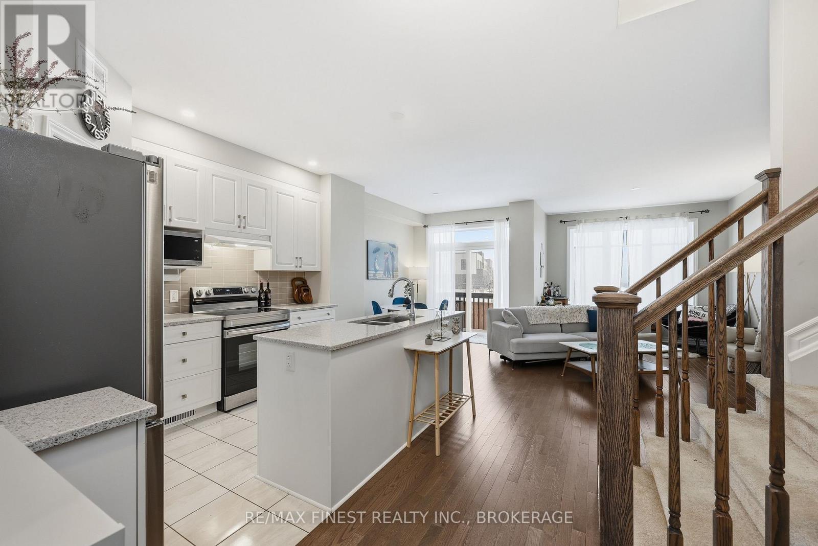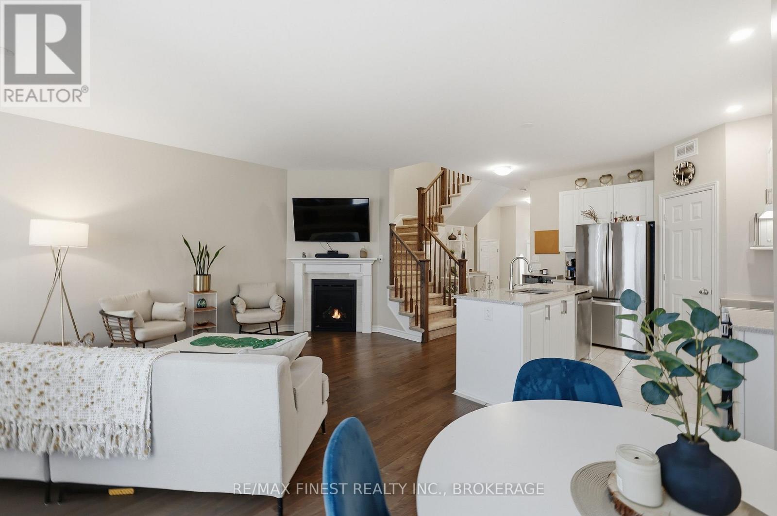 Welcome to this beautifully appointed 3-bedroom, 3-bathroom townhouse located in Kingston's west end. Designed with modern living in mind, this home offers high ceilings and an open-concept layout that's both spacious and inviting. The kitchen features quartz countertops, stainless steel appliances, and a stylish tile backsplash - perfect for everyday cooking or entertaining guests. Hardwood flooring spans the main level, while ceramic tile in all wet areas adds durability and easy maintenance. Relax by the cozy fireplace in the living room, framed by large transom windows and a patio door that flood the space with natural light. Upstairs, you'll find three comfortable bedrooms, including the primary bedroom with 4-piece ensuite, plus you'll enjoy the convenience of upper-level laundry. The finished rec room in the lower level provides added living space ideal for a family room, home gym, or office. Located close to schools, walking paths, west-end shops, and everyday amenities, this home combines comfort, style, and an excellent location. (id:29295)