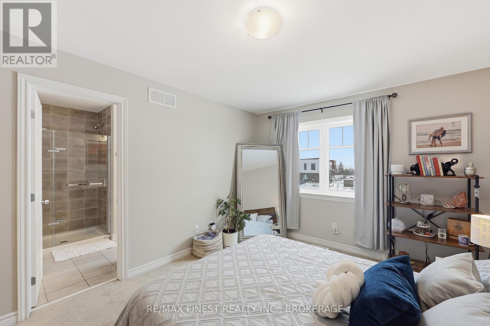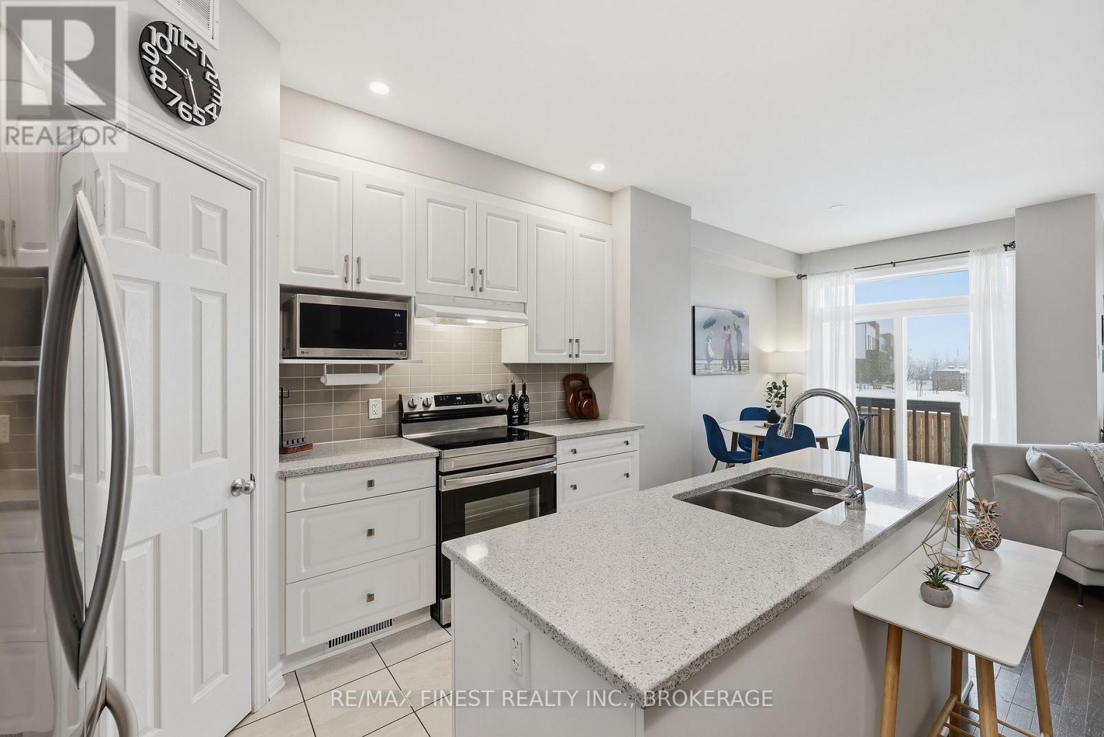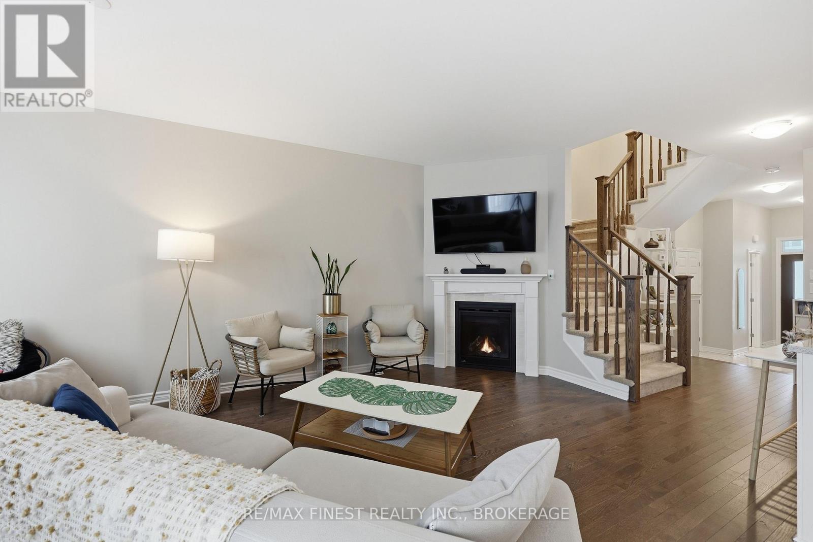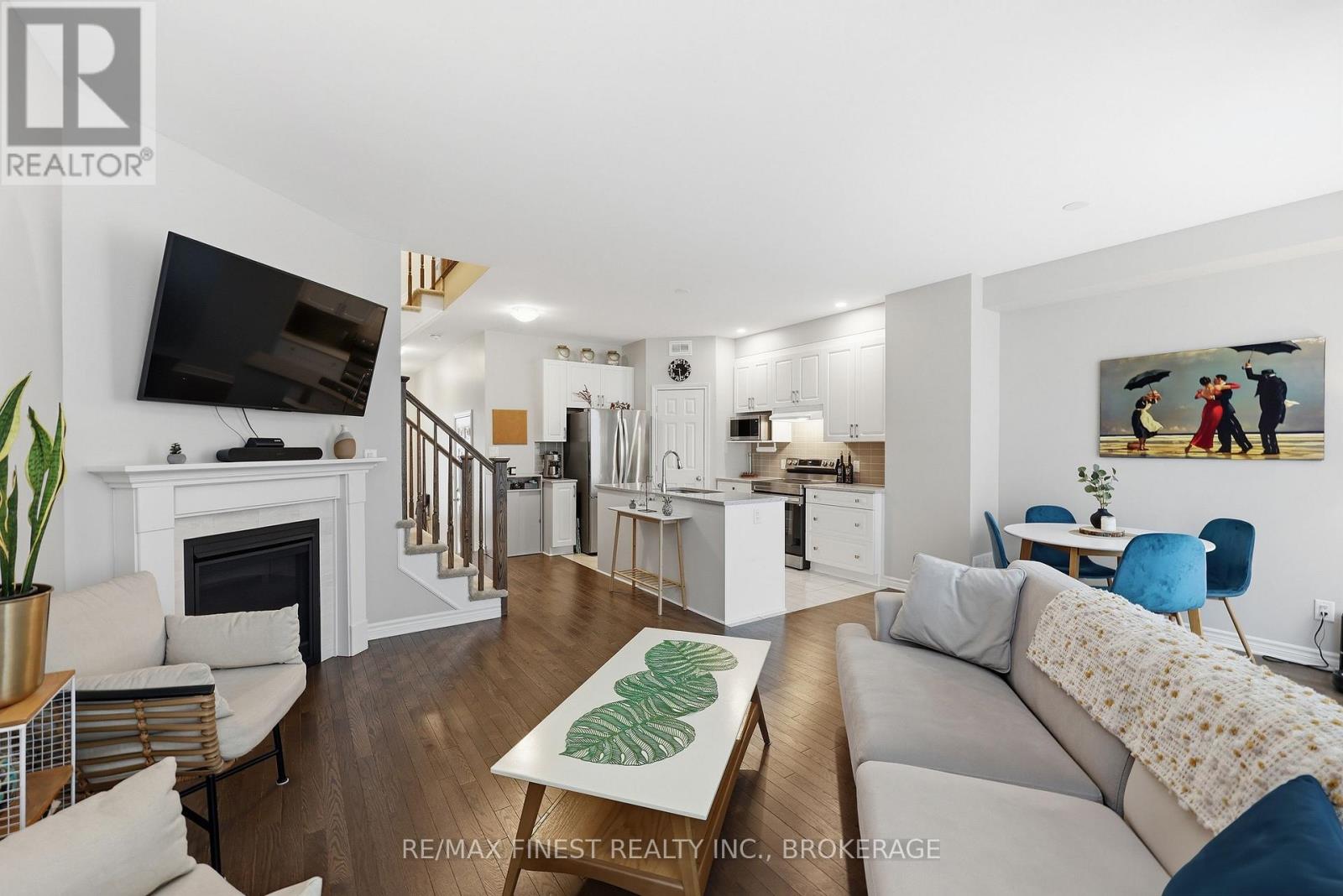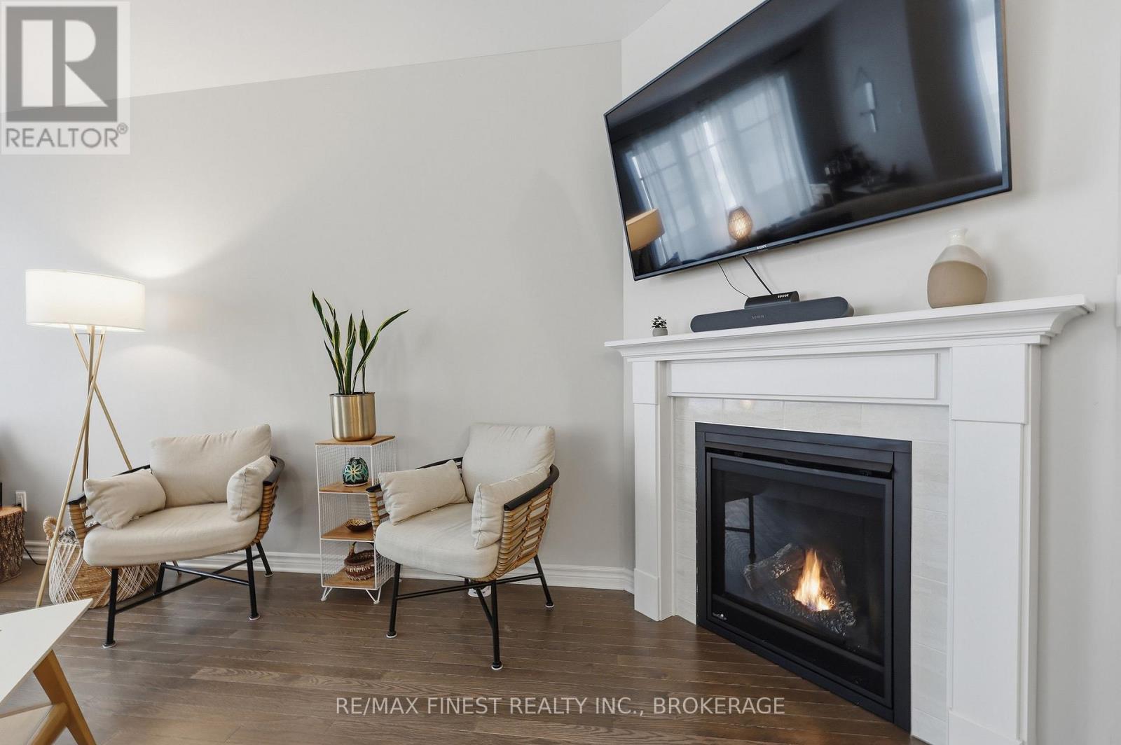Welcome to this beautifully appointed 3-bedroom, 3-bathroom townhouse located in Kingston's west end. Designed with modern living in mind, this home offers high ceilings and an open-concept layout that's both spacious and inviting. The kitchen features quartz countertops, stainless steel appliances, and a stylish tile backsplash - perfect for everyday cooking or entertaining guests. Hardwood flooring spans the main level, while ceramic tile in all wet areas adds durability and easy maintenance. Relax by the cozy fireplace in the living room, framed by large transom windows and a patio door that flood the space with natural light. Upstairs, you'll find three comfortable bedrooms, including the primary bedroom with 4-piece ensuite, plus you'll enjoy the convenience of upper-level laundry. The finished rec room in the lower level provides added living space ideal for a family room, home gym, or office. Located close to schools, walking paths, west-end shops, and everyday amenities, this home combines comfort, style, and an excellent location. (id:29295)
