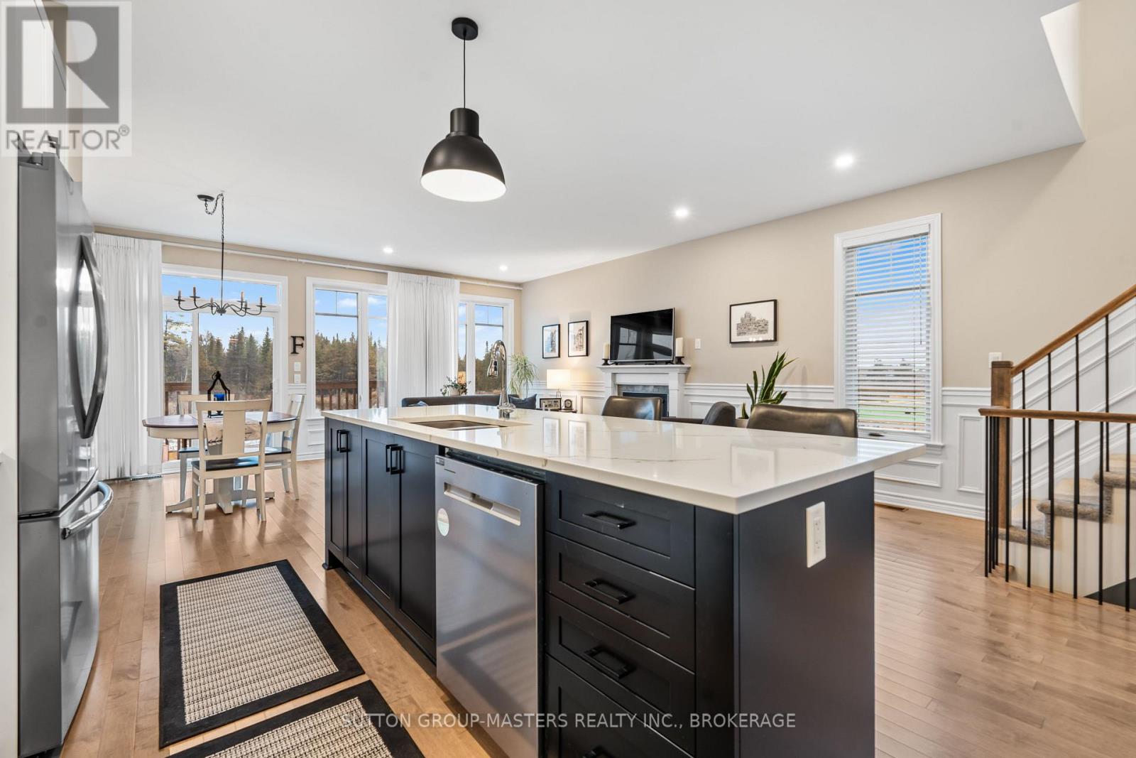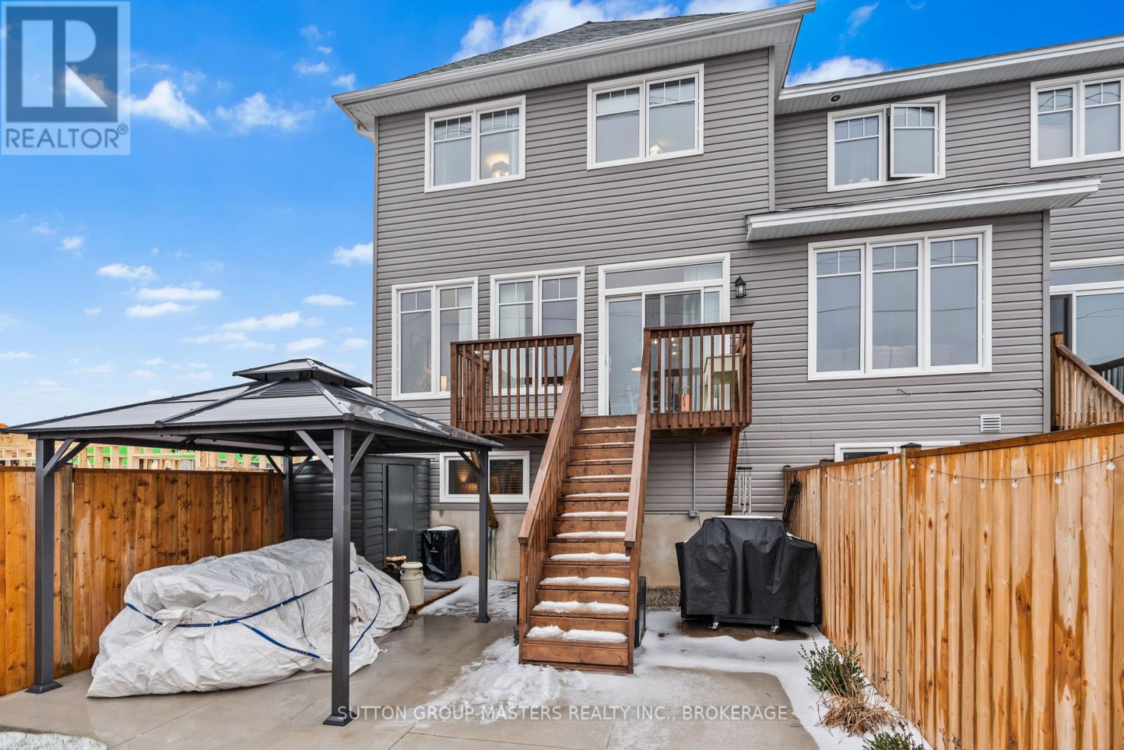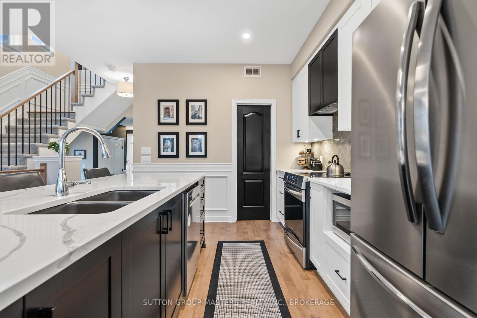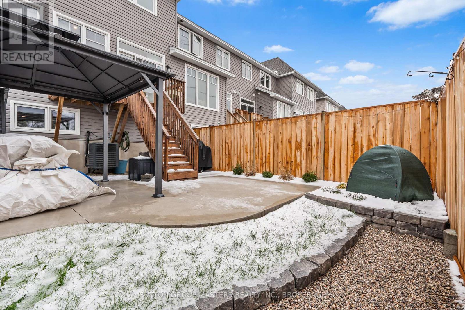 Welcome to 1812 Cinderhill Street - a modern end-unit townhome in Kingston's sought-after Woodhaven neighborhood. This stylish, well-designed home combines comfort, convenience, and family living from the moment you step onto the inviting front porch. Inside, you'll find a bright, open-concept main floor with large windows, custom drapery, and seamless flow between the living, dining, and kitchen areas - perfect for entertaining or relaxing at home. The kitchen features upgraded cabinetry, quartz countertops, a walk-in pantry, generous island, and premium stainless-steel appliances (fridge, stove, microwave, dishwasher). A convenient powder room completes the main level. Upstairs, the spacious primary suite includes a large walk-in closet and a private ensuite with a soaker tub and glass-door shower. Two additional bedrooms, a full main bath AND an upper level laundry with washer and dryer, offer plenty of space for family or guests. The fully finished basement adds versatility with a rec room that's ideal for a home office, gym, or play area. Step outside to your private backyard retreat featuring a patio, gazebo - a great spot for barbecues or quiet evenings outdoors. Additional highlights include a private driveway, attached garage wired for an EV charger, permanently installed Celebright holiday lights, and eavestroughs. Located in a newer west-end subdivision, this home is within walking distance of St. Genevieve Catholic Elementary School, and close to parks, walking paths, shopping, and major commuter routes. With its contemporary finishes, energy-efficient systems, and move-in-ready condition, 1812 Cinderhill Street offers the perfect balance of community and convenience. Call for your personal showing today. (id:29295)