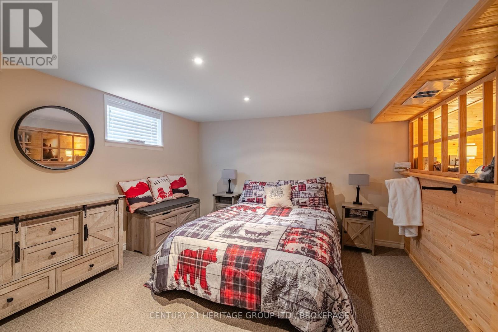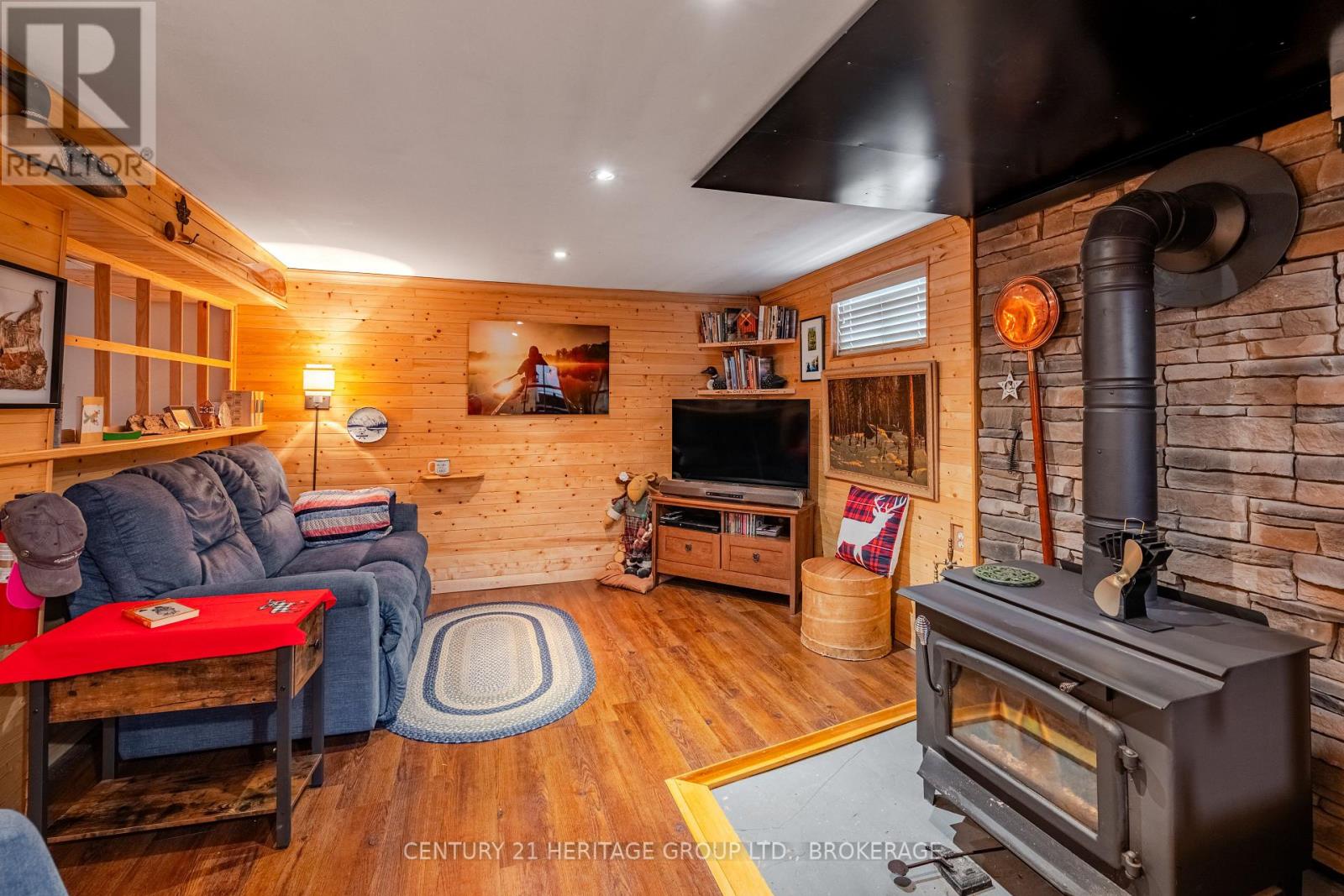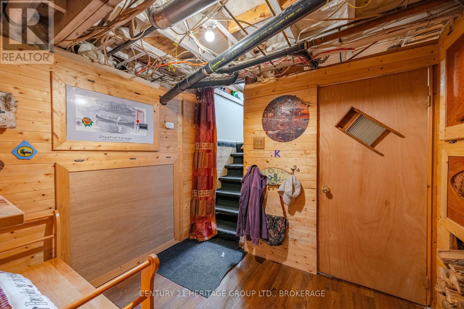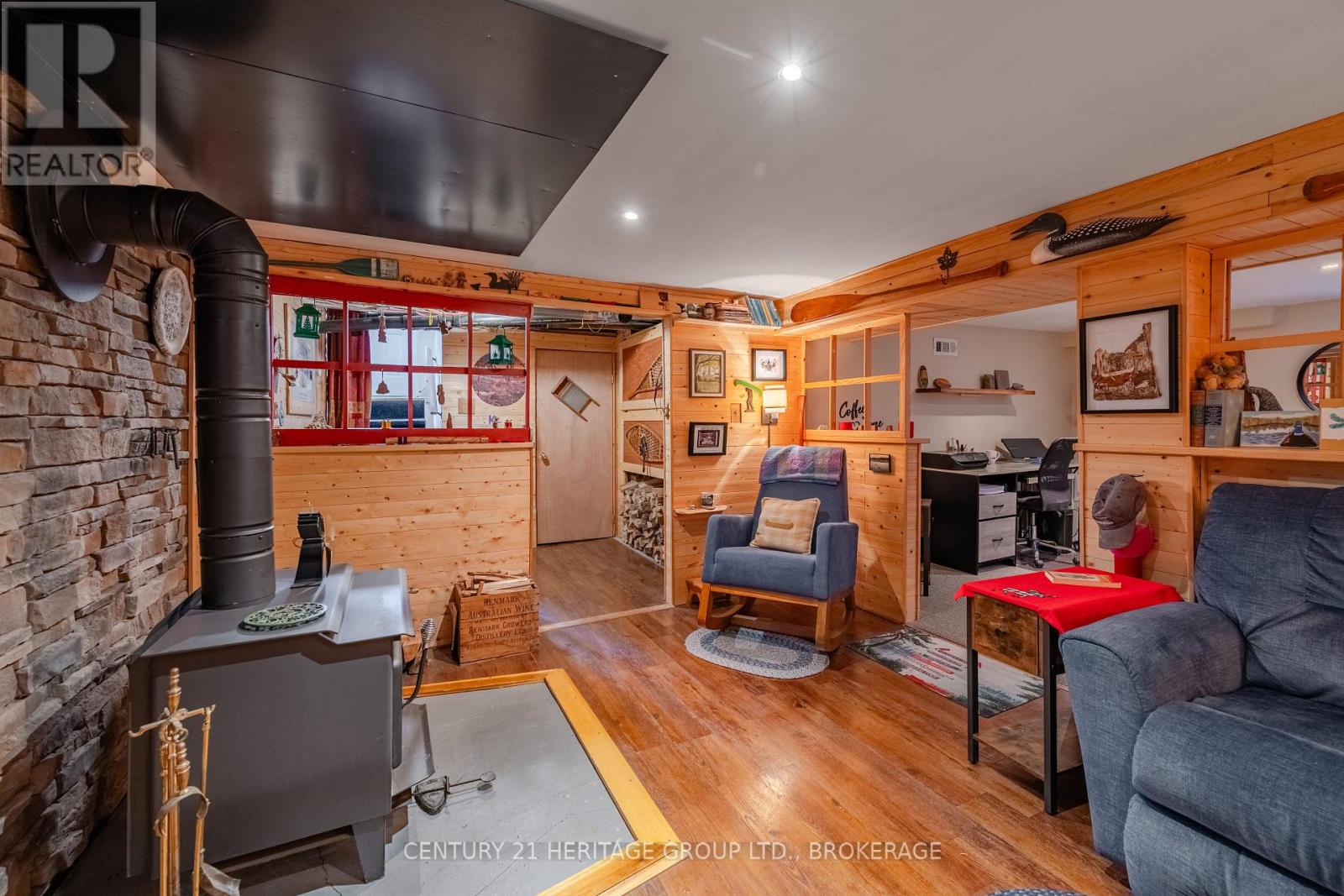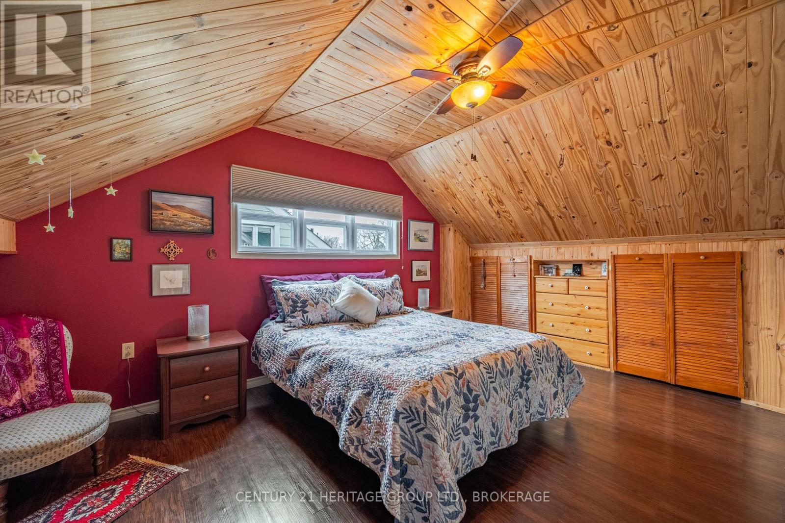 If I got excited about every house, I'd be nothing more than a puddle by now, or one of those little dogs that runs into walls. Luckily, I've learned to ration my enthusiasm, to save it up like pocket money, waiting for the right place to spend big. 19 Fifth Avenue, plum centre of Kingscourt and close to the parks and allotments, churches and the high school, is an early 2026 standout. From its last-forever and forest-green metal roof, to its lower level Muskoka cottage set-up, as convincing as a movie set, this detached and brilliant home is just slightly different from anything I've seen before in the neighbourhood. The renovations are unusually comprehensive and take in both infrastructure and energy-efficiency (insulation, vinyl siding, furnace, AC) and aesthetics (bathrooms, luxury vinyl flooring, stainless steel appliances, windows); it's a long list, much longer than I'm letting on. The feeling is of a home in need of nothing but your company. There are two bedrooms upstairs, and the bigger of the two (with its vaulted ceiling, its clerestory window) is lined with pine and feels like a sanctuary, a secluded haven from the daily grind. There is a third bedroom on the main level, and if you need a fourth, then it's already set up for you in the basement, one room over from the woodstove. The re-done kitchen is spacious enough for your dining table and your nightly catch-ups. The idea is that you could have a family at 19 Fifth and not do a thing, just send the kids on foot to school and pass the evenings sitting on the swing-chair that hangs out front all summer like a local landmark. The garage (how did I forget the adorable, low-slung period garage?) contains a workshop off to one side, and the garden it sits in is, for want of a better word, simply splendid (check out the summer photos). (id:29295)