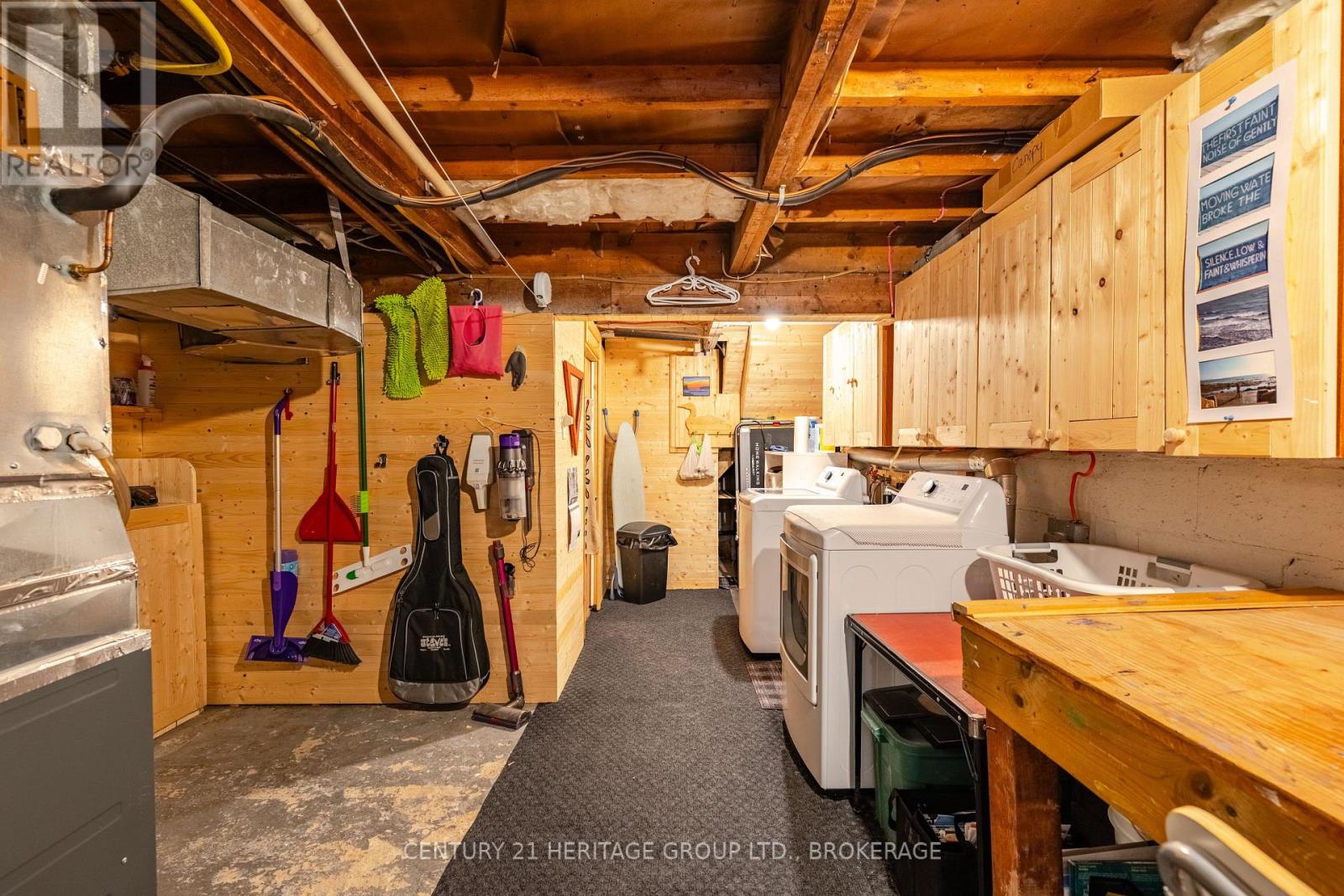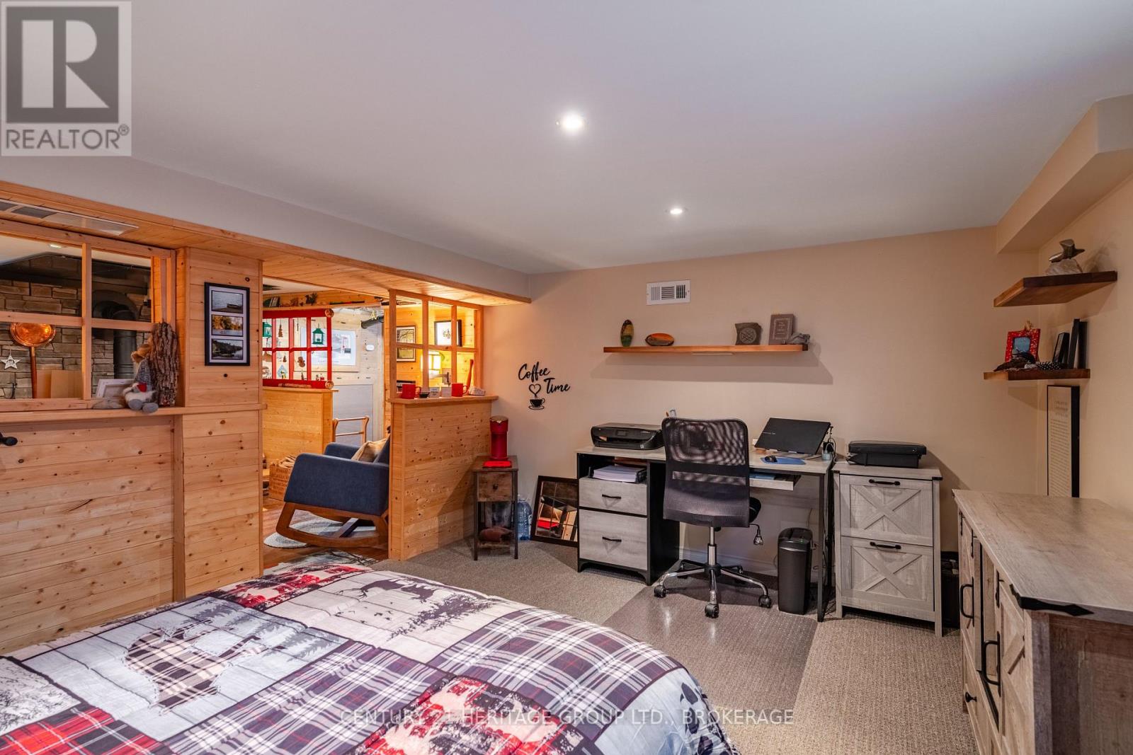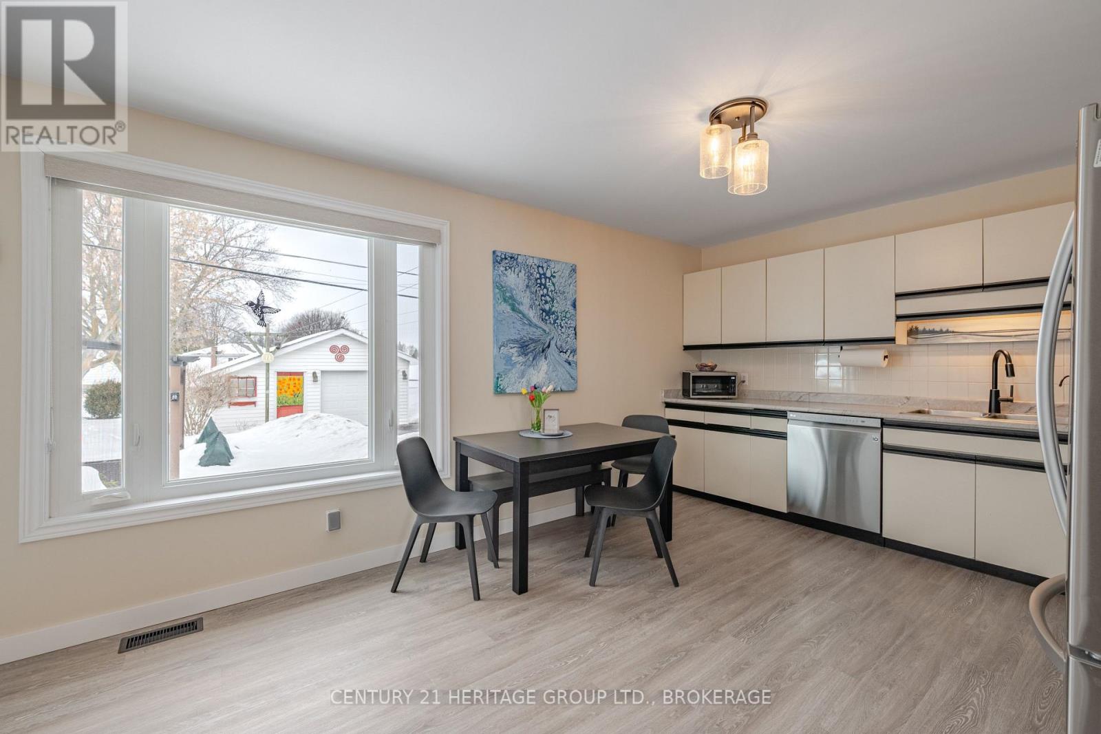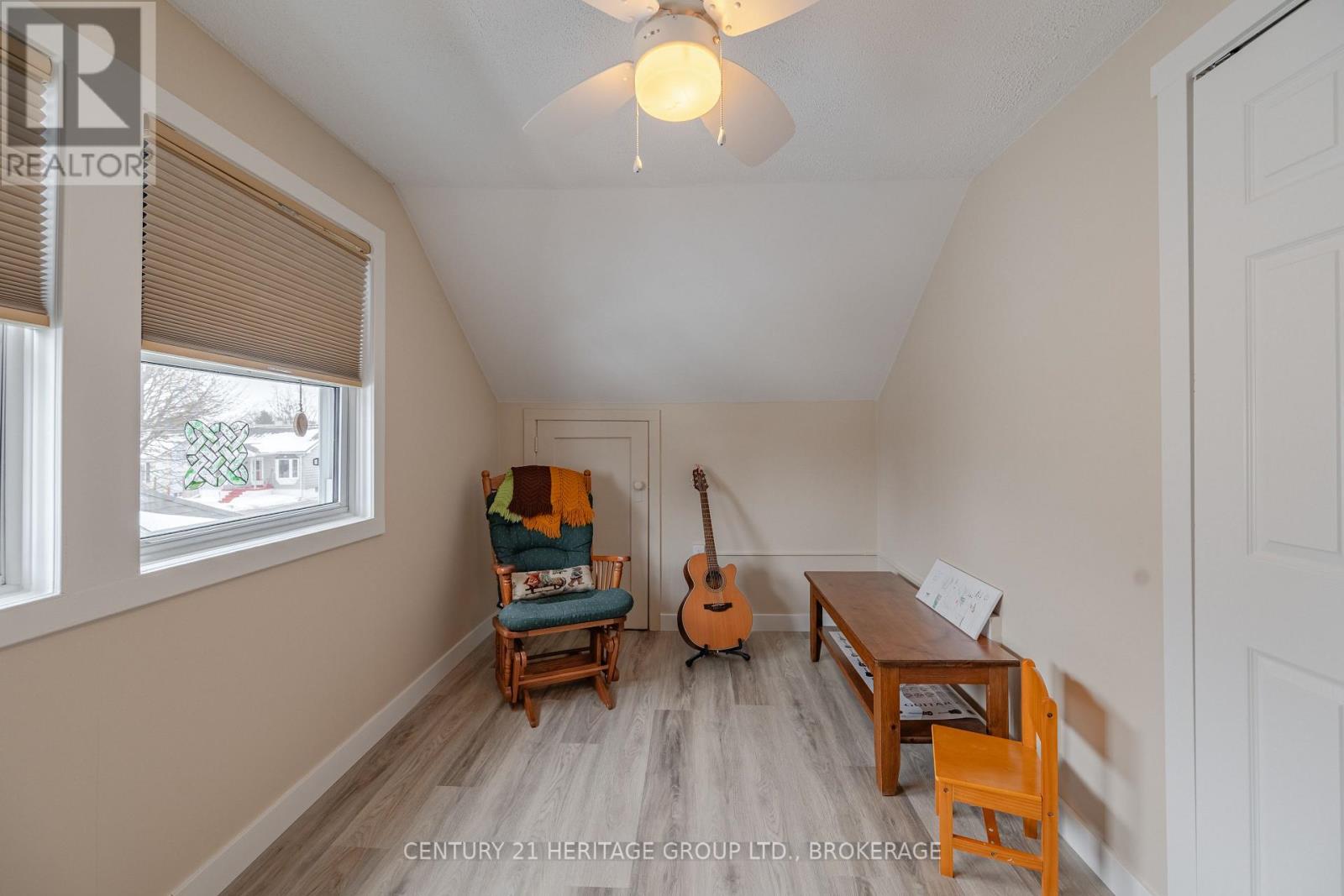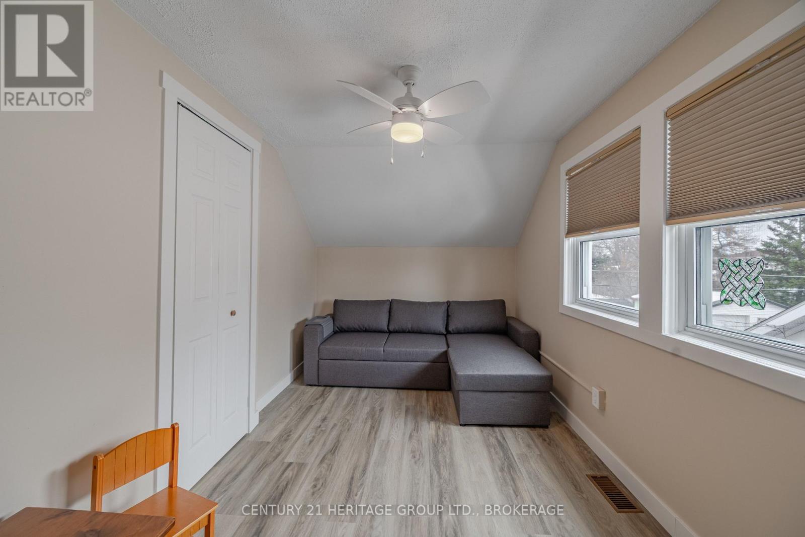 If I got excited about every house, I'd be nothing more than a puddle by now, or one of those little dogs that runs into walls. Luckily, I've learned to ration my enthusiasm, to save it up like pocket money, waiting for the right place to spend big. 19 Fifth Avenue, plum centre of Kingscourt and close to the parks and allotments, churches and the high school, is an early 2026 standout. From its last-forever and forest-green metal roof, to its lower level Muskoka cottage set-up, as convincing as a movie set, this detached and brilliant home is just slightly different from anything I've seen before in the neighbourhood. The renovations are unusually comprehensive and take in both infrastructure and energy-efficiency (insulation, vinyl siding, furnace, AC) and aesthetics (bathrooms, luxury vinyl flooring, stainless steel appliances, windows); it's a long list, much longer than I'm letting on. The feeling is of a home in need of nothing but your company. There are two bedrooms upstairs, and the bigger of the two (with its vaulted ceiling, its clerestory window) is lined with pine and feels like a sanctuary, a secluded haven from the daily grind. There is a third bedroom on the main level, and if you need a fourth, then it's already set up for you in the basement, one room over from the woodstove. The re-done kitchen is spacious enough for your dining table and your nightly catch-ups. The idea is that you could have a family at 19 Fifth and not do a thing, just send the kids on foot to school and pass the evenings sitting on the swing-chair that hangs out front all summer like a local landmark. The garage (how did I forget the adorable, low-slung period garage?) contains a workshop off to one side, and the garden it sits in is, for want of a better word, simply splendid (check out the summer photos). (id:29295)