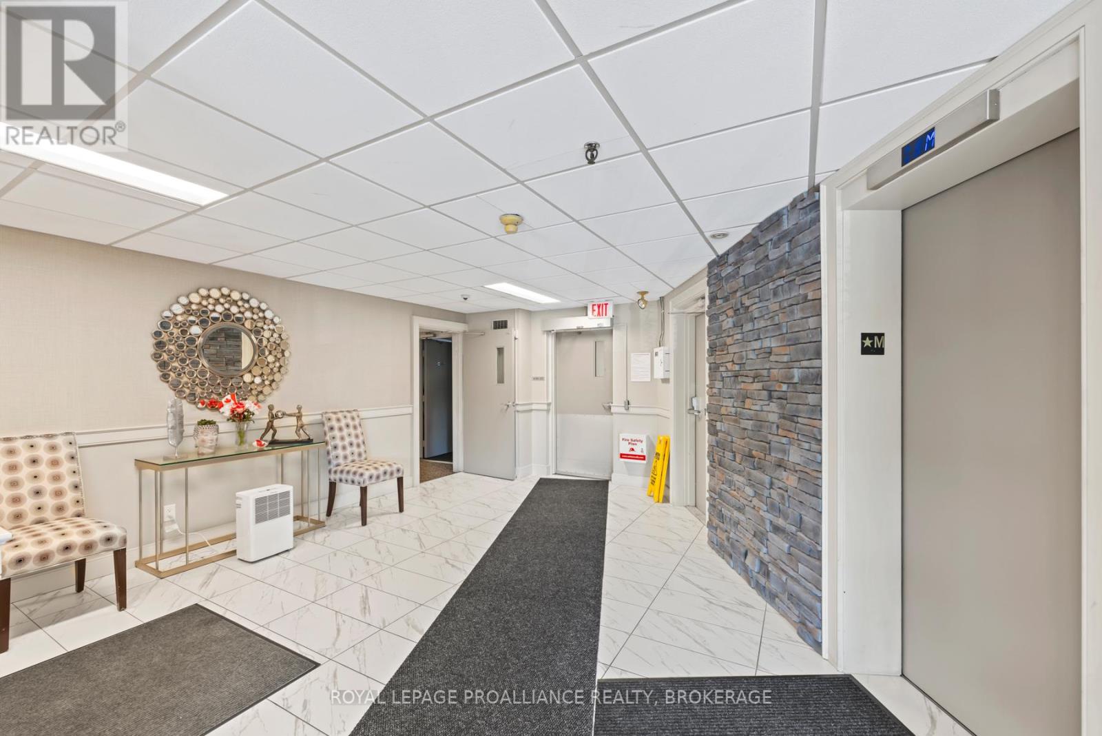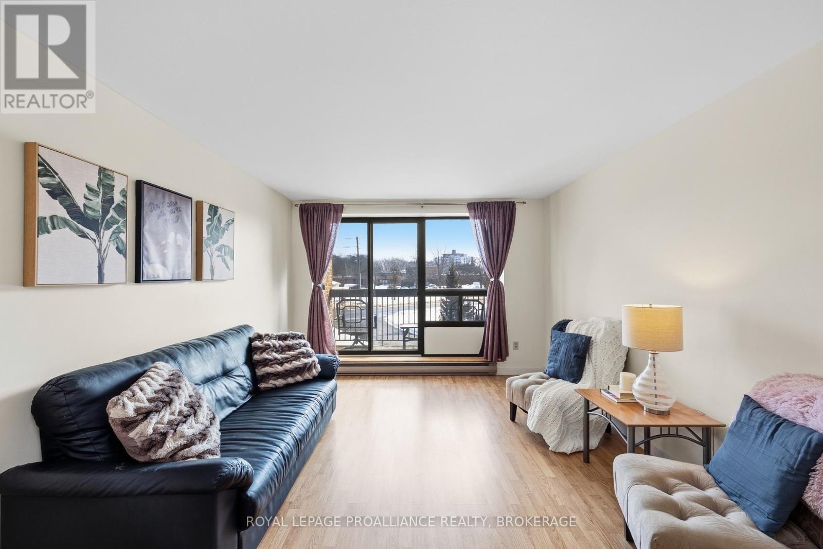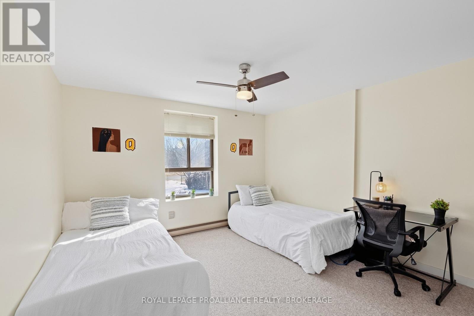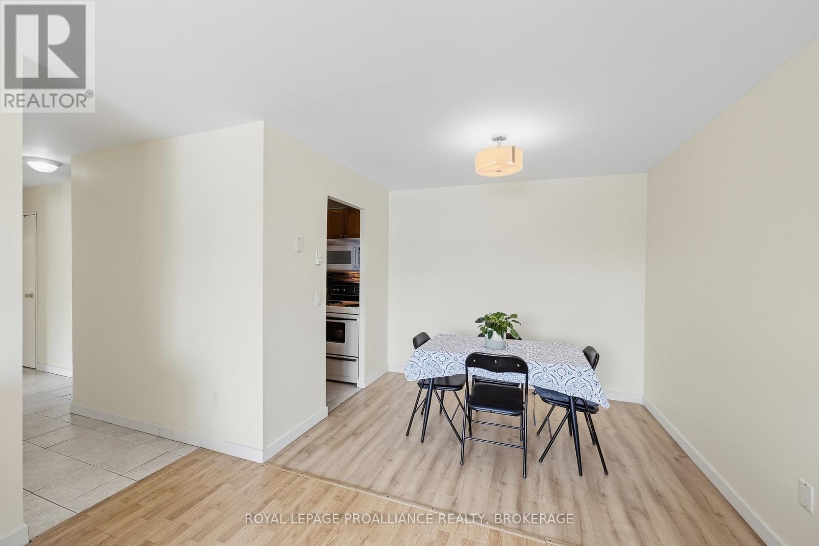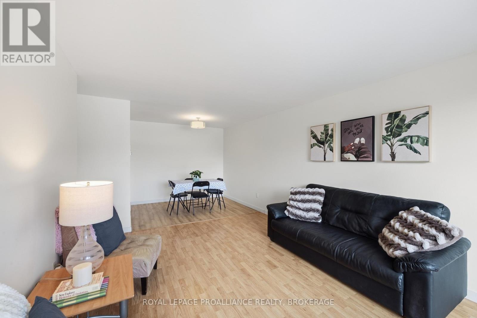 $486.25 MonthlyThis recently renovated, modern and meticulously maintained, 2 bedroom condo is a pleasure to show. The unit boasts a bright open concept dining and living room with south facing views off the private balcony. There are also 2 generous bedrooms and an updated kitchen, bathroom and a convenient storage room. The well maintained no pets, no smoking building is secure and recent improvements include the lobby, elevator, and exercise room. Each unit comes with it's own designated parking spot and there is also a library, party room, guest suite, and laundry facilities on every floor. With new appliances and an owned hot water tank while being centrally located close to green space with walking trails, shopping, restaurants, public transportation, and Queen's University, this unit has a lot to offer. (id:29295)