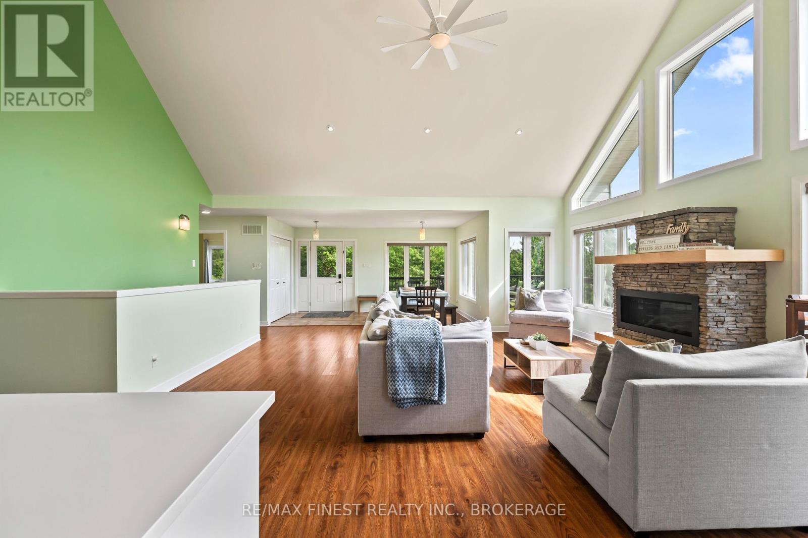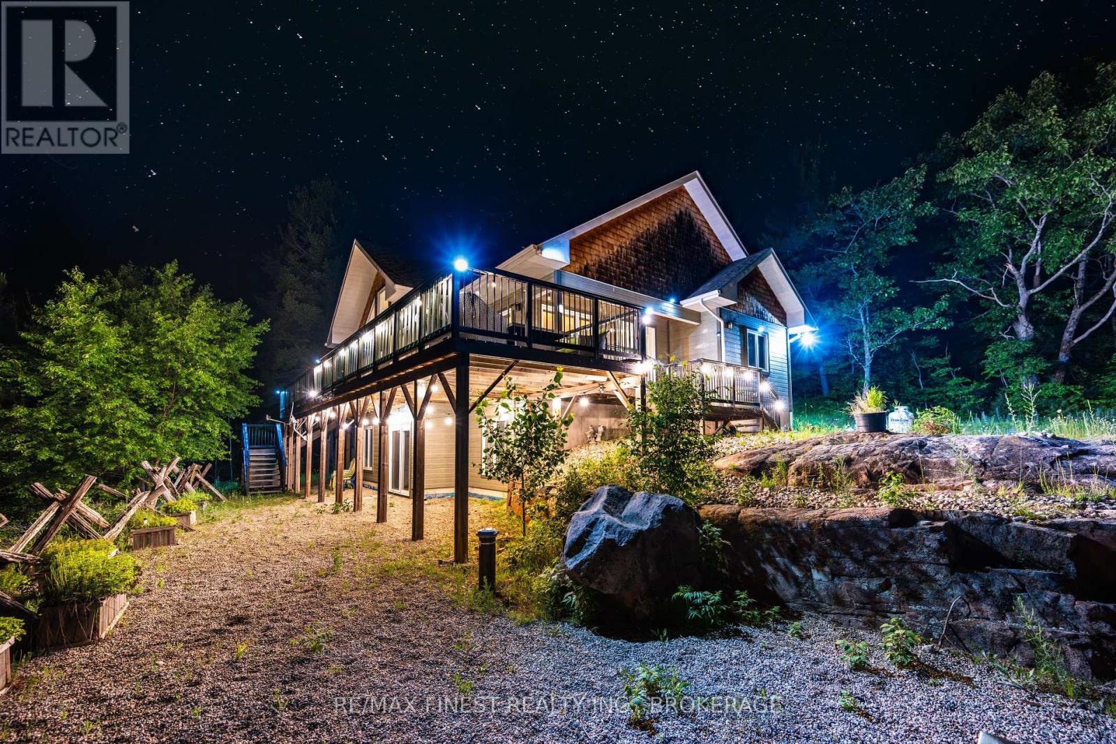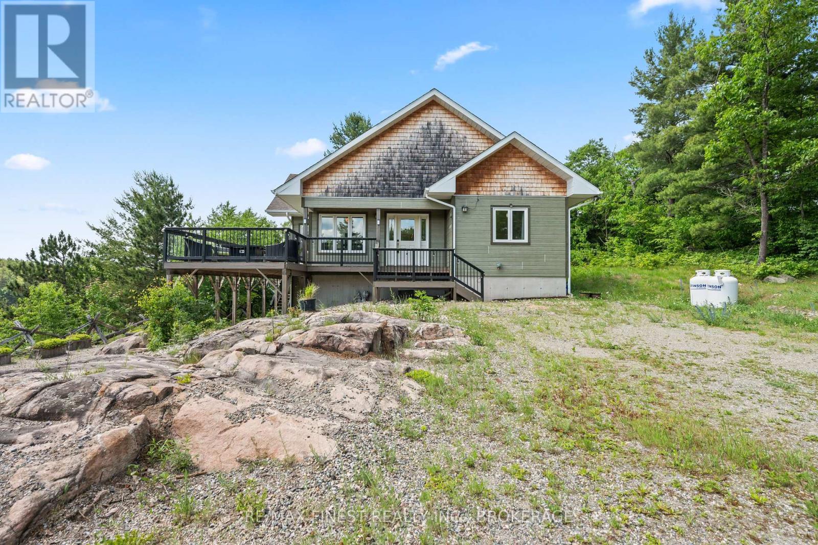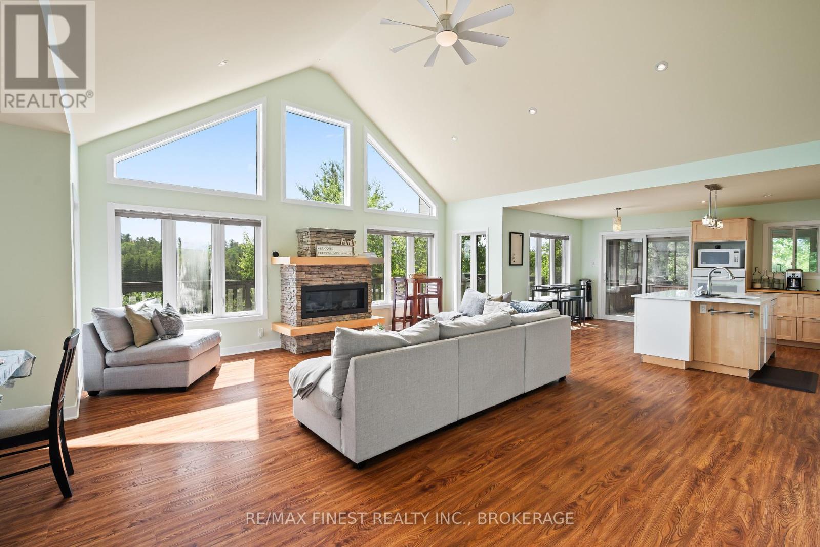 Welcome to 2092 Beach Road- a stunning, year-round waterfront retreat on the shores of pristine Shawenegog Lake. Set on 2.1 private acres with clean, deep, rocky shoreline and panoramic lake views, this exceptional property looks across to Crown land, offering total privacy and direct access to swimming, boating, fishing, and stargazing in one of Ontario's darkest sky areas. Built in 2015, this well-appointed 5-bedroom, 2.5-bath bungalow offers over 3,000 sq. ft. of finished living space and sleeps 11+ guests. Whether you're seeking a full-time home, family cottage, or short-term rental, this fully furnished property is Airbnb-ready (yes-including beds, kitchenware, patio furniture, and more!). The open-concept main floor features vaulted ceilings, a dining area that seats ten, a stylish living room with a stone gas fireplace, and a wall of windows framing the lake. The kitchen includes a large quartz island and ample storage. Cozy nooks throughout provide spots for reading, music, or a home office. This level also includes three bedrooms, a full bath, and a laundry/half bath combo. The walkout lower level offers two additional bedrooms, a spacious rec room with a pool table, TV, and lounge area (all included), a full bathroom, and a large utility/storage room. Outdoor living includes a wraparound deck, a massive screened-in porch, a cozy gazebo, and a campfire area. Down by the water, you'll find a dock with storage and a few included kayaks and canoes- perfect for launching your next adventure! A private laneway provides ample parking and room for future outbuildings. Enjoy sunrise coffee on the deck, evenings by the fire, and a proven setup for rental success. Bonus features include Starlink high-speed internet and an electric car charger. Located near Hwy 7 with easy access to Ottawa, Kingston, and Toronto. Close to Bon Echo Park, scenic trails, caves, and charming villages with groceries and everything you need. A rare, move-in ready lakefront gem. (id:29295)