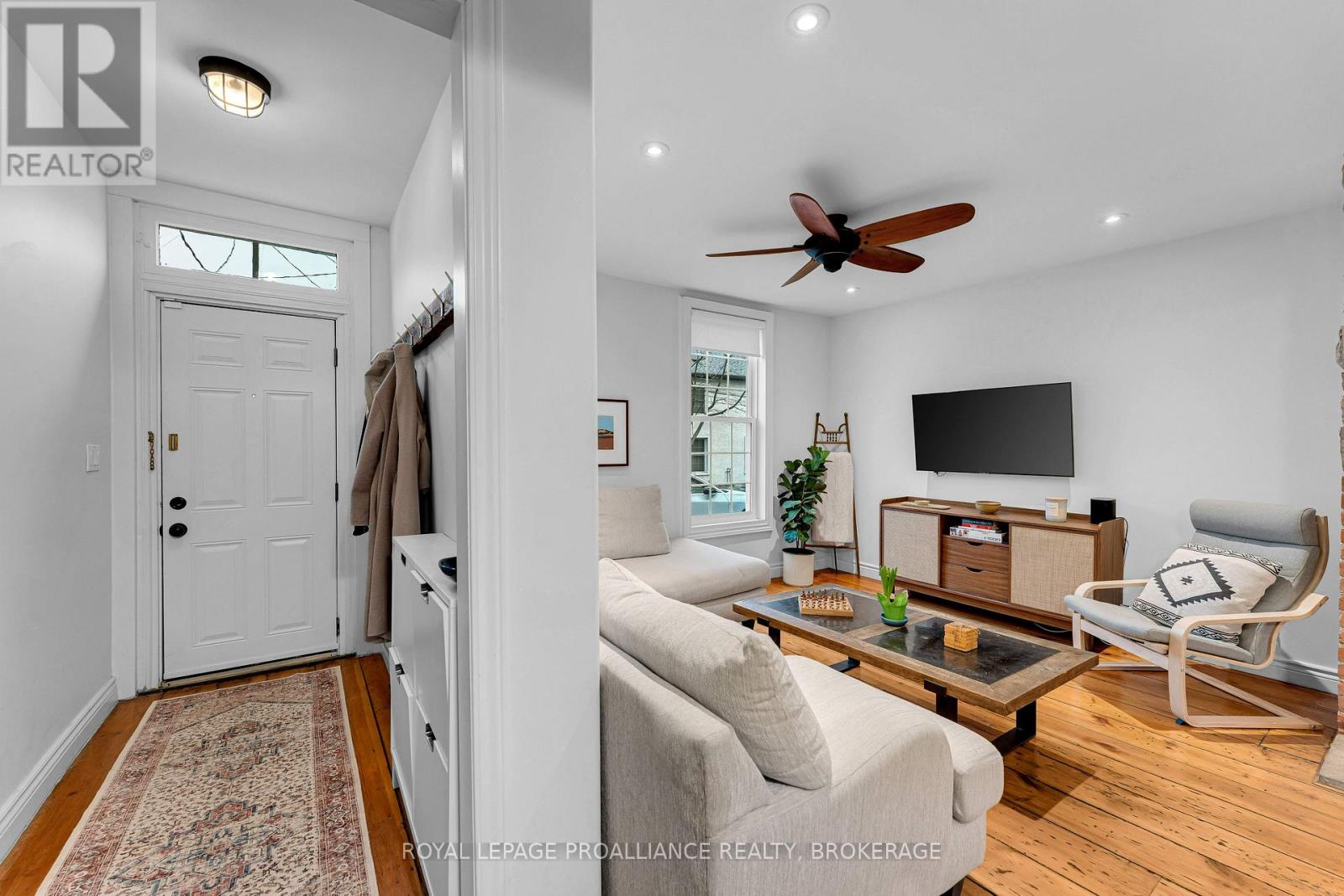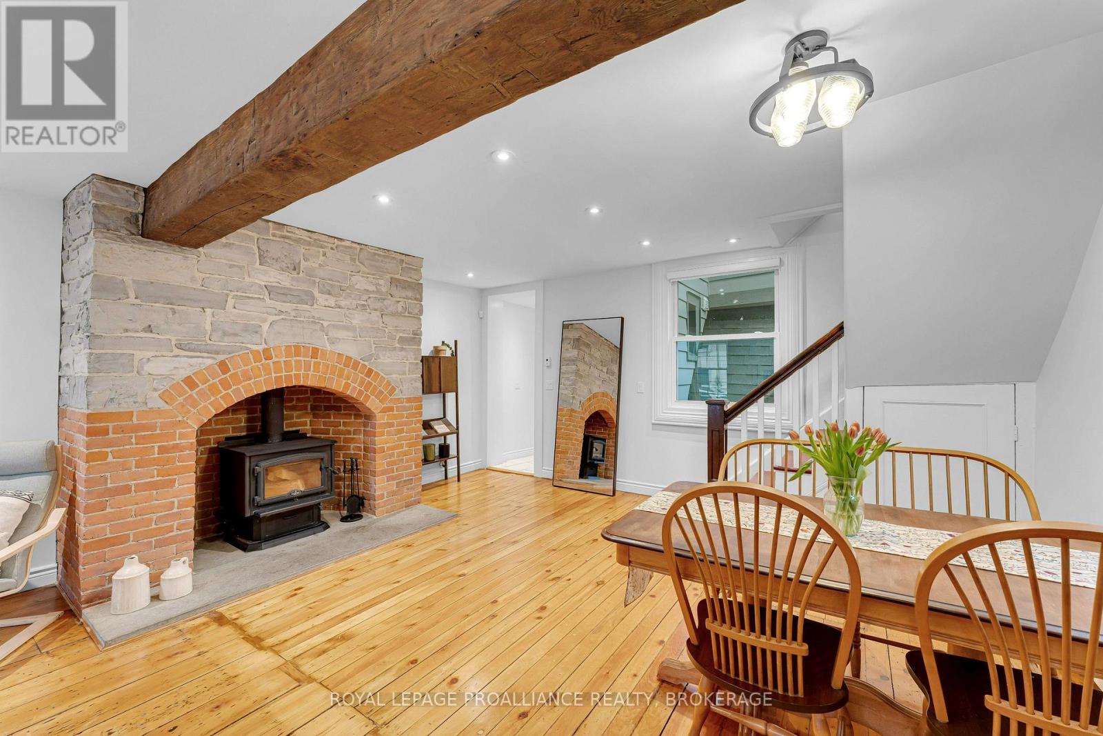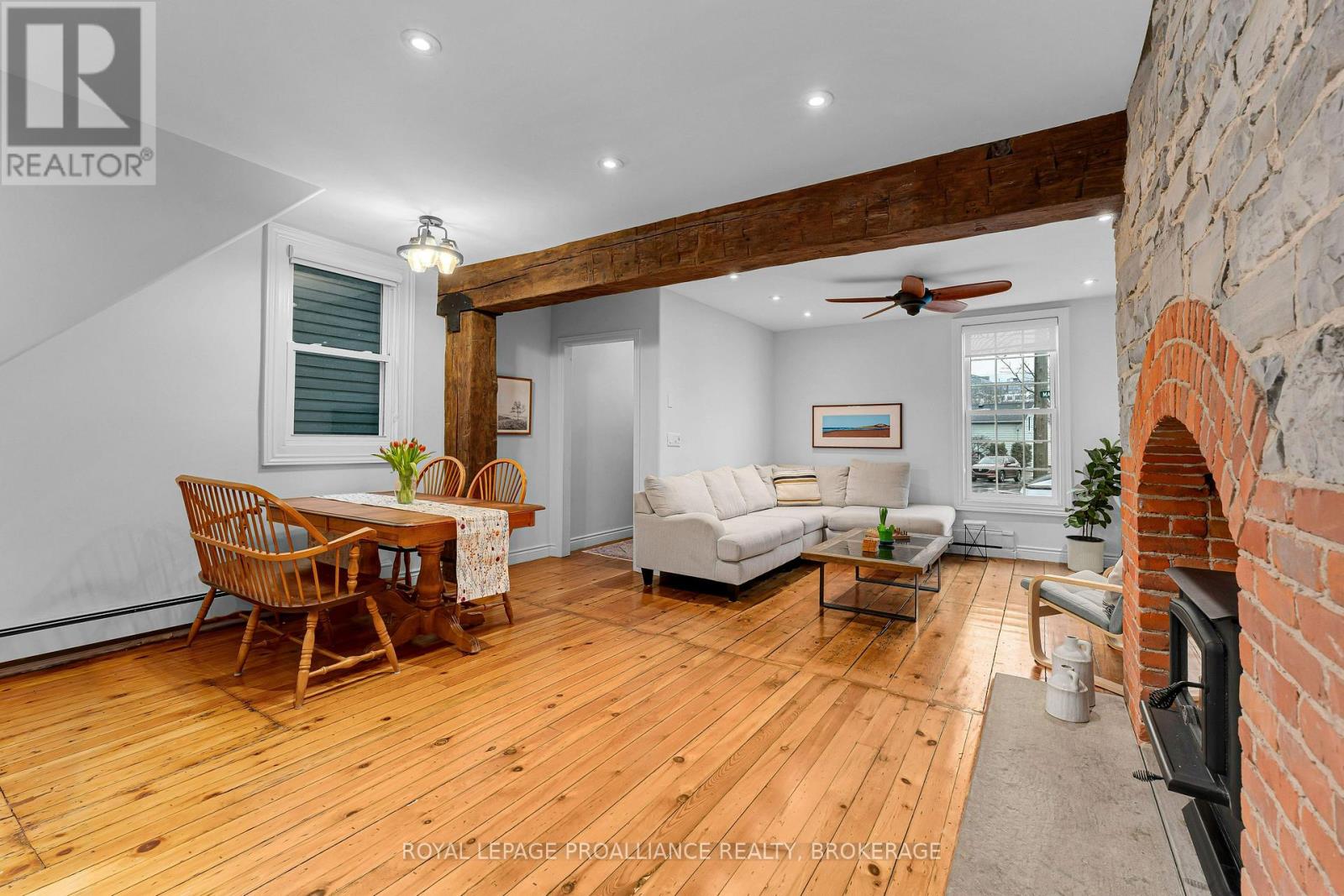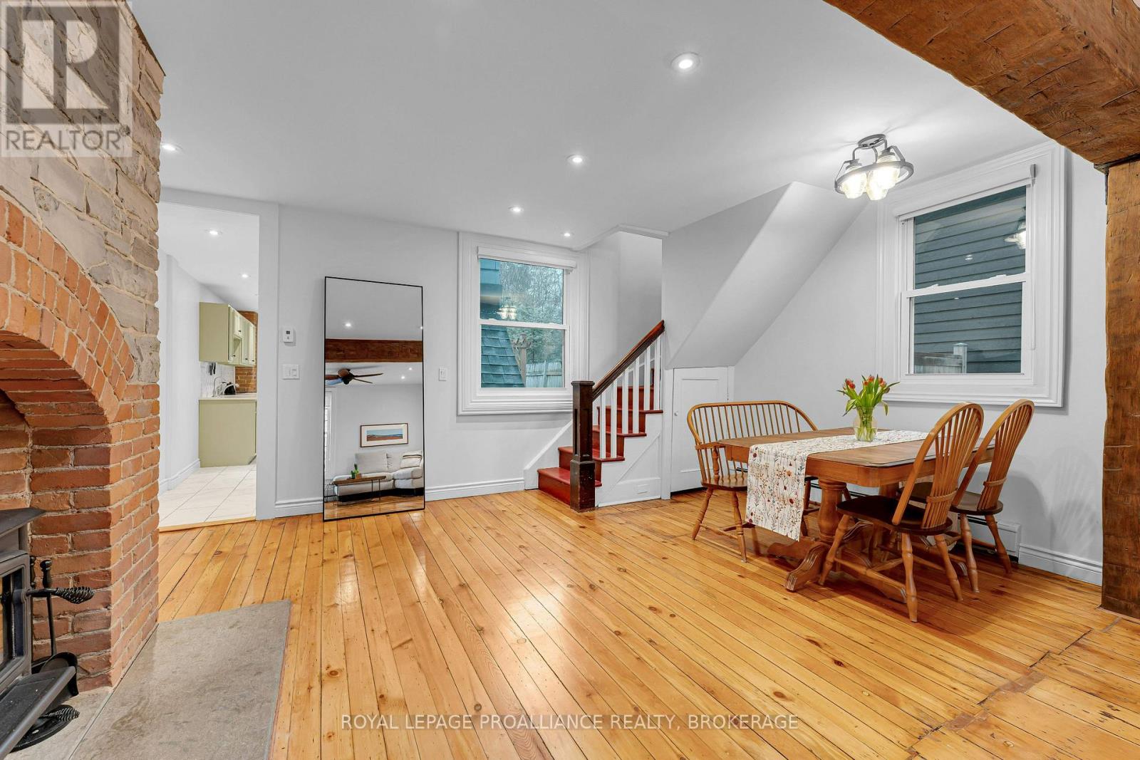 Set in a prime downtown Kingston location, this circa 1870 gem blends timeless character with modern updates. Offering 3 bedrooms and 1.5 bathrooms, the home features a welcoming open concept living room and dining room, along with an updated kitchen designed for everyday living. Upstairs, a versatile flex space adds the perfect spot for a home office, reading nook, or additional lounge. Rich in character, you'll find exposed brick, wood beams and limestone, a woodstove, and beautiful original pine plank floors that speak to the home's history. Extensive renovations in recent years include the roof, boiler, windows, and inviting outdoor living space making this property truly move-in ready. Step outside to a private backyard retreat with pergola, patios, a play structure and cedar shed or small studio space. All just a short walk to McBurney Park, Queen's University, and Kingston's vibrant downtown. (id:29295)