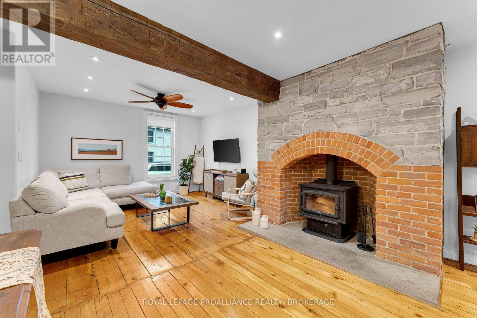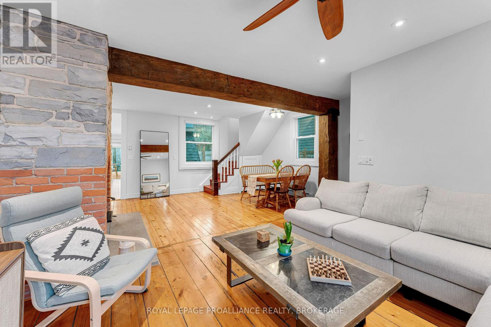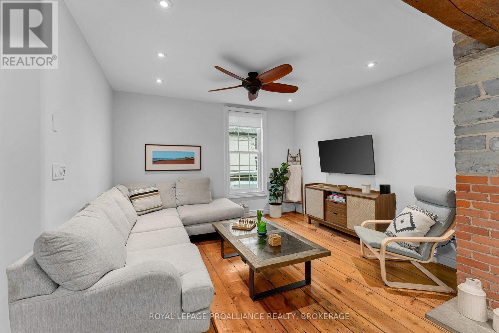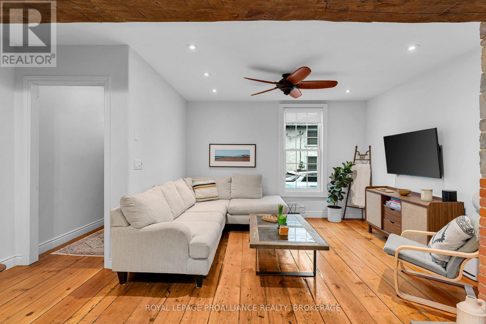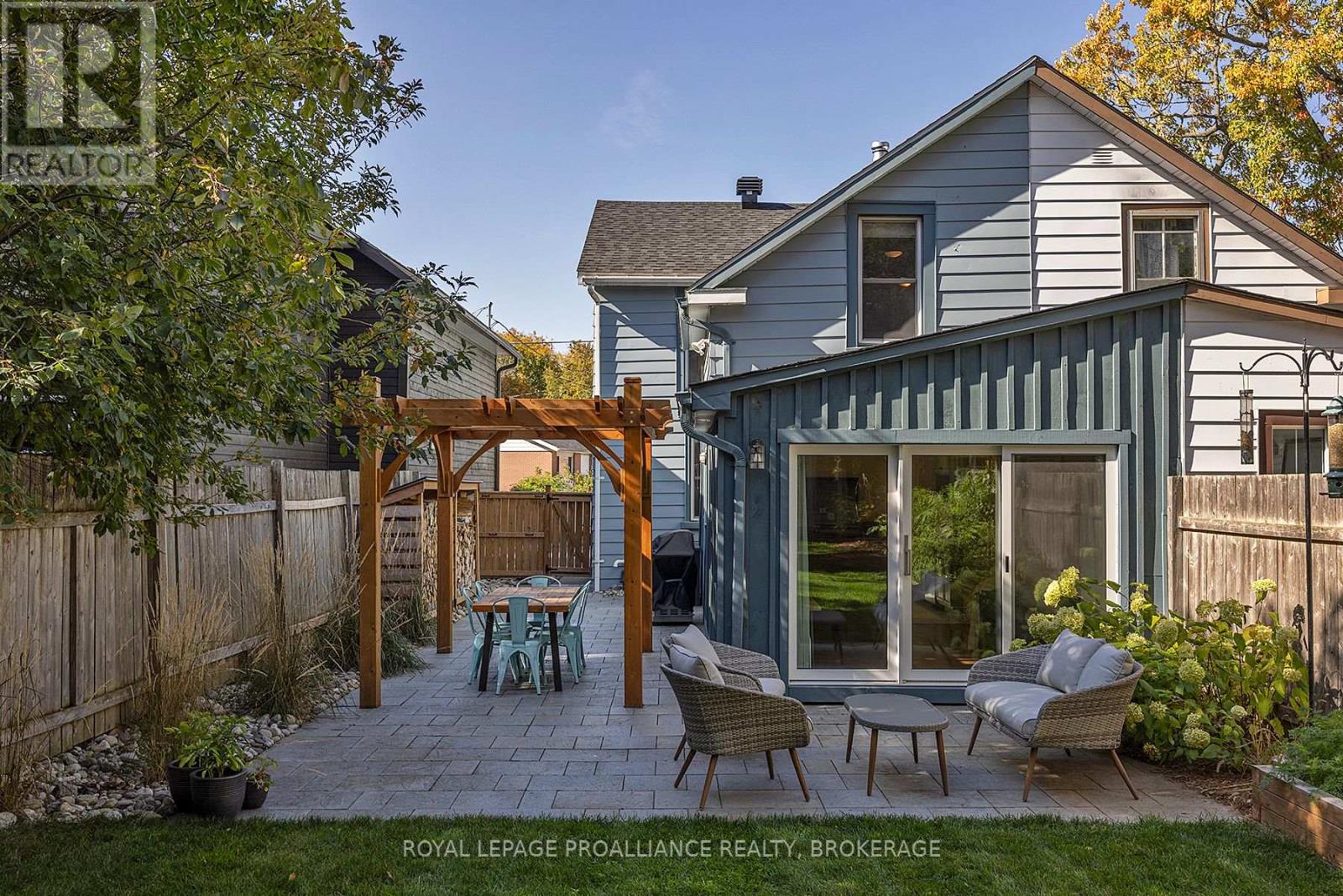 Set in a prime downtown Kingston location, this circa 1870 gem blends timeless character with modern updates. Offering 3 bedrooms and 1.5 bathrooms, the home features a welcoming open concept living room and dining room, along with an updated kitchen designed for everyday living. Upstairs, a versatile flex space adds the perfect spot for a home office, reading nook, or additional lounge. Rich in character, you'll find exposed brick, wood beams and limestone, a woodstove, and beautiful original pine plank floors that speak to the home's history. Extensive renovations in recent years include the roof, boiler, windows, and inviting outdoor living space making this property truly move-in ready. Step outside to a private backyard retreat with pergola, patios, a play structure and cedar shed or small studio space. All just a short walk to McBurney Park, Queen's University, and Kingston's vibrant downtown. (id:29295)