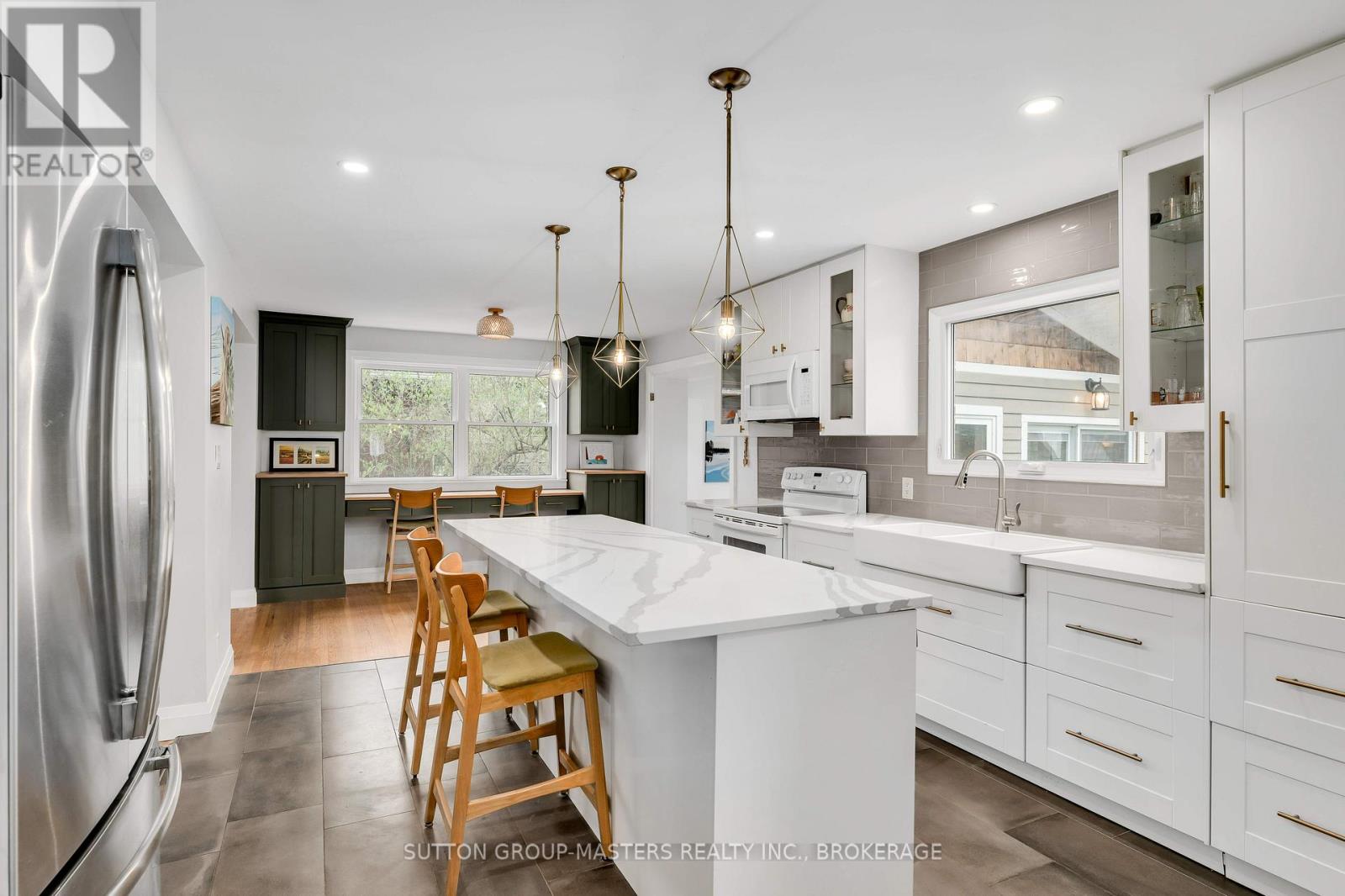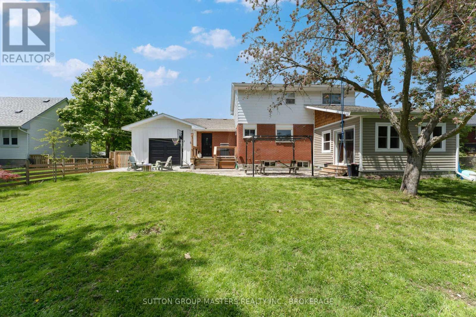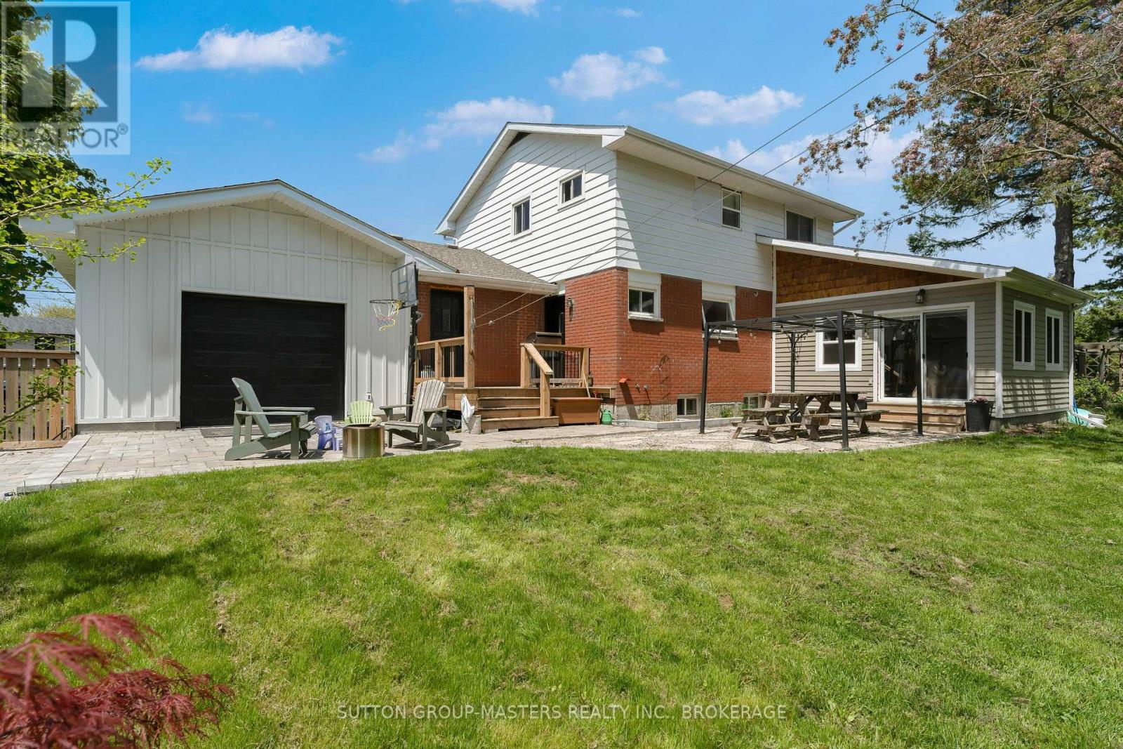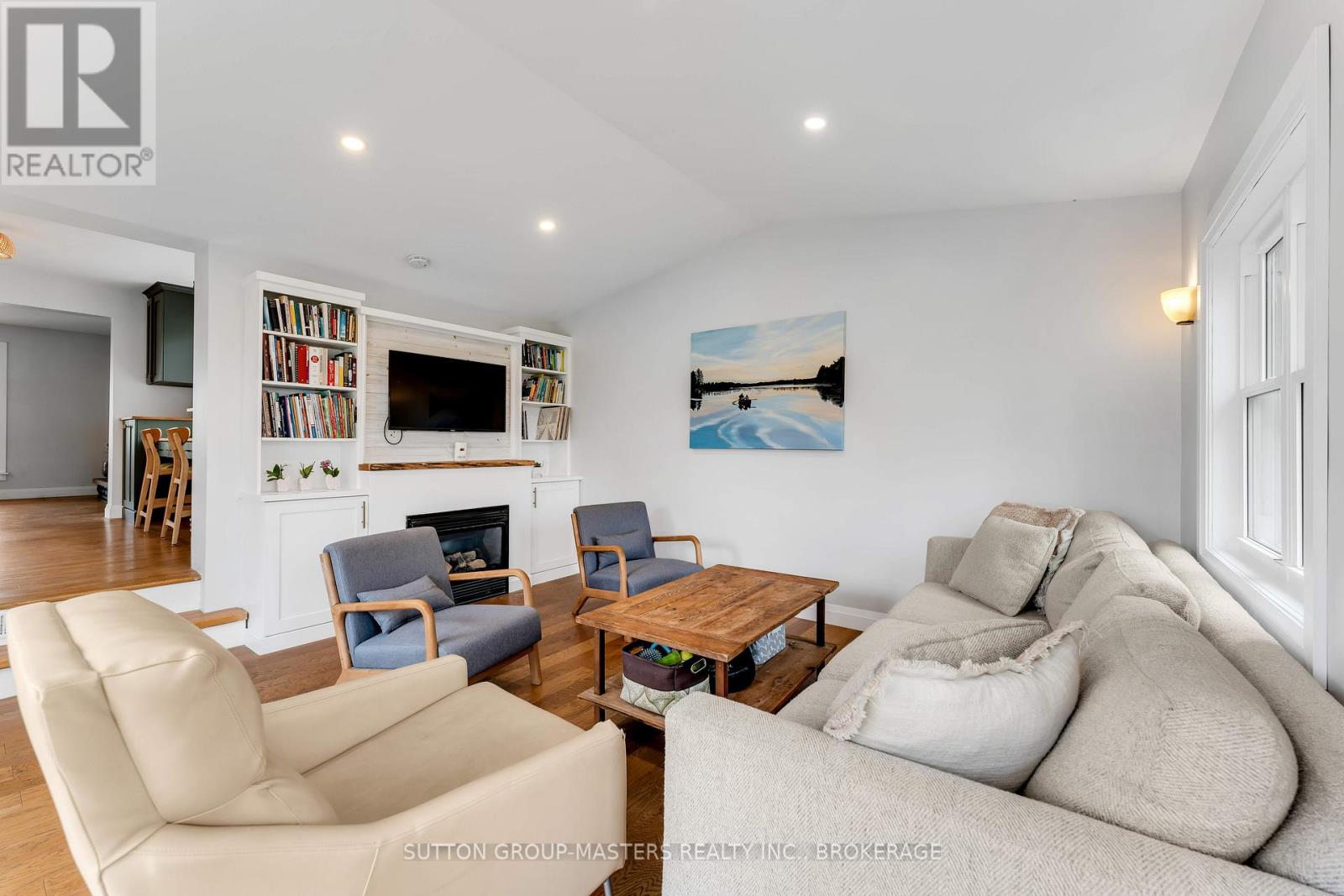 Come check out this beautifully updated home in sought-after Point Pleasant neighbourhood! Featuring a double-wide drive, 2.5-car garage, and a newer covered porch, this home offers great curb appeal upon first arriving. Inside, enjoy a spacious foyer with two closets, hardwood flooring, formal dining with wood fireplace, and a semi open-concept kitchen with Quartz counters, large island, modern tile backsplash, new cabinetry and pantry. The sunken family room addition boasts high ceilings, built-in shelving, and a gas fireplace. Upstairs features 4 bright bedrooms, including a large primary, 4pc bathroom and fully renovated 3pc bathroom with rain shower. As you head to the lower level, you will appreciate the fully finished space offering a bright family room and 5th bedroom. The fully fenced backyard is every family's dream with two patios, gazebo and loads of green space. This home is situated in a family-friendly neighbourhood, only a short walk to Lake Ontario, Jorene Park and R.G. Sinclair Public School. Recent updates include the paved drive (2025), shingles (2021), furnace (2022), A/C (2015), hot water tank (2024) and the majority of windows have been done in last 10 years. This home shows even better in person - come take a tour for yourself! (id:29295)