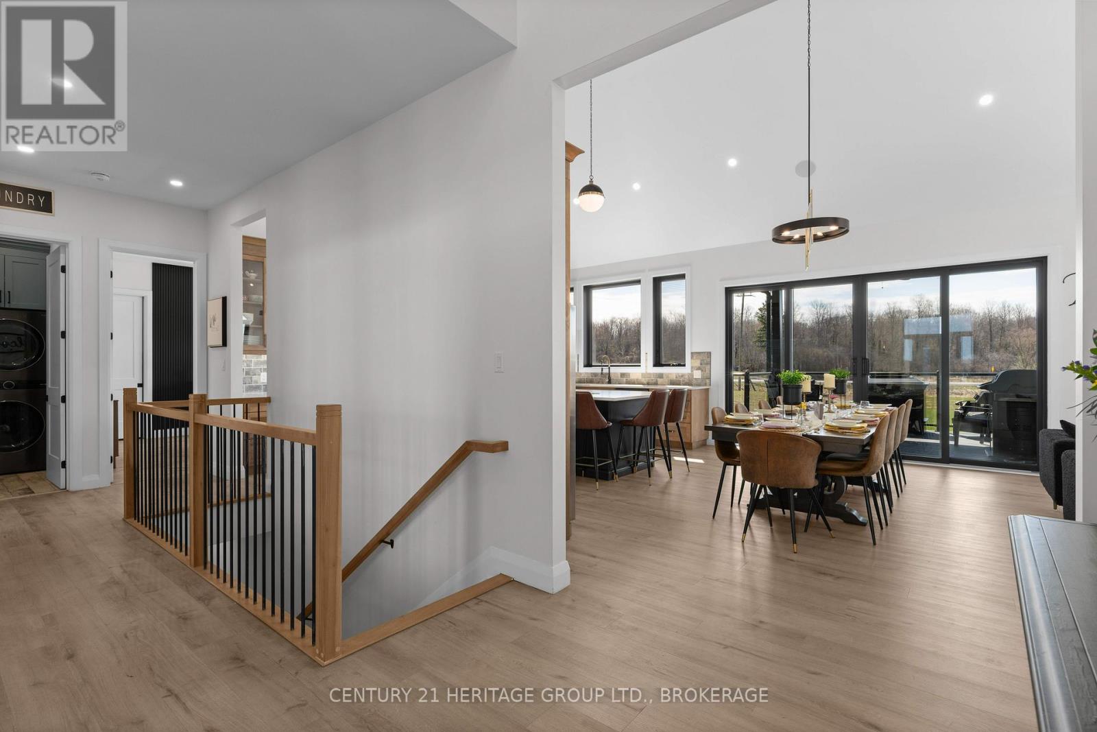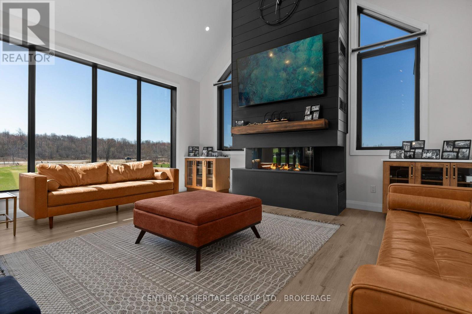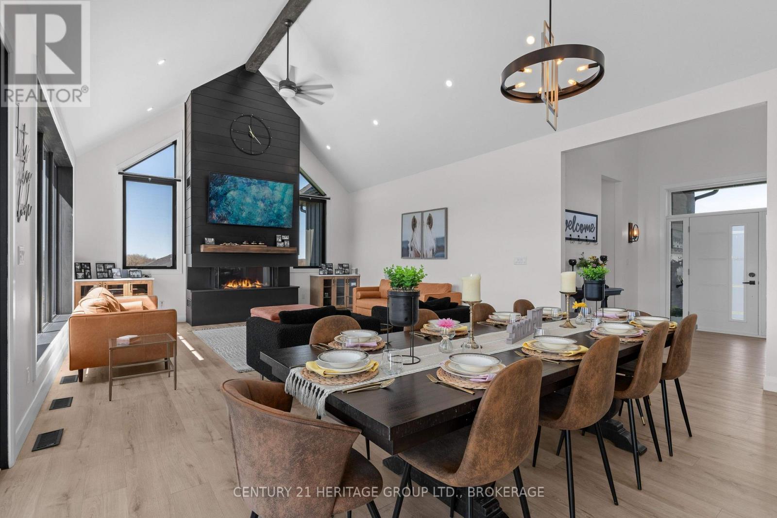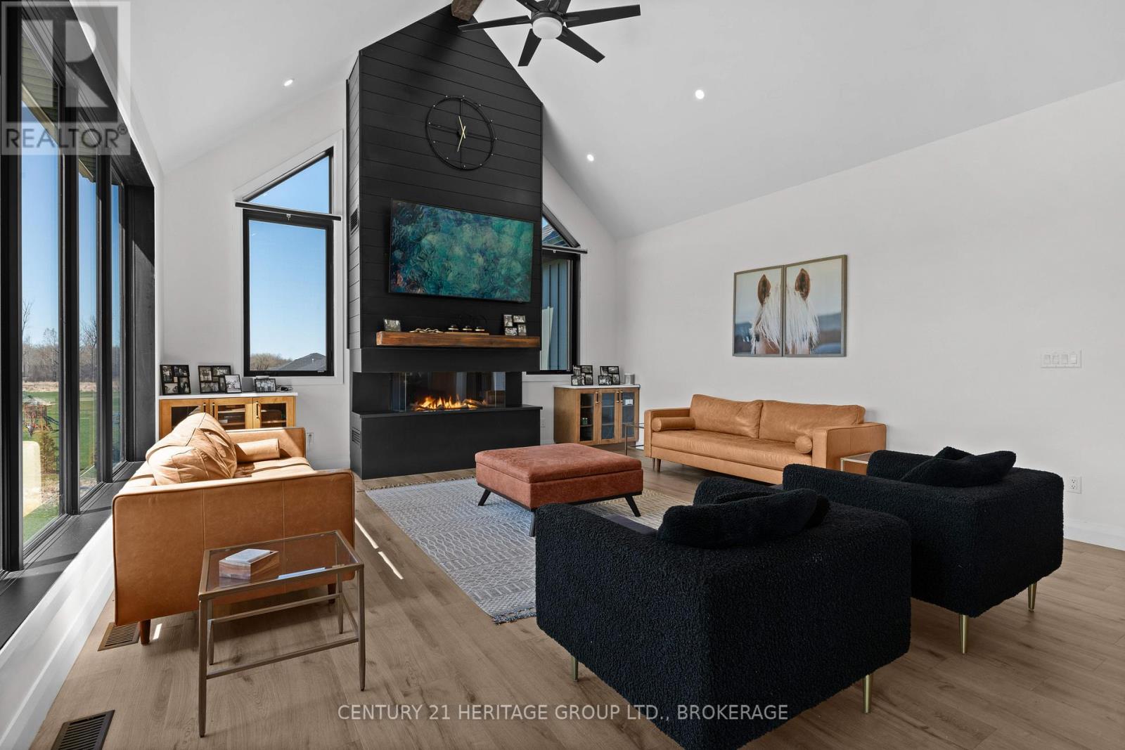 Welcome to 245 Mann Drive, an extraordinary 5-bedroom, 3.5-bathroom custom home set on an estate-sized lot in the sought-after community of Gibraltar Estates. Offering over 4,600 square feet of thoughtfully designed living space, this impressive residence blends elegant design with everyday functionality-ideal for families, entertaining, and multi-generational living. The striking stone and Hardie board exterior introduces a home defined by quality craftsmanship. Inside, dramatic 20-foot vaulted ceilings, floor-to-ceiling windows, and an expansive open-concept layout create a bright, welcoming atmosphere. At the heart of the home is a chef-inspired kitchen featuring an oversized quartz island, brick backsplash, open shelving, high-end appliances including a propane double-oven stove, and a spacious walk-in pantry. The adjacent dining area is perfectly suited for hosting gatherings. The main-floor primary suite offers a private retreat with dual walk-in closets, deck access, and a spa-like ensuite with a soaker tub, dual vanities, and an impressive walk-in shower. A dedicated office, two additional bedrooms, and main-floor laundry provide excellent day-to-day functionality. The fully finished walkout lower level adds two bedrooms, a full bath, a games room, a cozy den with a fireplace, and a home gym complete with sauna-ideal for guests, teens, or extended family. Outside, enjoy the covered upper deck, swim spa, and stunning sunset views. Built to impress and designed to live in, 245 Mann Drive offers the perfect balance of luxury, comfort, and lifestyle in one exceptional property. (id:29295)