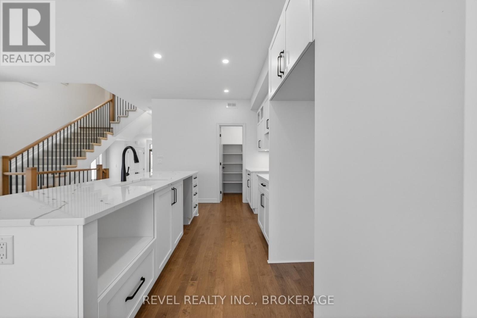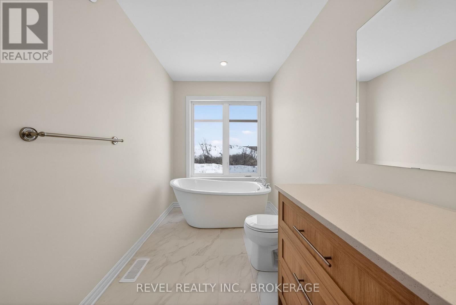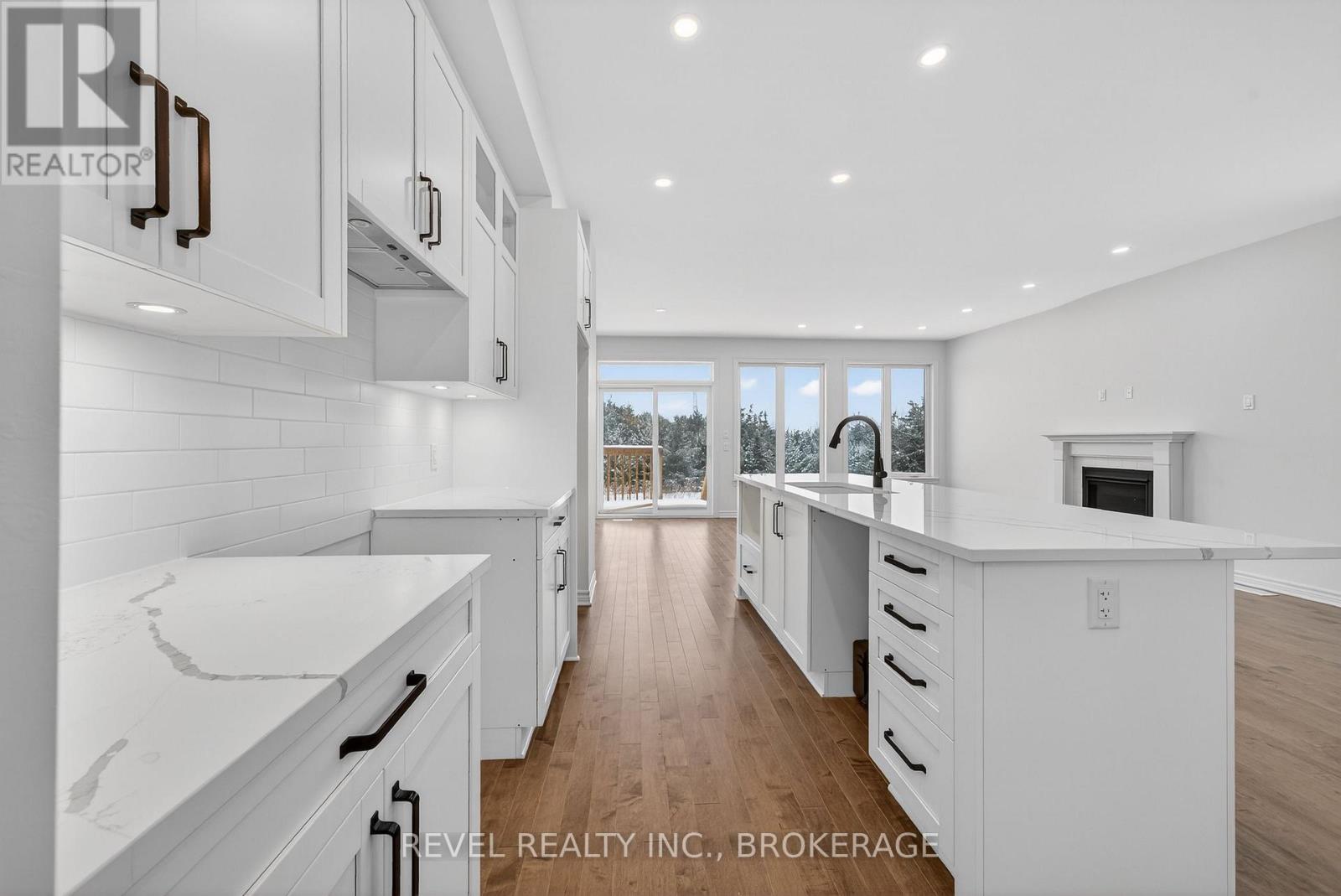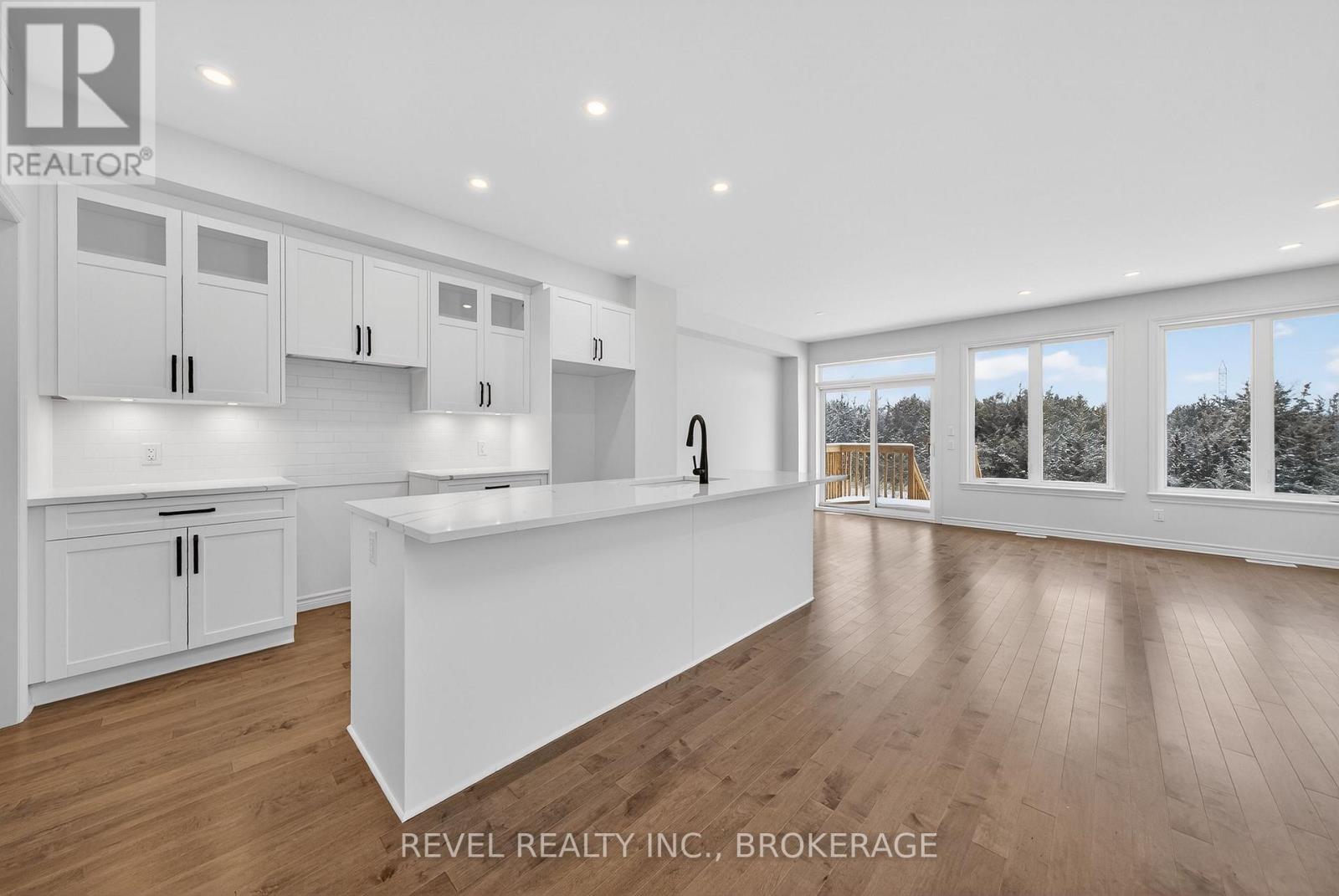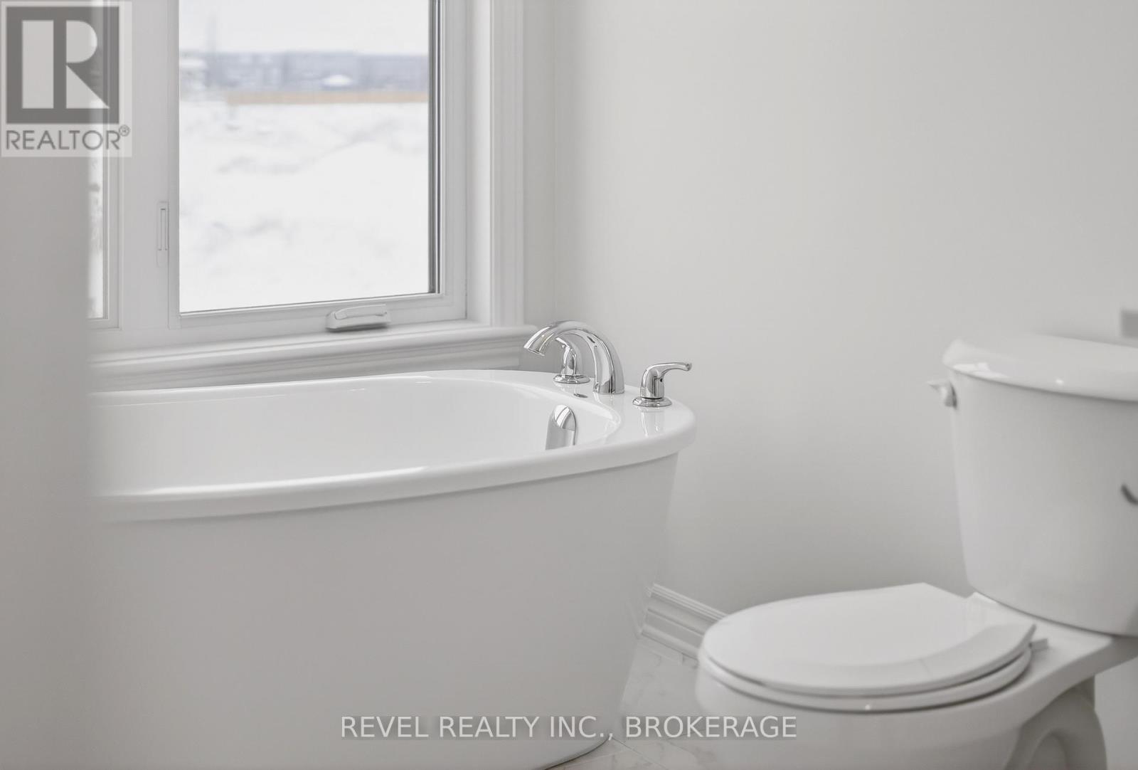 Welcome to The Camden Model! A move-in ready end-unit townhome with 2,160 sq ft of thoughtfully finished living space, located in Kingston's desirable northwest WoodHaven neighbourhood. The main level is highlighted by maple hardwood flooring, quartz countertops throughout, and a light-filled kitchen featuring white shaker-style cabinets, an upgraded sink, and a generous walk-in pantry. A gas fireplace adds warmth and character to the living area. Upstairs, the primary retreat offers a luxurious 4-piece ensuite with a freestanding soaker tub and a sleek walk-in glass/tile shower. The finished basement expands your living options and includes a bathroom rough-in for future flexibility. ENERGY STAR certified, this home blends modern design with efficiency and everyday comfort. (id:29295)