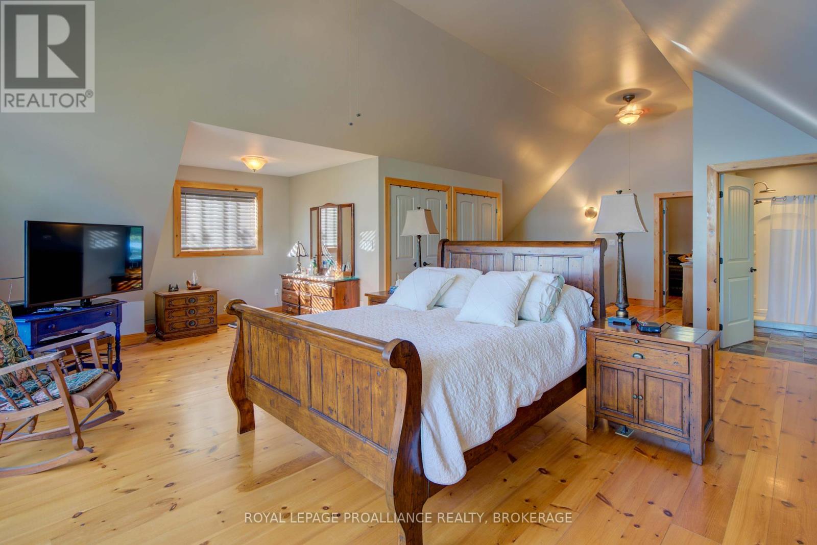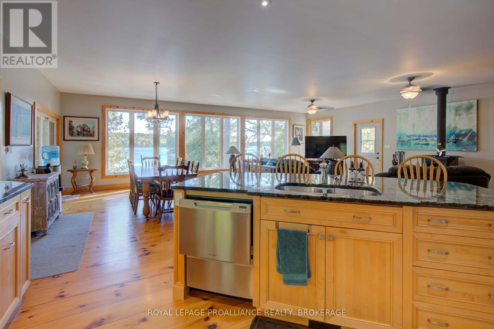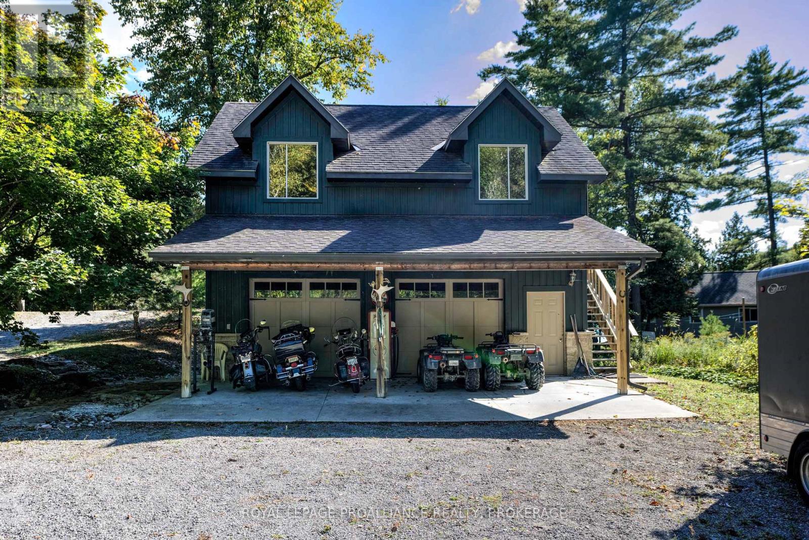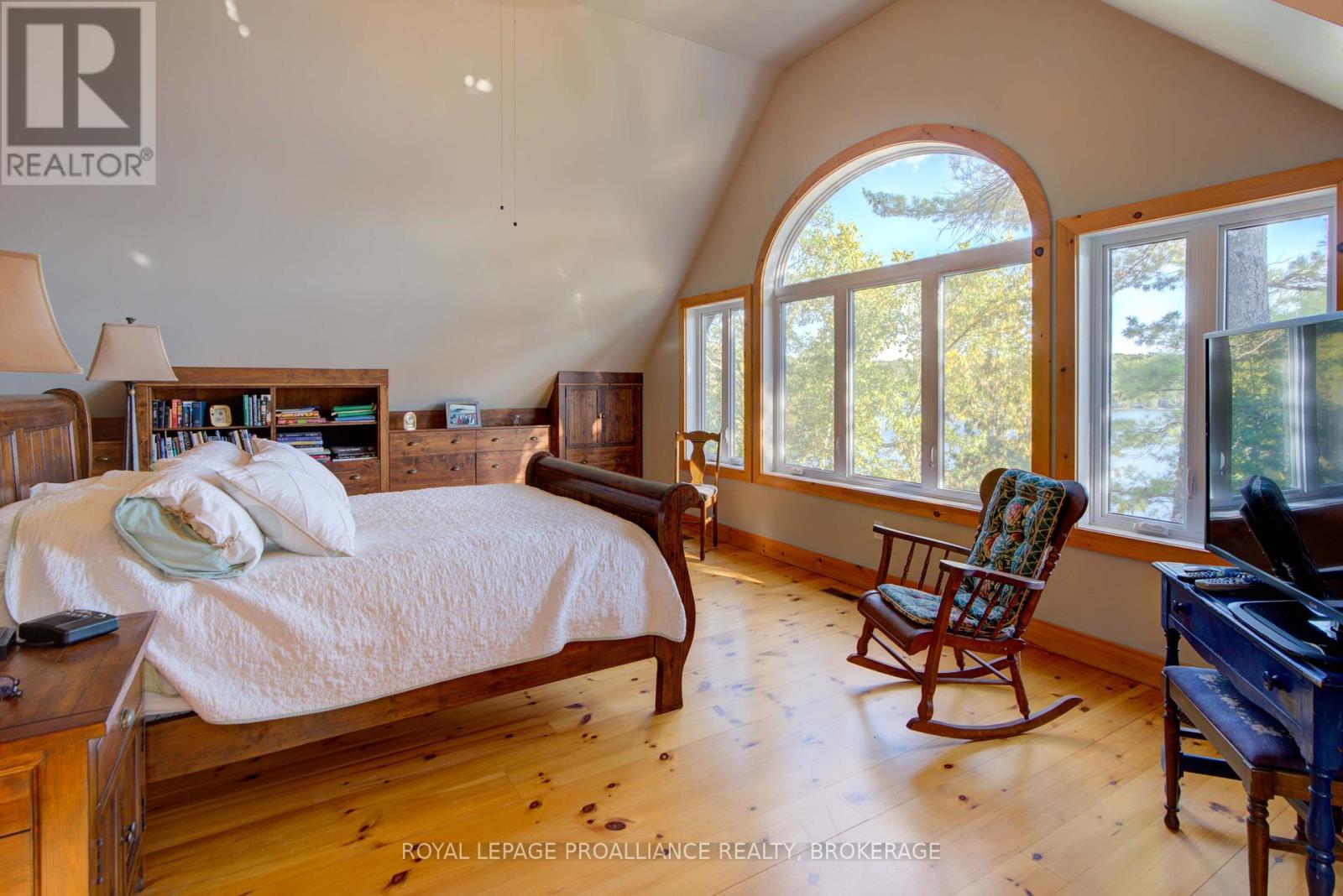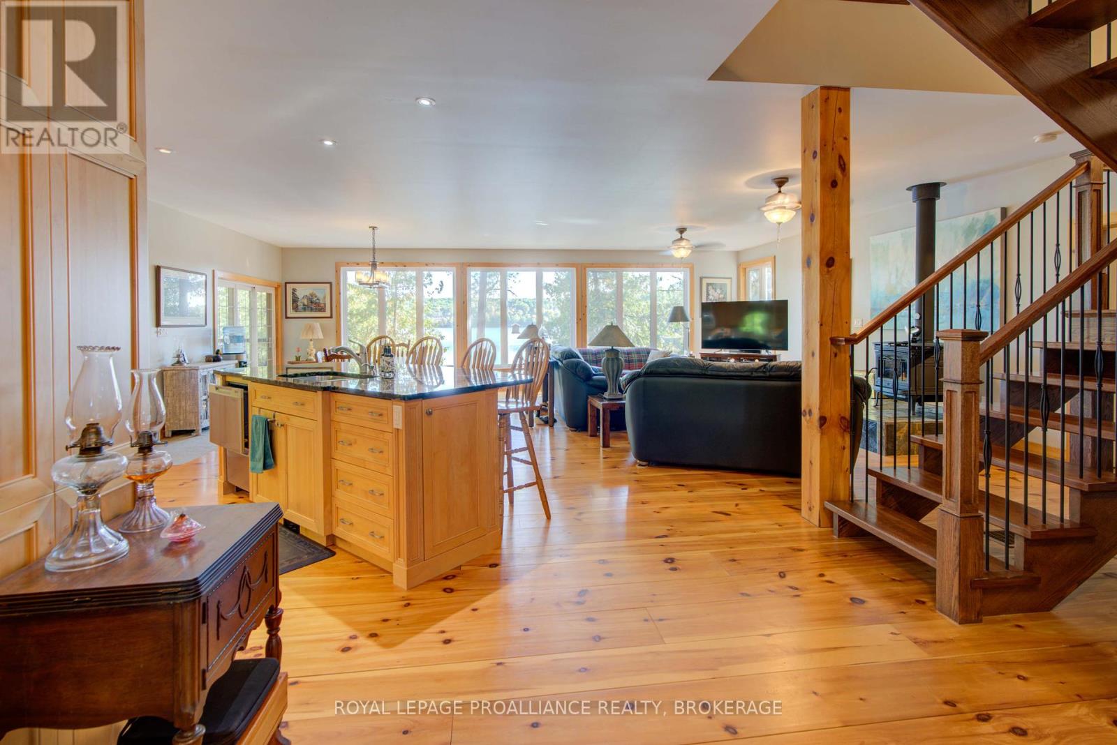 Waterfront oasis on Buck Lake! This beautiful property features 2+ acres of land and200 ft of shoreline. This gorgeous home sits close to the lake with level access to shallow water and deep water off the dock. Enjoy the large dock, covered boat slip and tiki bar - with southern exposure for sunrises and sunsets. The view is stunning looking out over the bay and the location is private & peaceful. As you enter under the timber frame porch, you immediately feel a sense of relaxation in this stunning lake house. The main floor has a large, open concept Great Room with expansive windows and access out to the deck. The custom Corelle Kitchen is a showpiece with Madagascar blue granite countertops, dbl drawer dishwasher, under-counter microwave and a pot filler above the propane stove. Enjoy cozy evenings with the warmth of the Pacific Energy wood-stove. The main floor bedroom has an attached 4-pc bath that also has access from the foyer. The office next to the foyer could be another bedroom. The bathrooms and foyer have heated slate floors while the balance of the home has wide-plank pine flooring - from trees on the property! The second level features a large bedroom at the rear, laundry area and an amazing primary bedroom with cathedral ceilings, custom cabinets, a 3-piece ensuite bath and gorgeous views over the pristine waters of the lake. The partial basement has concrete floor & spray foam walls and the home is heated by propane forced air, has 200-amp service, a lake water system with UV light, Hide-A-Hose central vacuum, HRV, electric hot water, A/C and an on-demand backup generator system. A catwalk leads from the house to extra living space above the 2-car detached garage. This space has a large family room, dining area, kitchenette along with a bedroom and a 2-piece bath. The exterior of the home and garage have vertical Timberthane wood siding with a lifetime guarantee. Stunning home located just south of Westport or 40minutes north of Kingston. (id:29295)