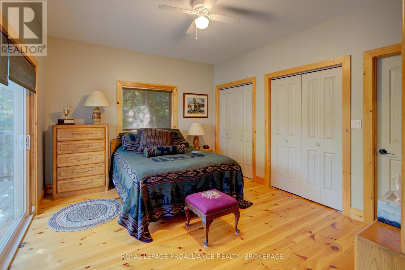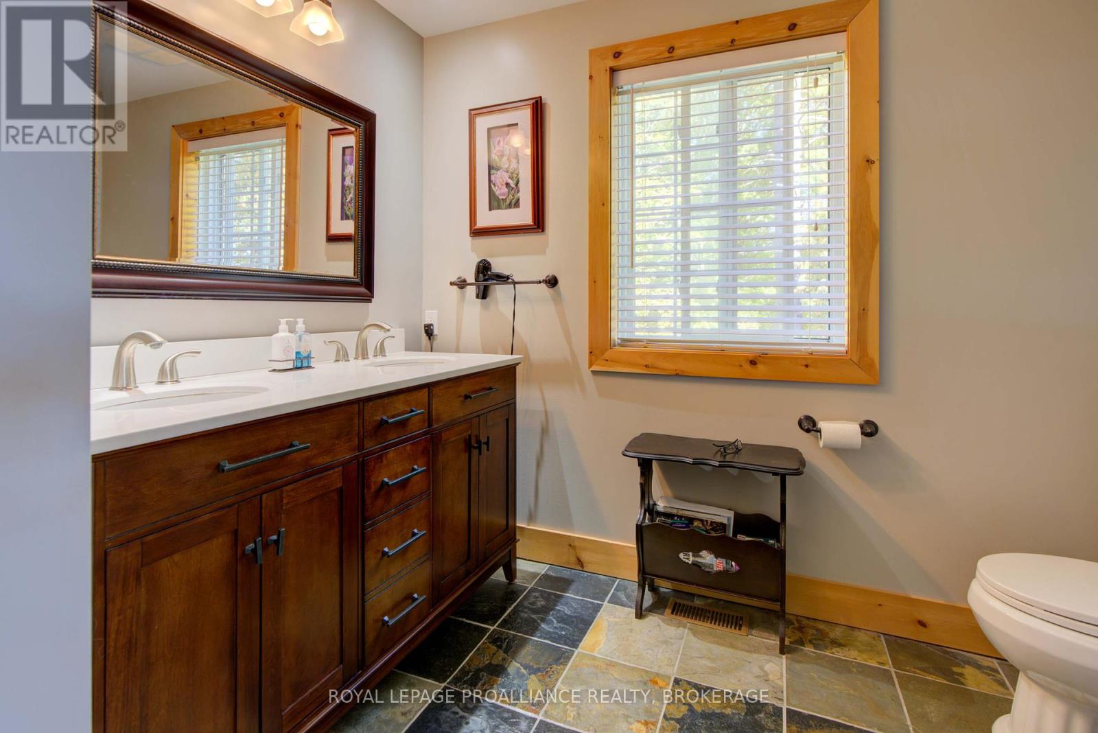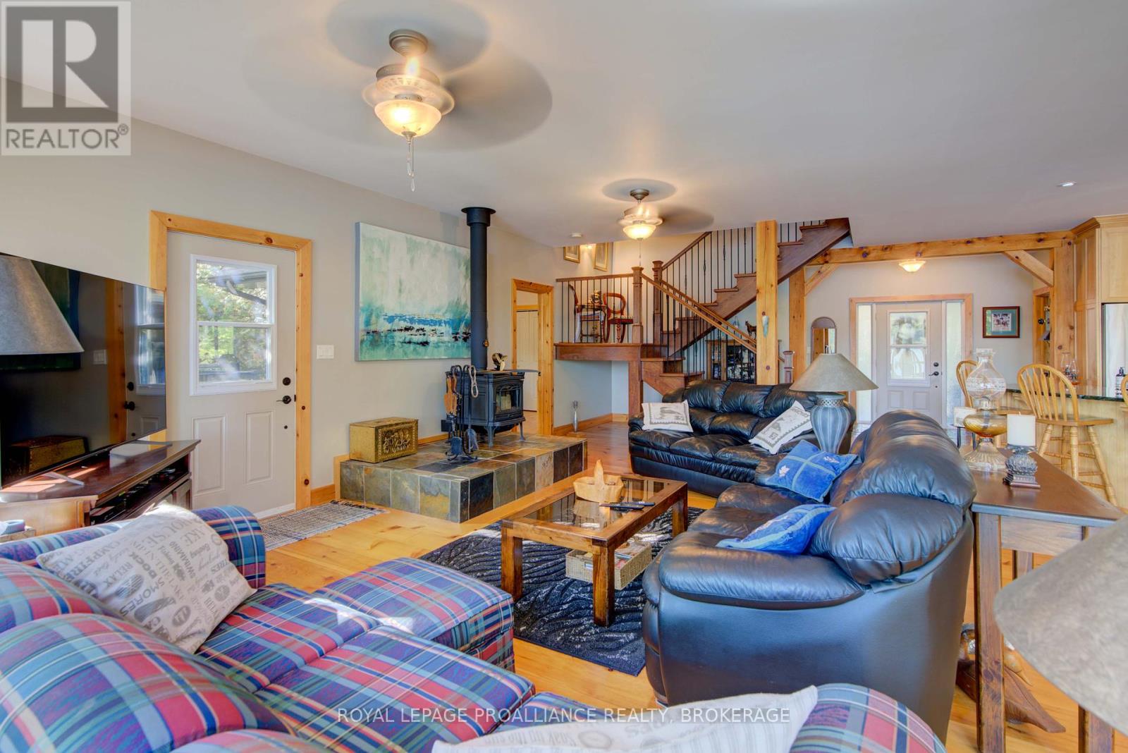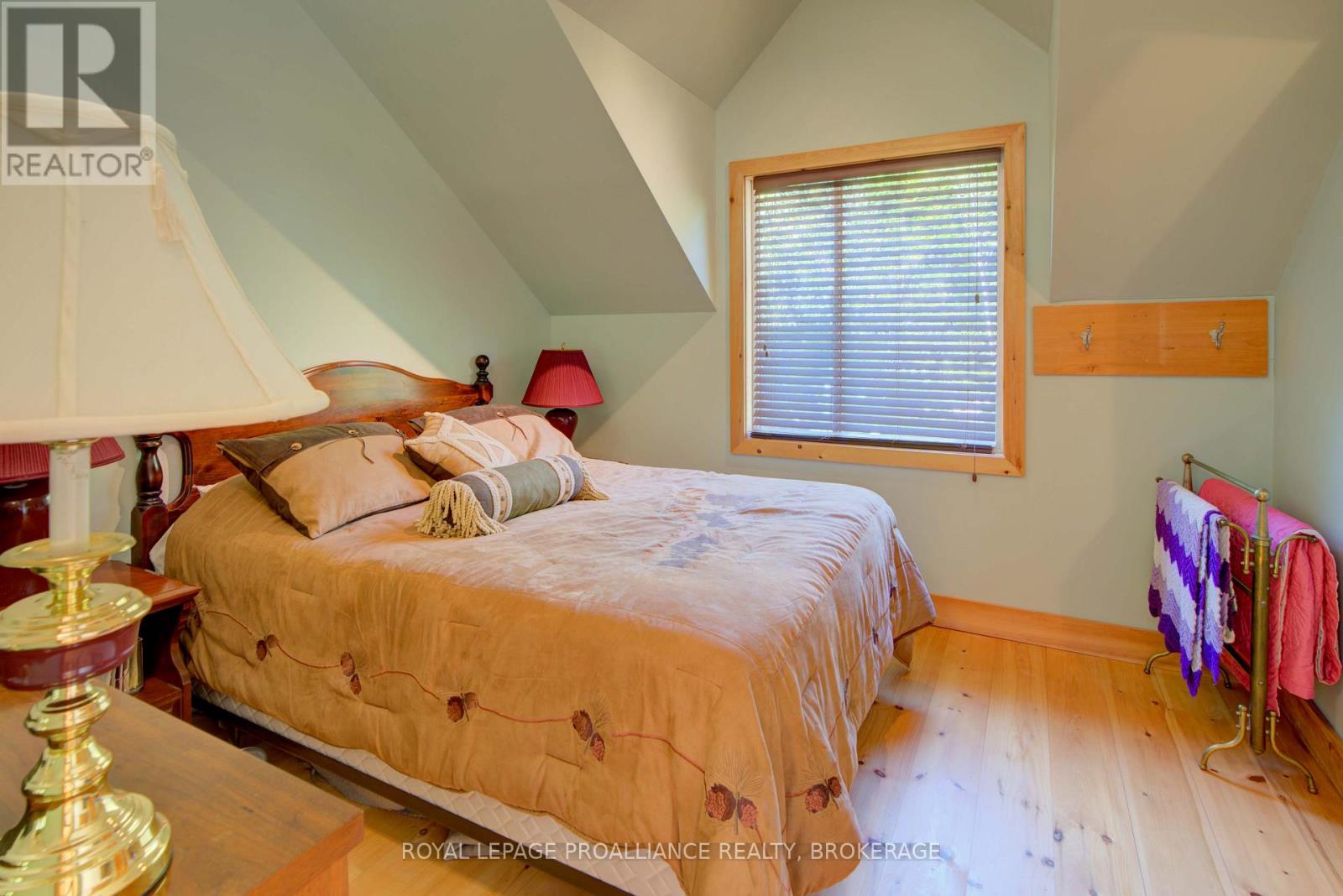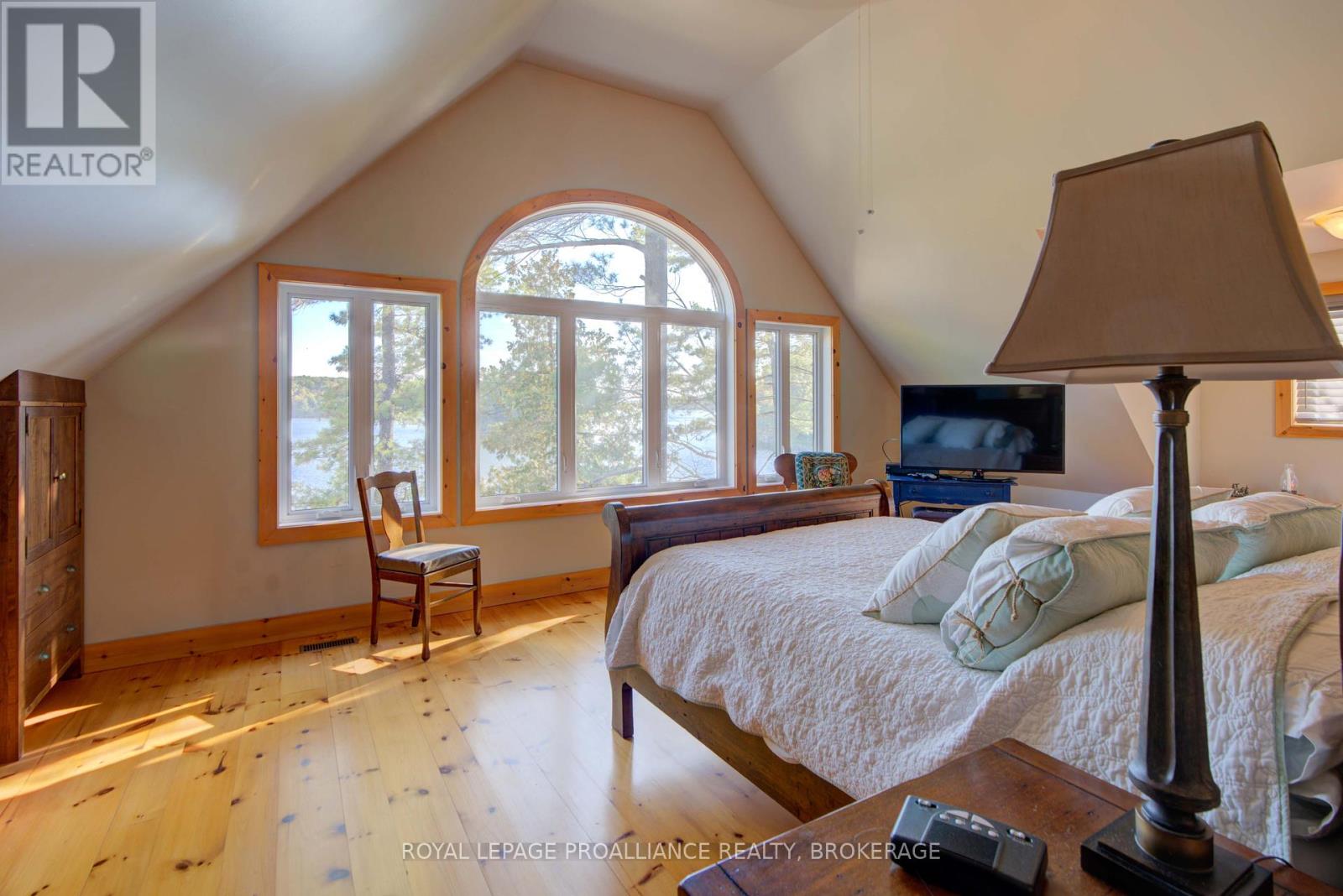Waterfront oasis on Buck Lake! This beautiful property features 2+ acres of land and200 ft of shoreline. This gorgeous home sits close to the lake with level access to shallow water and deep water off the dock. Enjoy the large dock, covered boat slip and tiki bar - with southern exposure for sunrises and sunsets. The view is stunning looking out over the bay and the location is private & peaceful. As you enter under the timber frame porch, you immediately feel a sense of relaxation in this stunning lake house. The main floor has a large, open concept Great Room with expansive windows and access out to the deck. The custom Corelle Kitchen is a showpiece with Madagascar blue granite countertops, dbl drawer dishwasher, under-counter microwave and a pot filler above the propane stove. Enjoy cozy evenings with the warmth of the Pacific Energy wood-stove. The main floor bedroom has an attached 4-pc bath that also has access from the foyer. The office next to the foyer could be another bedroom. The bathrooms and foyer have heated slate floors while the balance of the home has wide-plank pine flooring - from trees on the property! The second level features a large bedroom at the rear, laundry area and an amazing primary bedroom with cathedral ceilings, custom cabinets, a 3-piece ensuite bath and gorgeous views over the pristine waters of the lake. The partial basement has concrete floor & spray foam walls and the home is heated by propane forced air, has 200-amp service, a lake water system with UV light, Hide-A-Hose central vacuum, HRV, electric hot water, A/C and an on-demand backup generator system. A catwalk leads from the house to extra living space above the 2-car detached garage. This space has a large family room, dining area, kitchenette along with a bedroom and a 2-piece bath. The exterior of the home and garage have vertical Timberthane wood siding with a lifetime guarantee. Stunning home located just south of Westport or 40minutes north of Kingston. (id:29295)