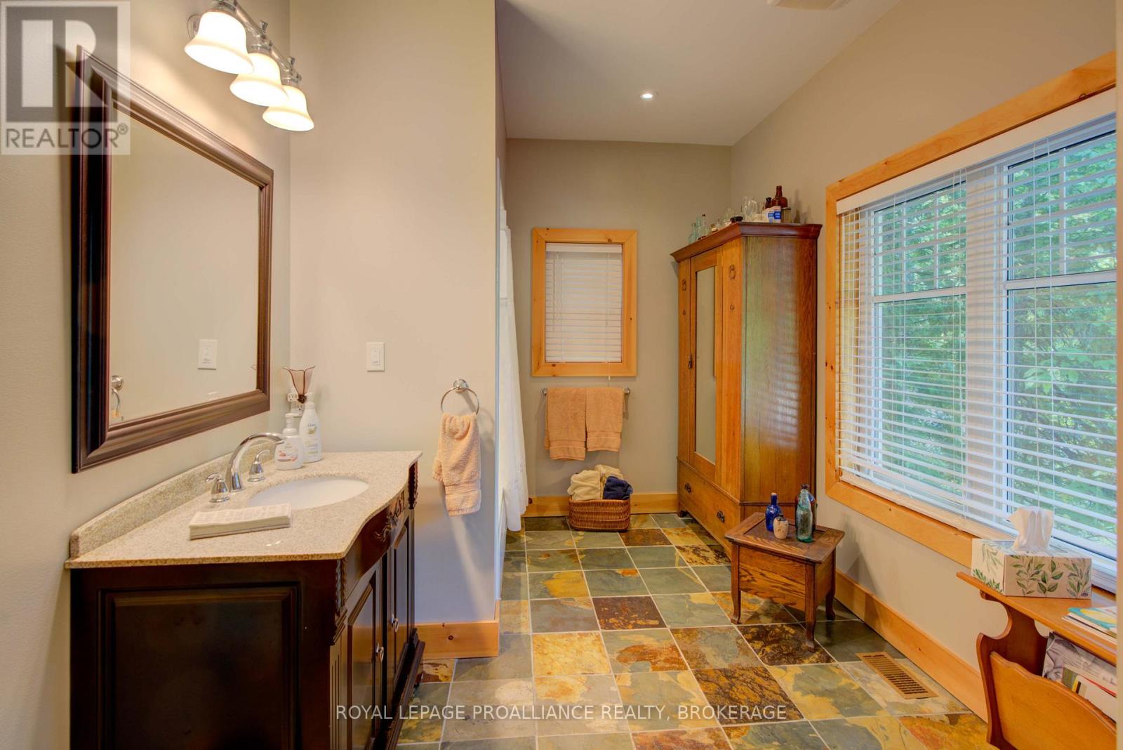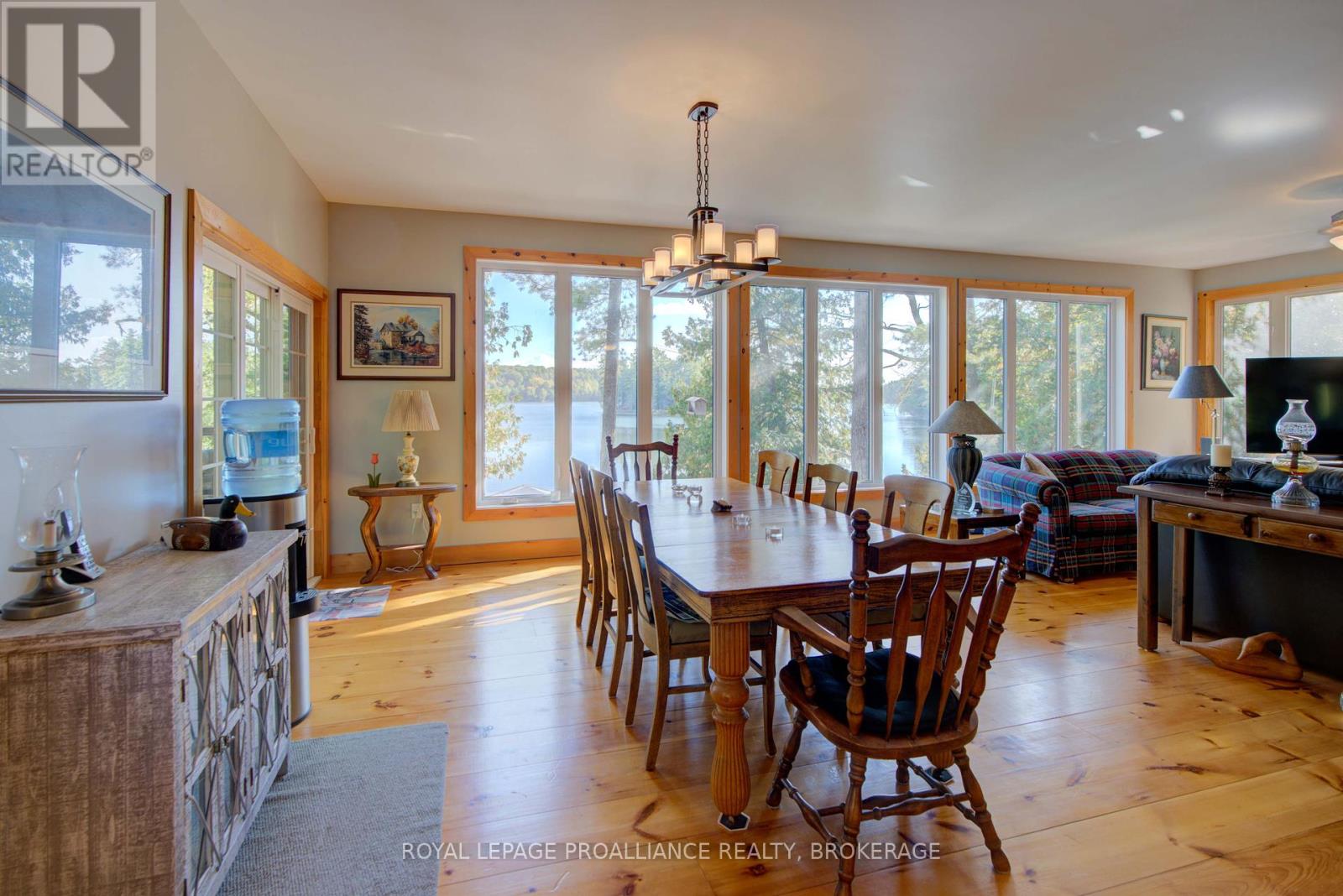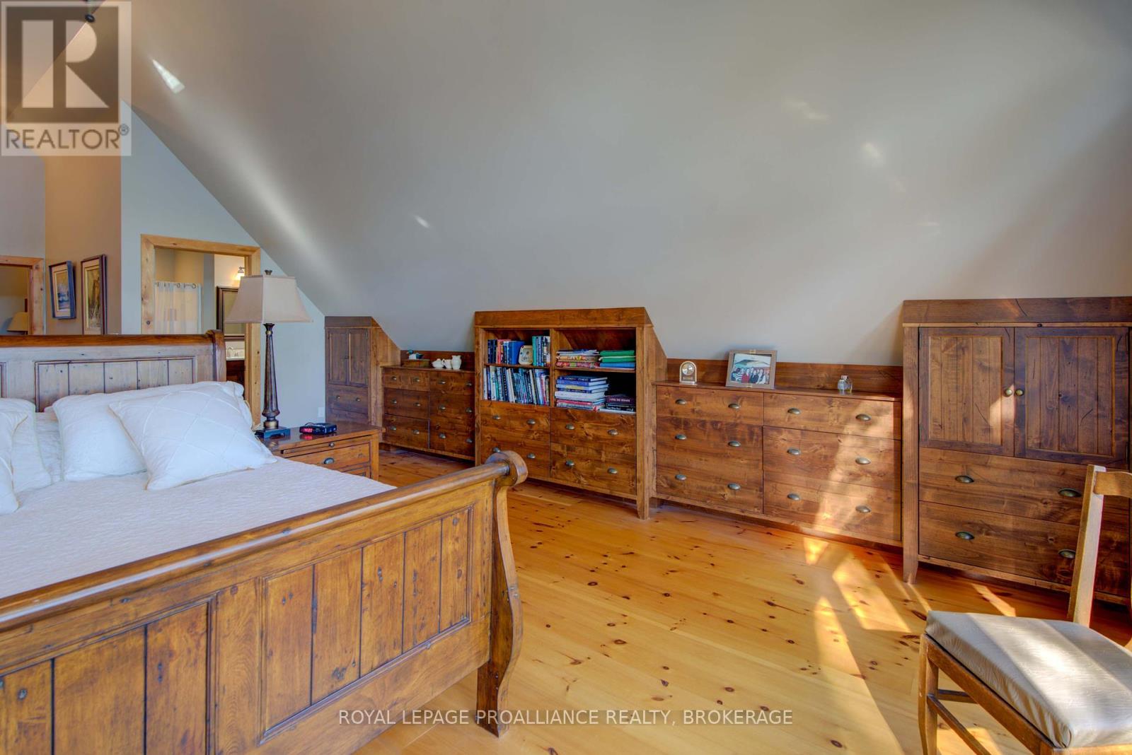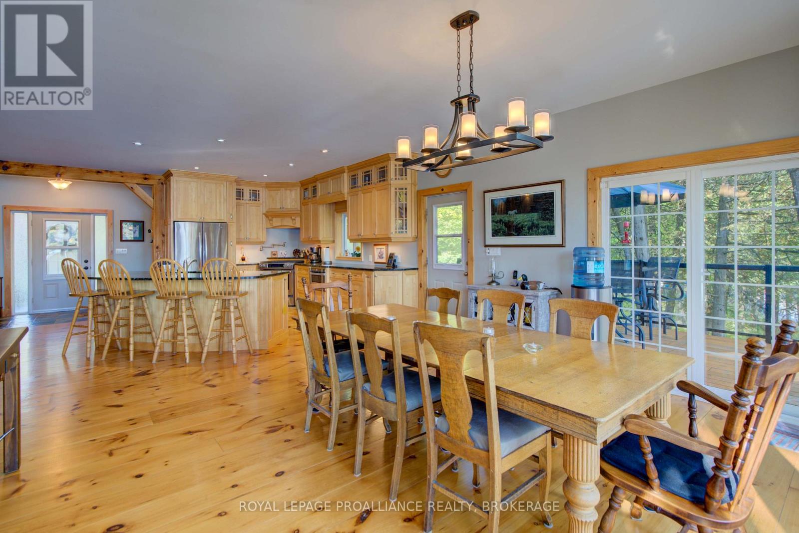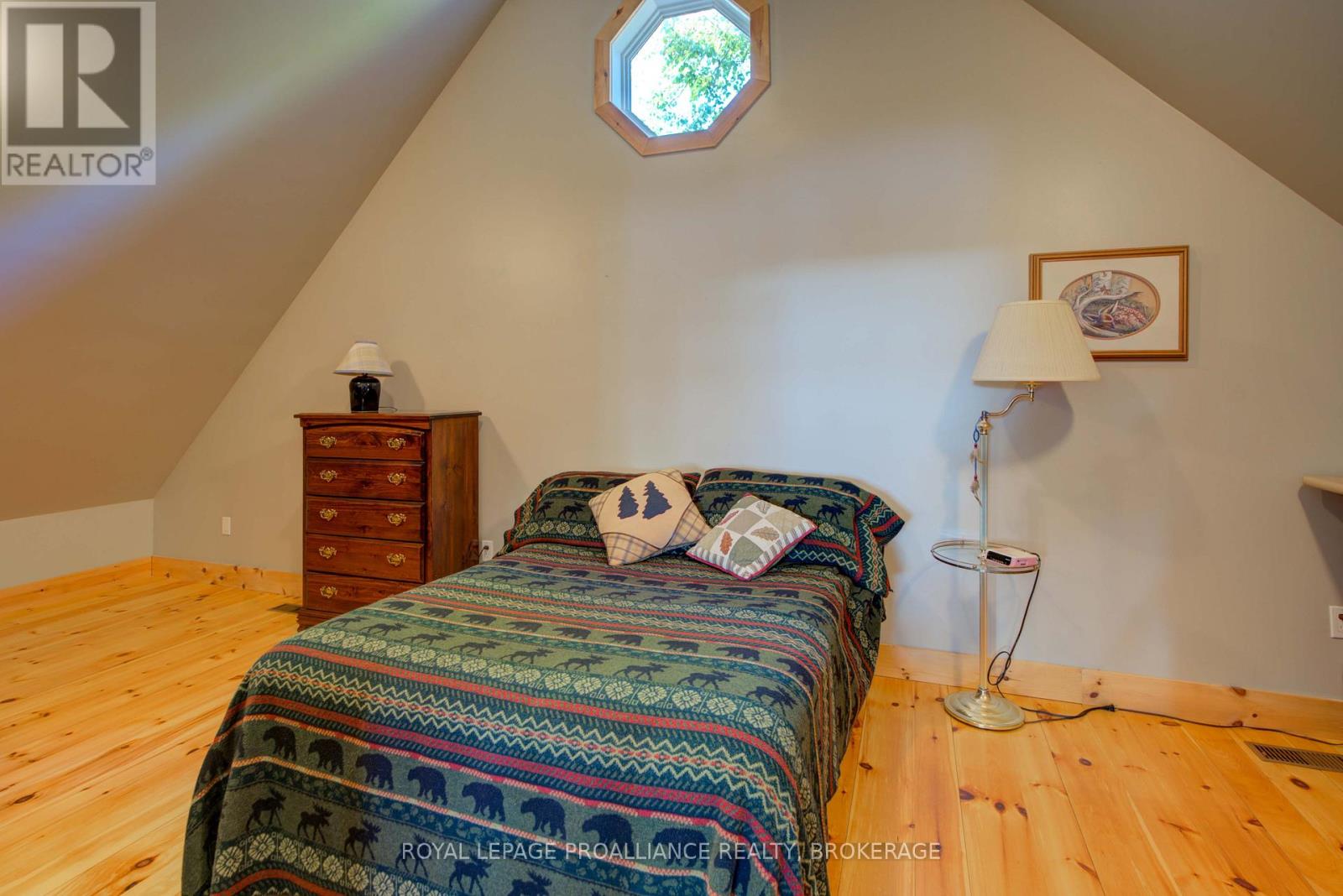 Waterfront oasis on Buck Lake! This beautiful property features 2+ acres of land and200 ft of shoreline. This gorgeous home sits close to the lake with level access to shallow water and deep water off the dock. Enjoy the large dock, covered boat slip and tiki bar - with southern exposure for sunrises and sunsets. The view is stunning looking out over the bay and the location is private & peaceful. As you enter under the timber frame porch, you immediately feel a sense of relaxation in this stunning lake house. The main floor has a large, open concept Great Room with expansive windows and access out to the deck. The custom Corelle Kitchen is a showpiece with Madagascar blue granite countertops, dbl drawer dishwasher, under-counter microwave and a pot filler above the propane stove. Enjoy cozy evenings with the warmth of the Pacific Energy wood-stove. The main floor bedroom has an attached 4-pc bath that also has access from the foyer. The office next to the foyer could be another bedroom. The bathrooms and foyer have heated slate floors while the balance of the home has wide-plank pine flooring - from trees on the property! The second level features a large bedroom at the rear, laundry area and an amazing primary bedroom with cathedral ceilings, custom cabinets, a 3-piece ensuite bath and gorgeous views over the pristine waters of the lake. The partial basement has concrete floor & spray foam walls and the home is heated by propane forced air, has 200-amp service, a lake water system with UV light, Hide-A-Hose central vacuum, HRV, electric hot water, A/C and an on-demand backup generator system. A catwalk leads from the house to extra living space above the 2-car detached garage. This space has a large family room, dining area, kitchenette along with a bedroom and a 2-piece bath. The exterior of the home and garage have vertical Timberthane wood siding with a lifetime guarantee. Stunning home located just south of Westport or 40minutes north of Kingston. (id:29295)