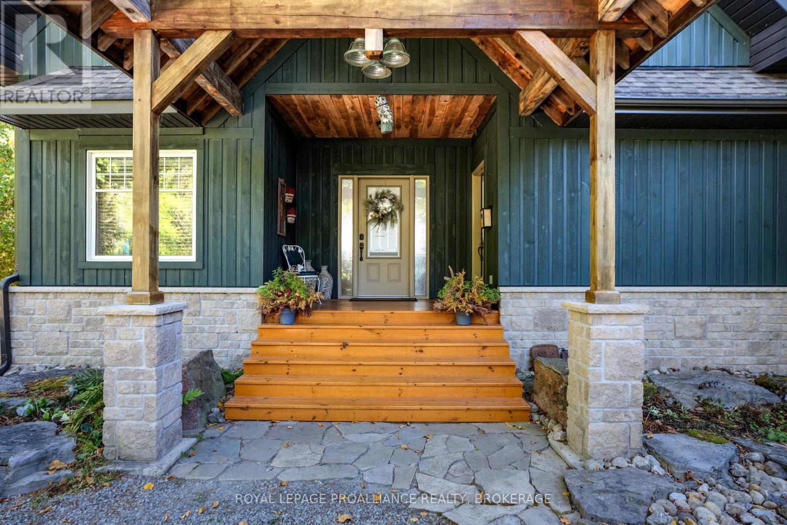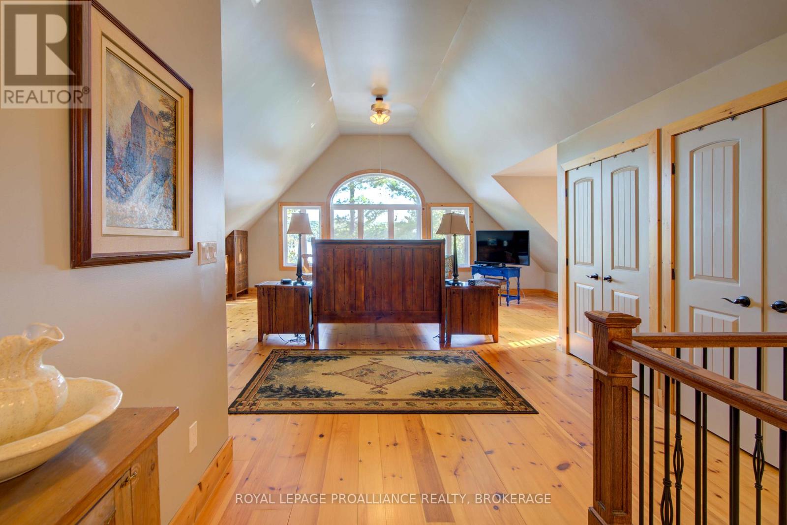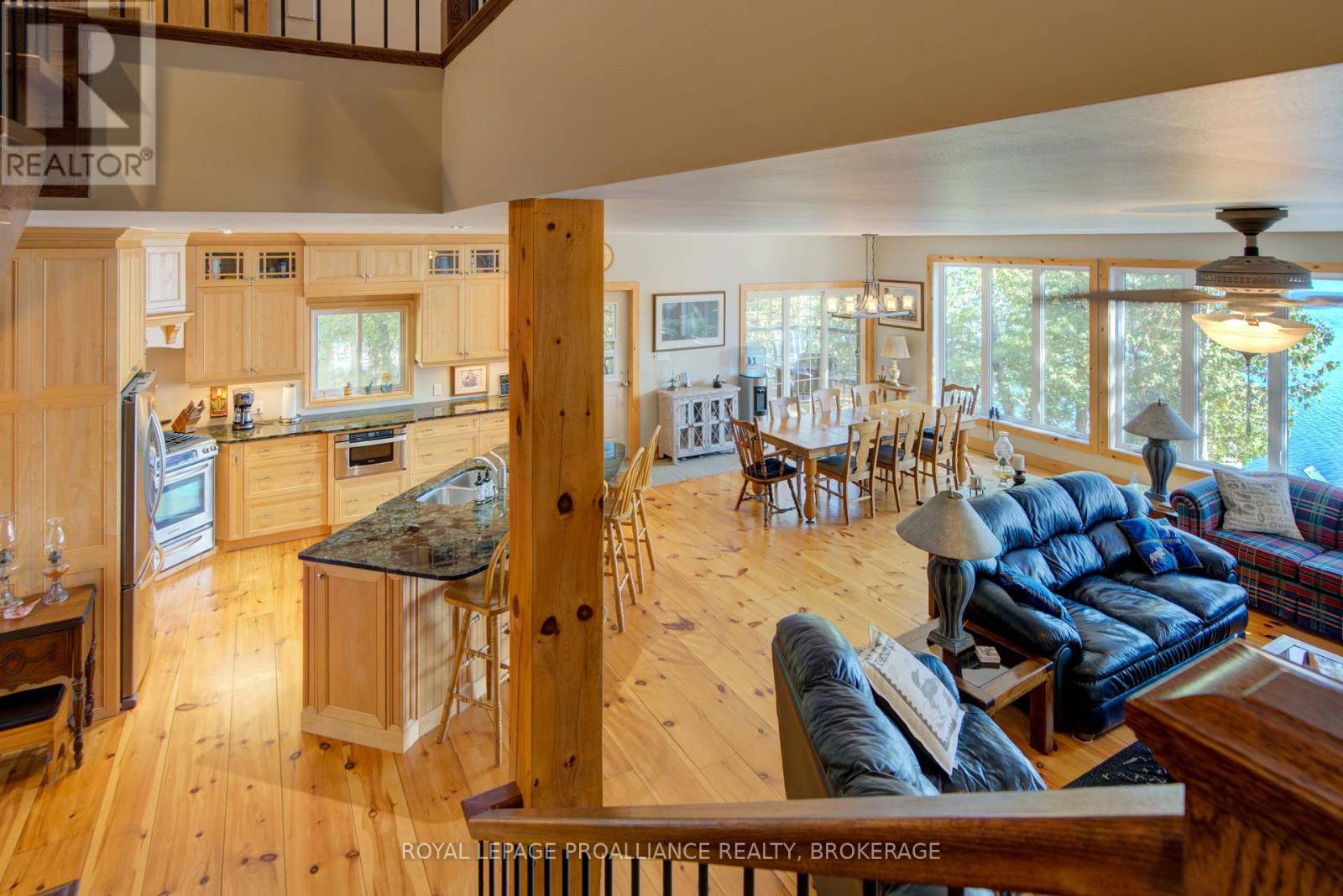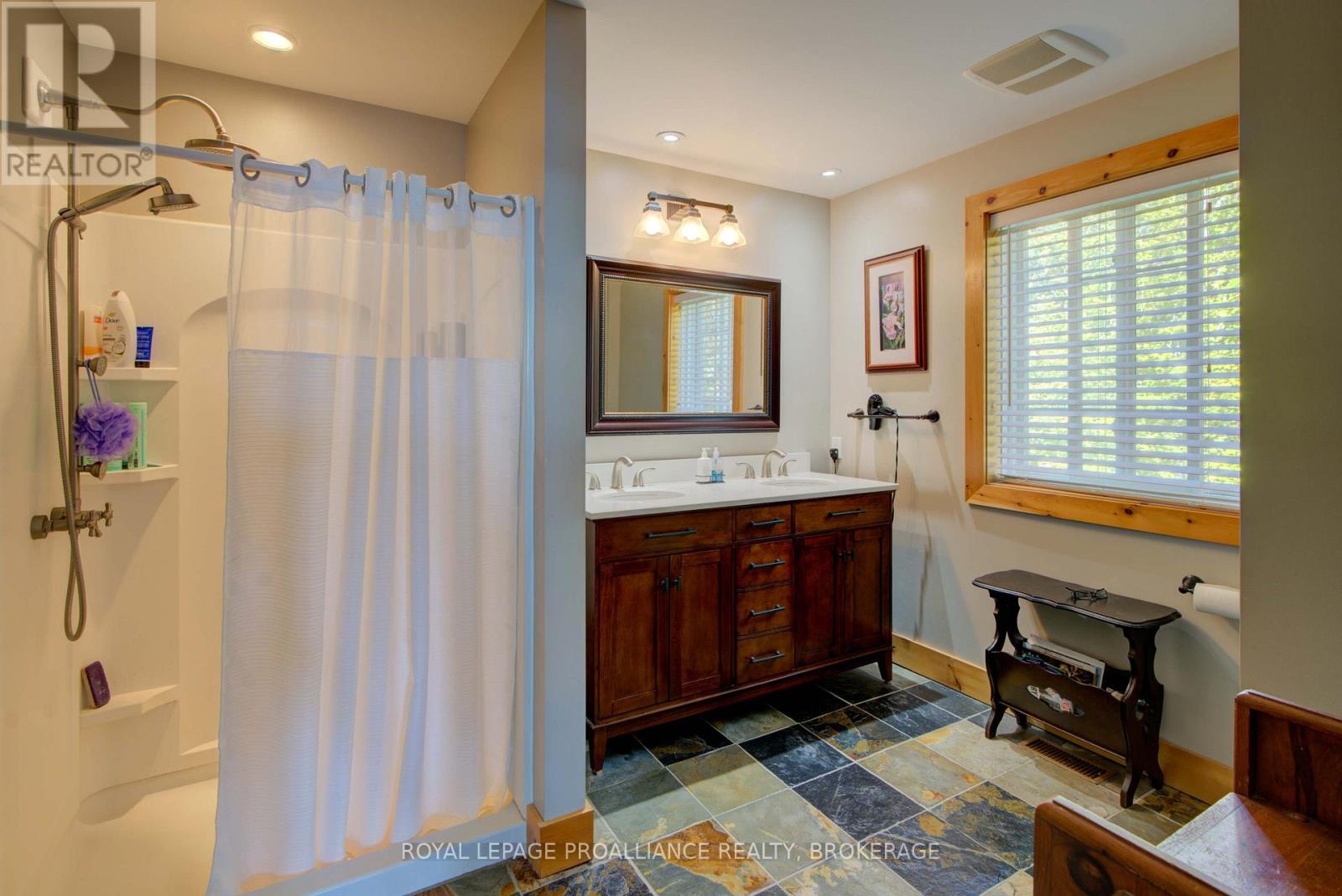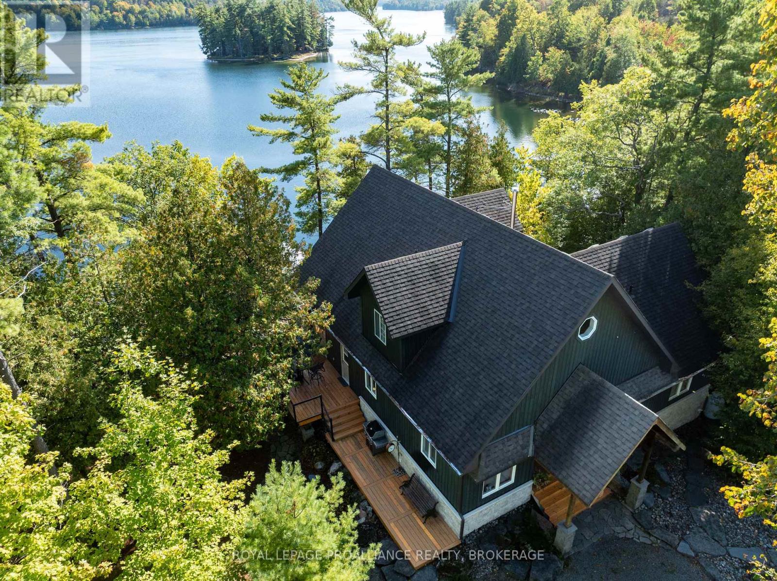 Waterfront oasis on Buck Lake! This beautiful property features 2+ acres of land and200 ft of shoreline. This gorgeous home sits close to the lake with level access to shallow water and deep water off the dock. Enjoy the large dock, covered boat slip and tiki bar - with southern exposure for sunrises and sunsets. The view is stunning looking out over the bay and the location is private & peaceful. As you enter under the timber frame porch, you immediately feel a sense of relaxation in this stunning lake house. The main floor has a large, open concept Great Room with expansive windows and access out to the deck. The custom Corelle Kitchen is a showpiece with Madagascar blue granite countertops, dbl drawer dishwasher, under-counter microwave and a pot filler above the propane stove. Enjoy cozy evenings with the warmth of the Pacific Energy wood-stove. The main floor bedroom has an attached 4-pc bath that also has access from the foyer. The office next to the foyer could be another bedroom. The bathrooms and foyer have heated slate floors while the balance of the home has wide-plank pine flooring - from trees on the property! The second level features a large bedroom at the rear, laundry area and an amazing primary bedroom with cathedral ceilings, custom cabinets, a 3-piece ensuite bath and gorgeous views over the pristine waters of the lake. The partial basement has concrete floor & spray foam walls and the home is heated by propane forced air, has 200-amp service, a lake water system with UV light, Hide-A-Hose central vacuum, HRV, electric hot water, A/C and an on-demand backup generator system. A catwalk leads from the house to extra living space above the 2-car detached garage. This space has a large family room, dining area, kitchenette along with a bedroom and a 2-piece bath. The exterior of the home and garage have vertical Timberthane wood siding with a lifetime guarantee. Stunning home located just south of Westport or 40minutes north of Kingston. (id:29295)