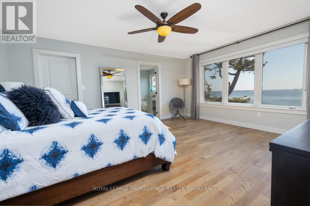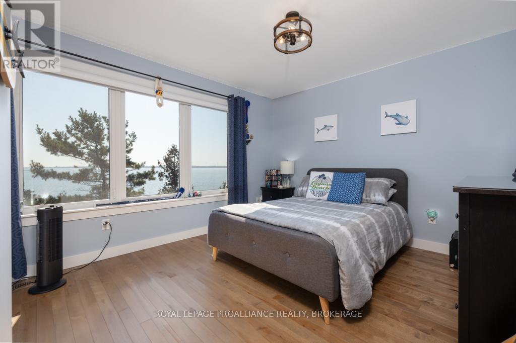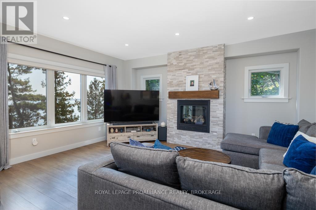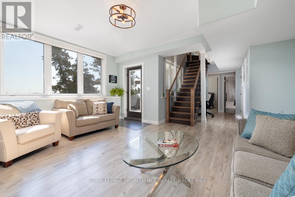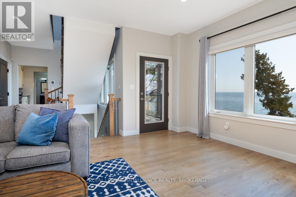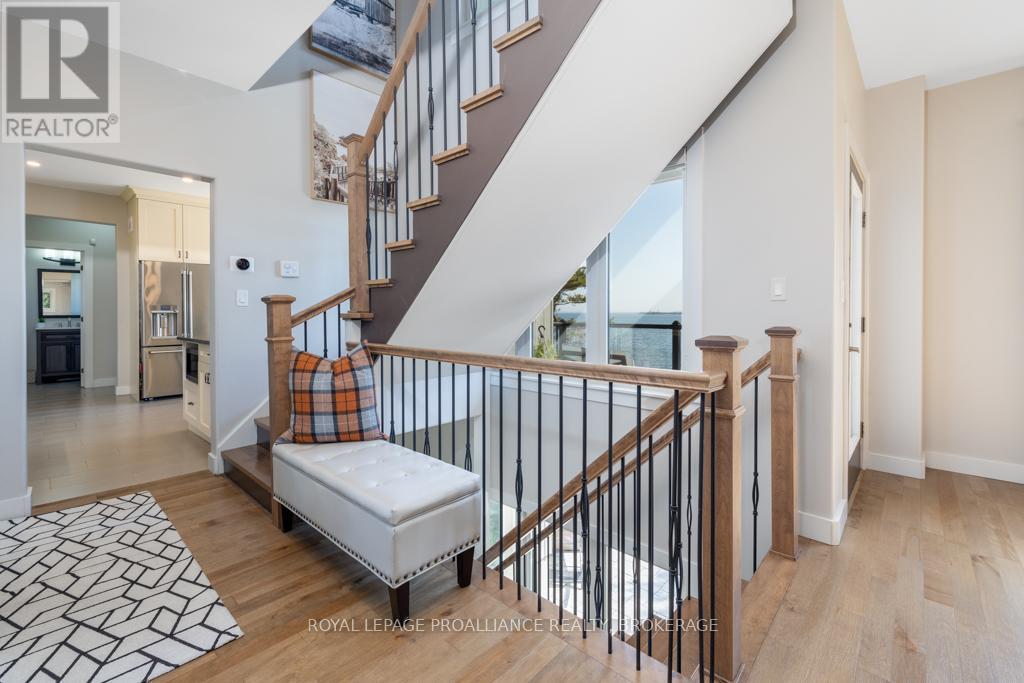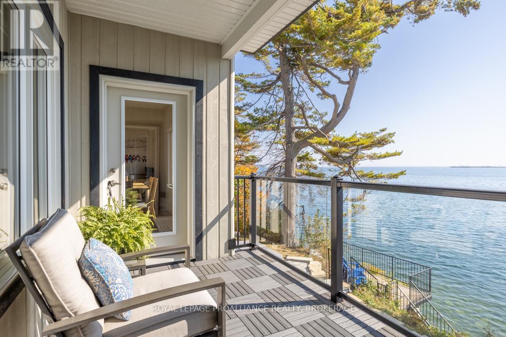 Welcome to your dream home on the shores of Lake Ontario-- where stunning design meets serene natural beauty. This West Coast inspired residence offers nearly 2200 square feet of living space & jaw dropping views from nearly every room. Step into a thoughtfully laid out, light filled interior featuring 3 bedrooms and 3.5 bathrooms. The large kitchen and dining room flows into a warm, inviting living room with propane fireplace and walk-out to a water facing deck, perfect for relaxing with your favourite book. The main floor also features a powder room and laundry/mudroom. The expansive primary bedroom is a true sanctuary, boasting its ow private deck overlooking the lake, a spa-like ensuite with double sinks, glass shower, and stand alone tub, and a walk-in closet. The second upstairs bedroom also features its own ensuite, ideal for family or guests. The finished lower level includes a bedroom & bathroom and spacious family room with walk-out to a large stone patio with fire pit area. Enjoy direct access to the water via a charming lookout/landing & stairs that lead straight into the lake-- swimming, kayaking, and sunsets await. All the benefits of waterfront living with the convenience of city services-- no septic or well worries here. Ideally located just minutes west of Kingston, with a marina just down the road and an easy commute to area shopping, downtown, hospitals, Queen's University, and St. Lawrence College. This is more than a home-- it's a lifestyle. Book your private showing today. (id:29295)