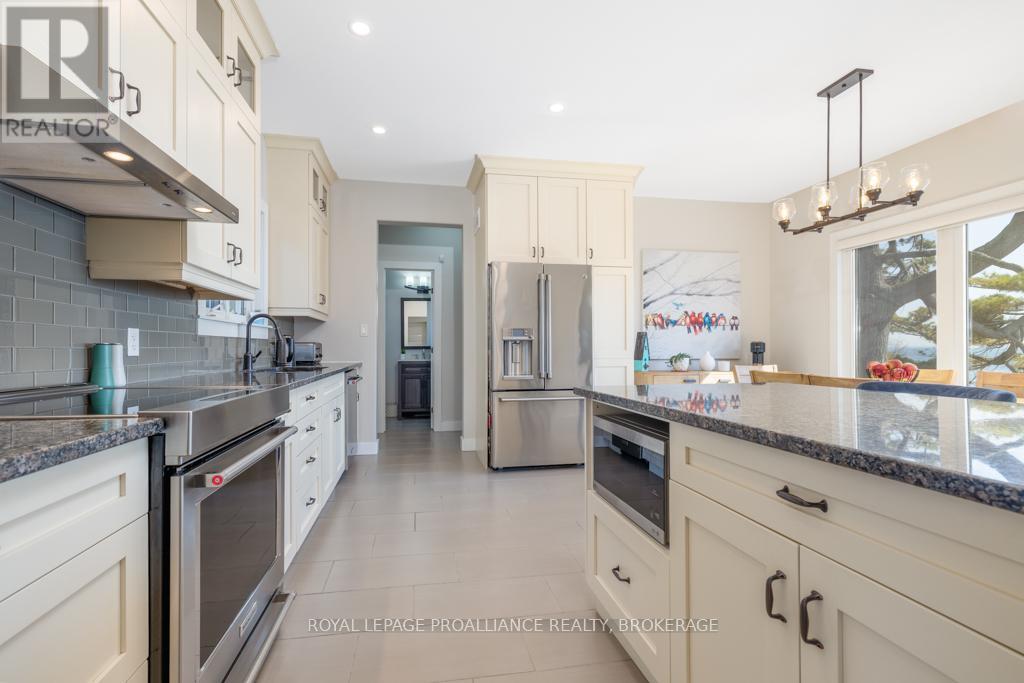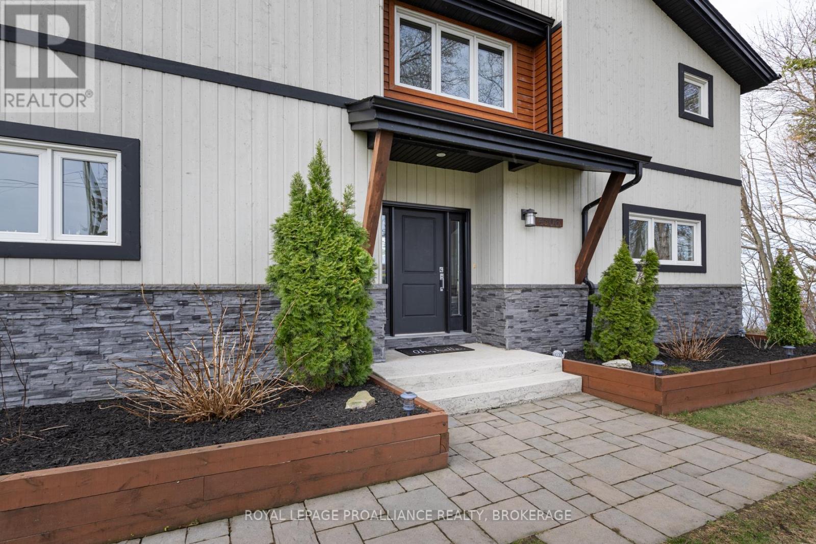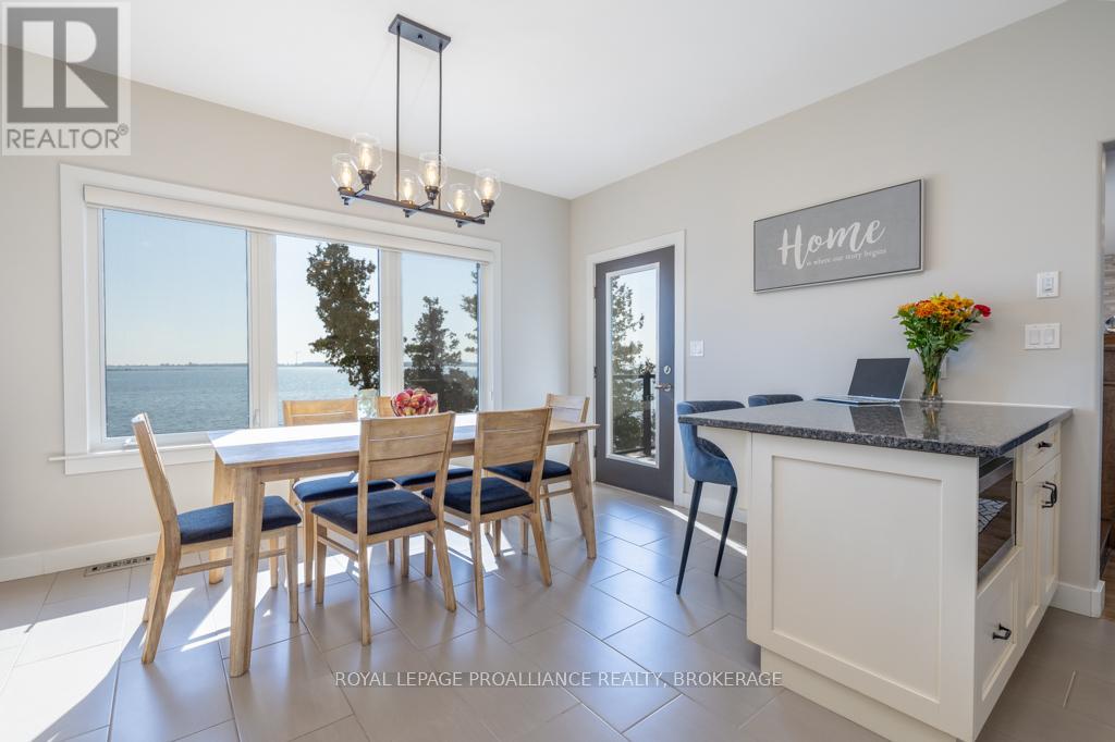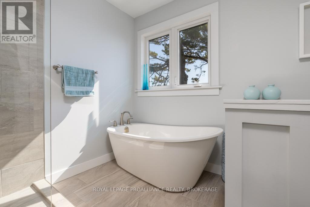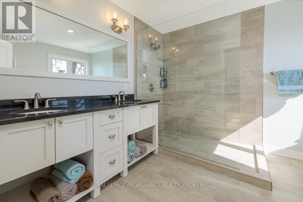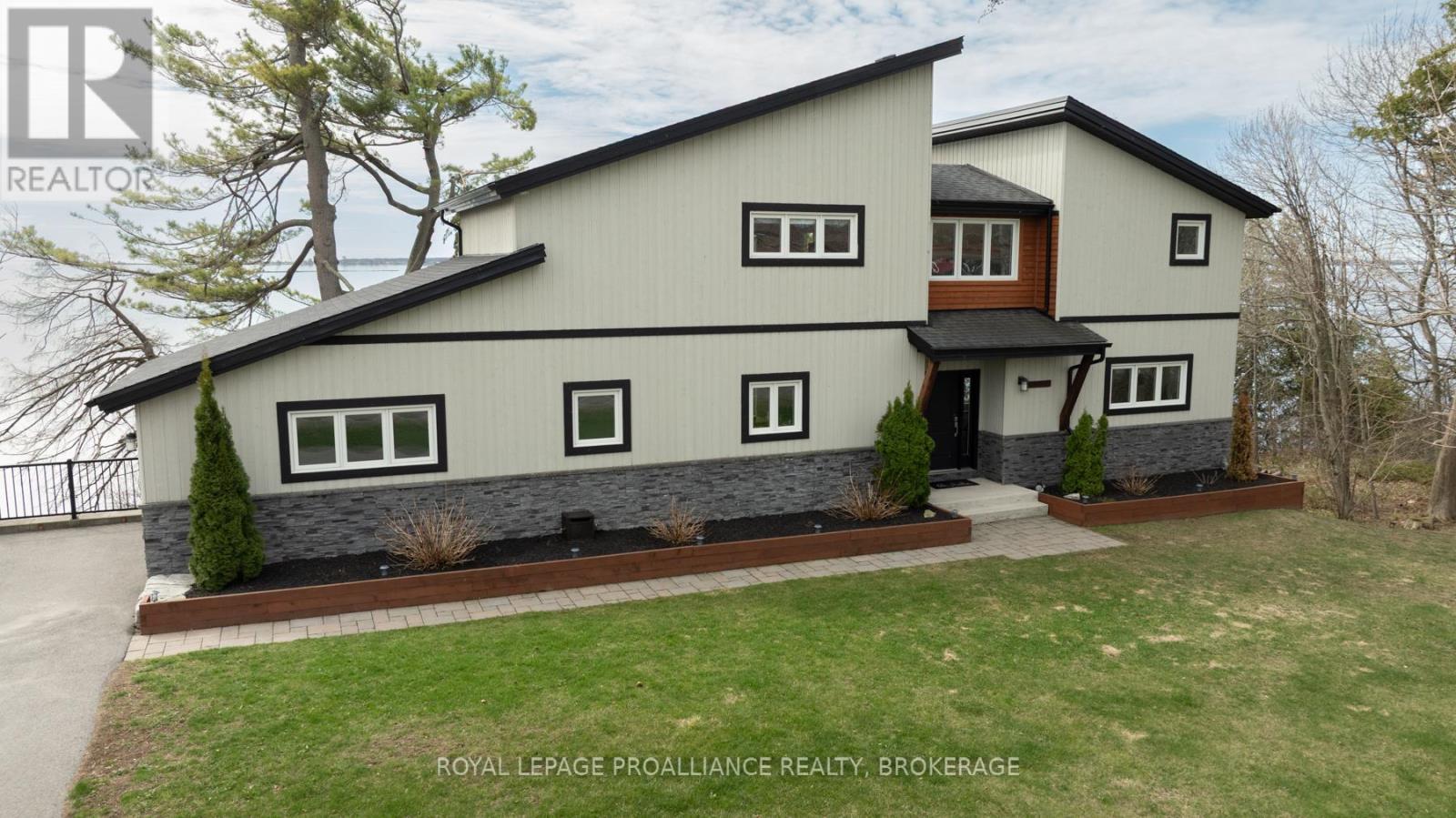 Welcome to your dream home on the shores of Lake Ontario-- where stunning design meets serene natural beauty. This West Coast inspired residence offers nearly 2200 square feet of living space & jaw dropping views from nearly every room. Step into a thoughtfully laid out, light filled interior featuring 3 bedrooms and 3.5 bathrooms. The large kitchen and dining room flows into a warm, inviting living room with propane fireplace and walk-out to a water facing deck, perfect for relaxing with your favourite book. The main floor also features a powder room and laundry/mudroom. The expansive primary bedroom is a true sanctuary, boasting its ow private deck overlooking the lake, a spa-like ensuite with double sinks, glass shower, and stand alone tub, and a walk-in closet. The second upstairs bedroom also features its own ensuite, ideal for family or guests. The finished lower level includes a bedroom & bathroom and spacious family room with walk-out to a large stone patio with fire pit area. Enjoy direct access to the water via a charming lookout/landing & stairs that lead straight into the lake-- swimming, kayaking, and sunsets await. All the benefits of waterfront living with the convenience of city services-- no septic or well worries here. Ideally located just minutes west of Kingston, with a marina just down the road and an easy commute to area shopping, downtown, hospitals, Queen's University, and St. Lawrence College. This is more than a home-- it's a lifestyle. Book your private showing today. (id:29295)