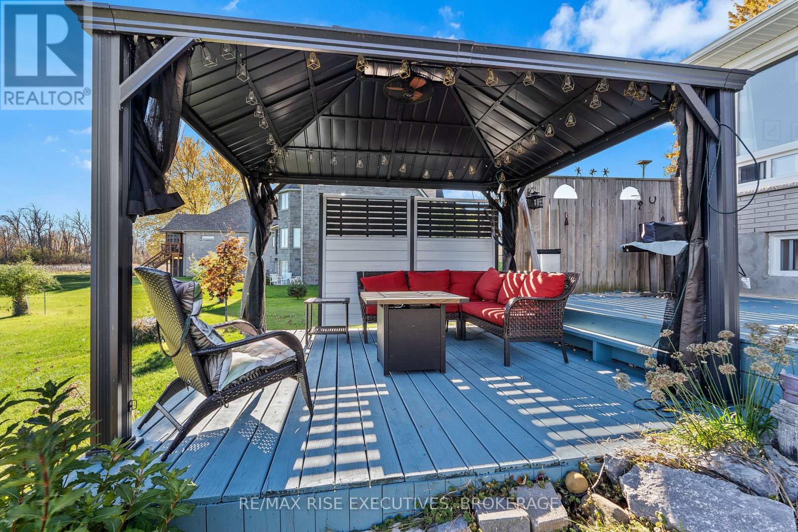 Experience exceptional waterfront living on the beautiful Napanee River, offering panoramic views, calm waters, and a rare flat, gently sloping property leading right to the shoreline. Enjoy the peace and privacy of riverfront life while still being within town limits and on full municipal services-including natural gas, a rare feature for waterfront properties. Step inside to an inviting open-concept layout designed to maximize water views. The spacious living and dining area flows openly to the outdoors, creating a seamless connection to nature. Floor-to-ceiling windows frame the river, and a cozy gas fireplace adds warmth and ambiance. This home features 3 bedrooms on the main level and 2 additional bedrooms in the lower level, offering excellent in-law suite potential with a private walk-down entry from the garage. The attached two-car garage provides convenience and ample storage. Outside, a large two-tier deck with a covered gazebo offers the perfect setting for relaxing, entertaining, or dining while overlooking the water-a true extension of your living space, morning through evening. (id:29295)