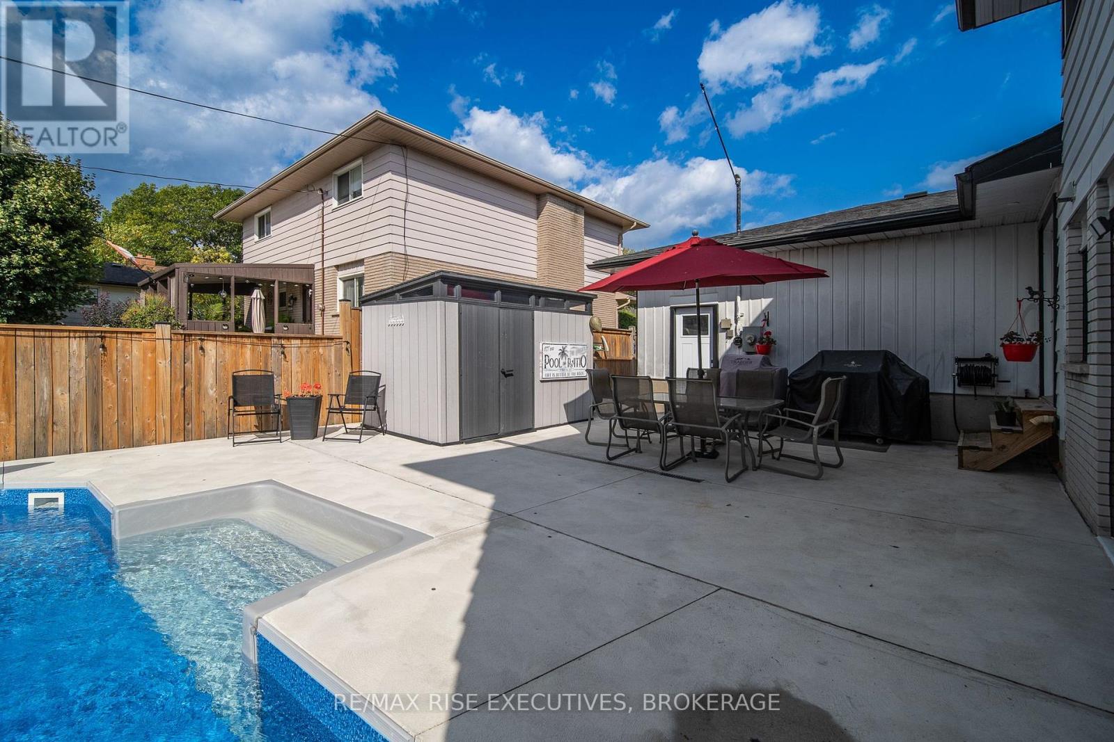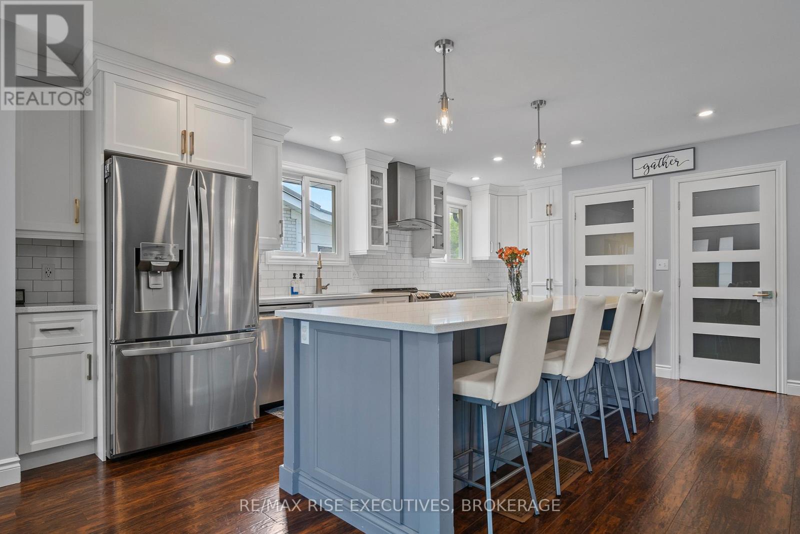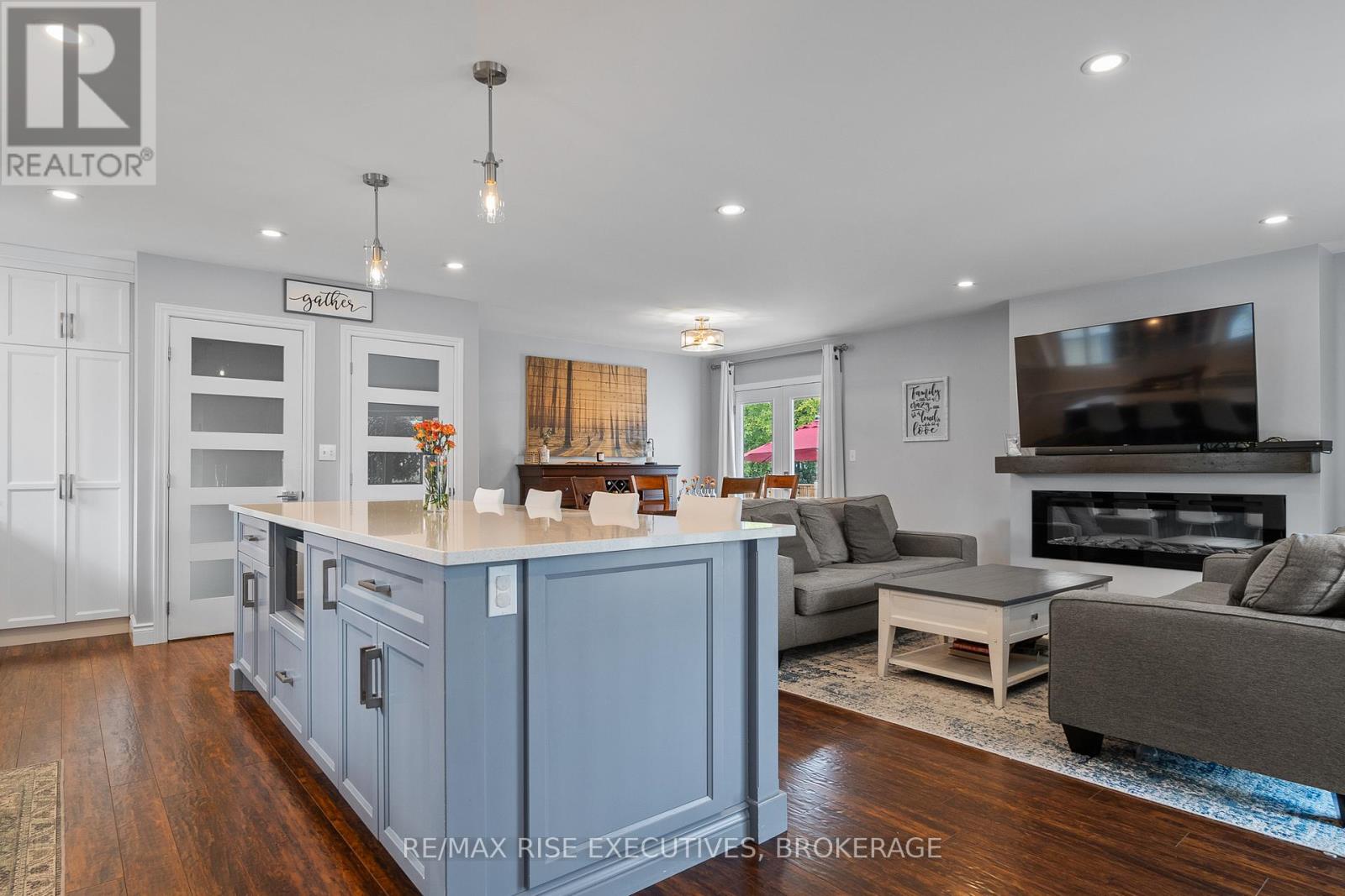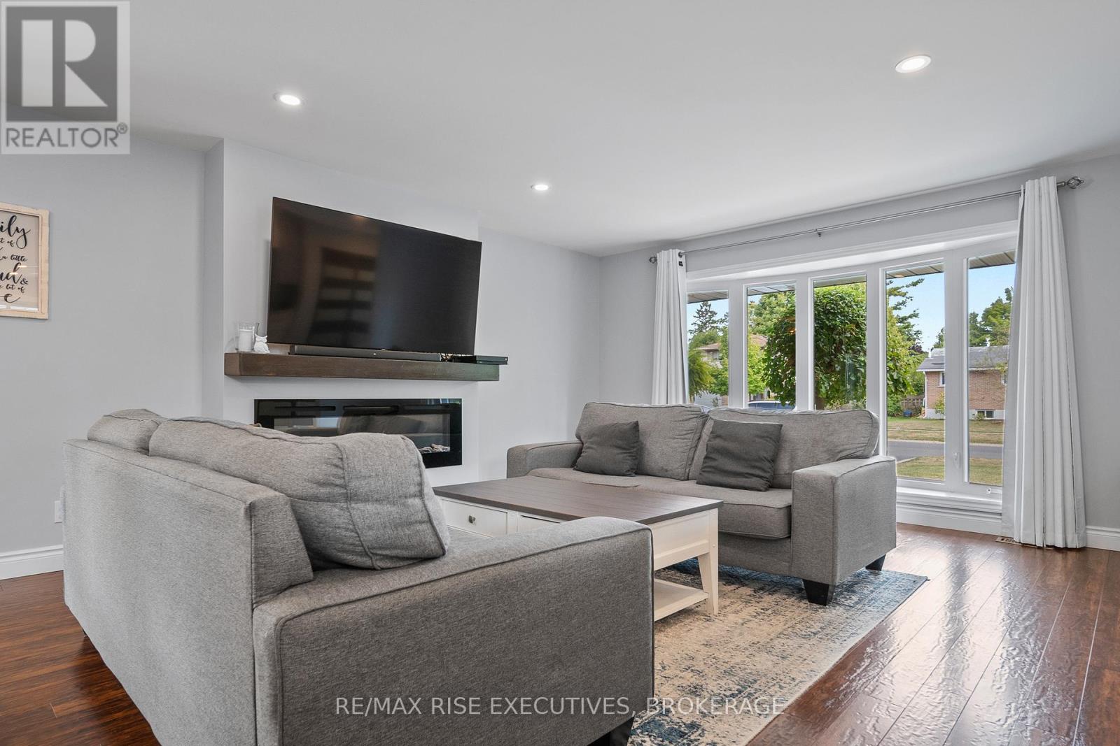 693 Laidlaw Crescent is a beautifully updated back-split on a sought-after, quiet crescent in Kingston's west end, offering the perfect blend of modern style, thoughtful upgrades, and family-friendly living. Designed for today's lifestyle, the open-concept main level is filled with natural light and features pot lighting throughout, along with a sleek electric fireplace that serves as a stunning focal point. The renovated kitchen showcases quartz countertops, crisp white cabinetry, stainless steel appliances, a subway tile backsplash, and a massive centre island with breakfast bar seating - ideal for entertaining or busy family mornings. Upstairs, the space offers three spacious bedrooms and a beautifully renovated five-piece main bathroom featuring double sinks. The fully finished lower level includes a cozy rec room with a natural gas fireplace, an additional bedroom, an updated lower-level bathroom, and a direct walkout to the backyard, providing flexible space for guests or potential in-law suite opportunities. Step outside to your private backyard retreat featuring a fully upgraded in-ground saltwater pool with new liner, steps, surround, lighting, pump, plumbing, and pool shed (2022). A large patio, new wood fencing (2022), and no rear neighbours create a truly turnkey outdoor space designed for summer entertaining. A double-car garage and widened paved driveway provide ample parking. Extensive updates offer peace of mind, including 30-year shingles (2015), a repointed chimney, new windows throughout (2019), and a new front door, sliding door, and yard access door (2024). Located close to parks, schools, shopping, and amenities, this move-in-ready home is ideal for professionals or growing families seeking space, privacy, and long-term value in one of Kingston's most established neighbourhoods. Schedule your viewing today! (id:29295)