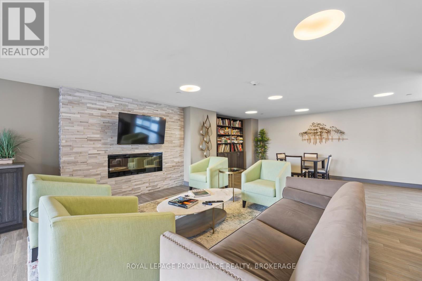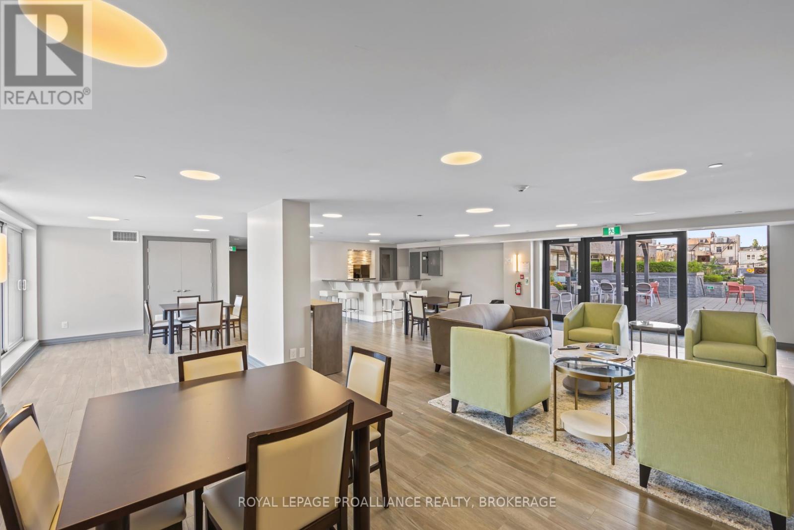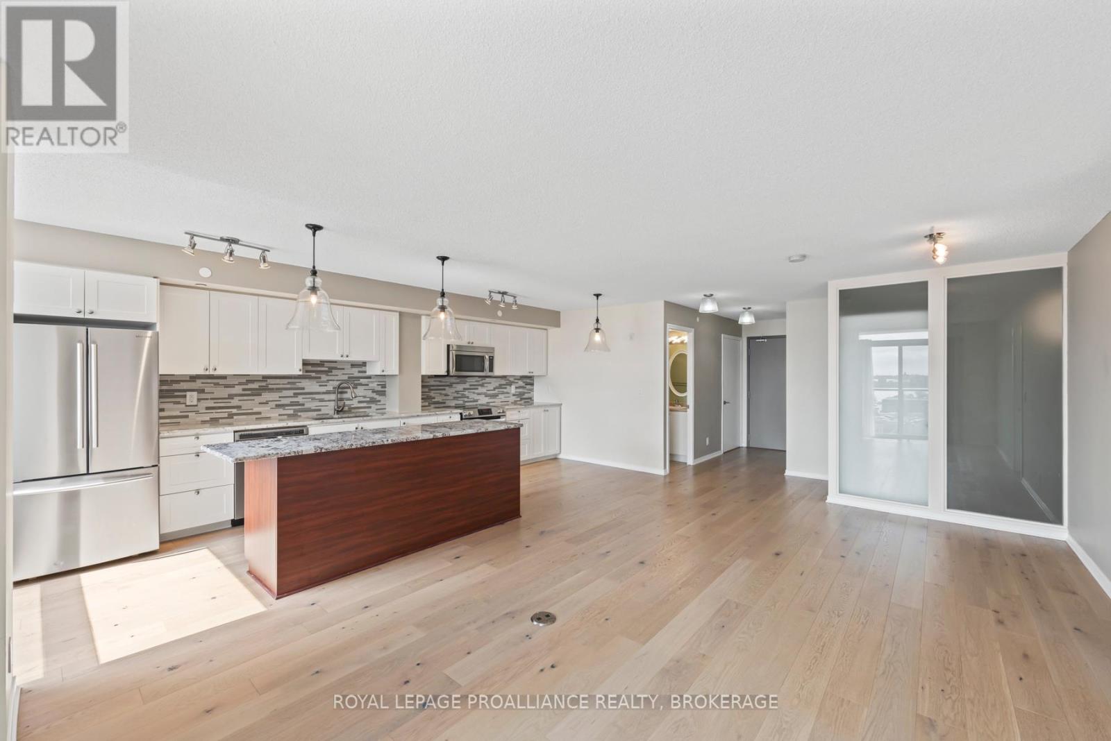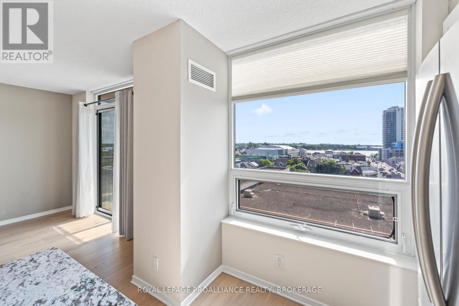 Up on the 7th floor, facing the water, with a view that stretches across downtown Kingston to the inner harbour and beyond. It's the kind of perspective that makes everything feel a little quieter, even in the middle of the city. This is one of the larger, and rarer layouts at Anna Lane-- open concept, with an extended kitchen that anchors the space perfectly. Two bedrooms, two full bathrooms, including a proper ensuite. The materials are solid: engineered oak underfoot, tile where it counts, granite where it makes sense. Laundry is in the unit, and parking is underground. But with a walk score of 94, you might find yourself walking everywhere instead. The building is secure, well-managed, and newer-- designed with shared terraces and common areas that actually feel good to spend time in. (id:29295)