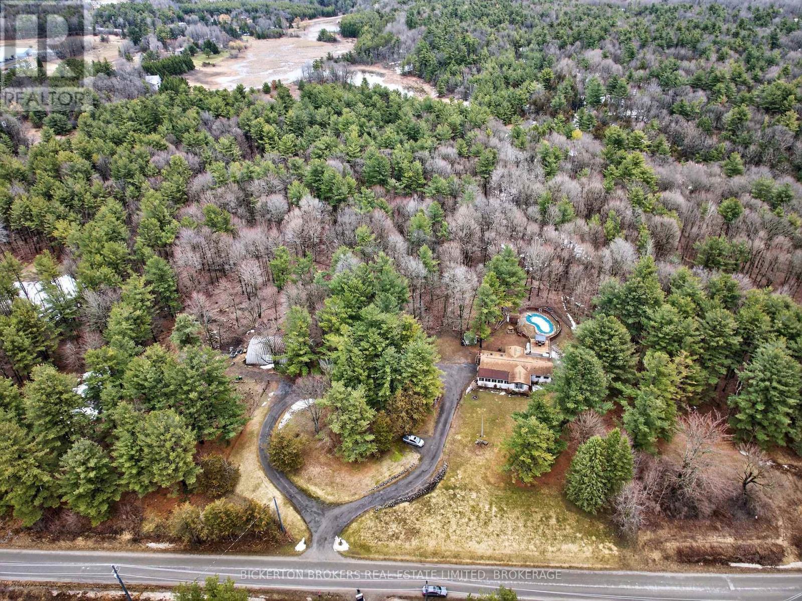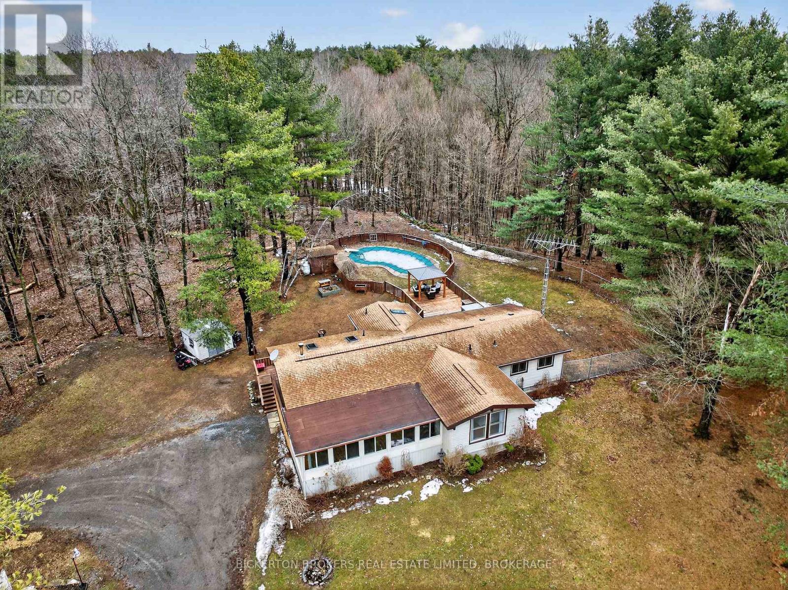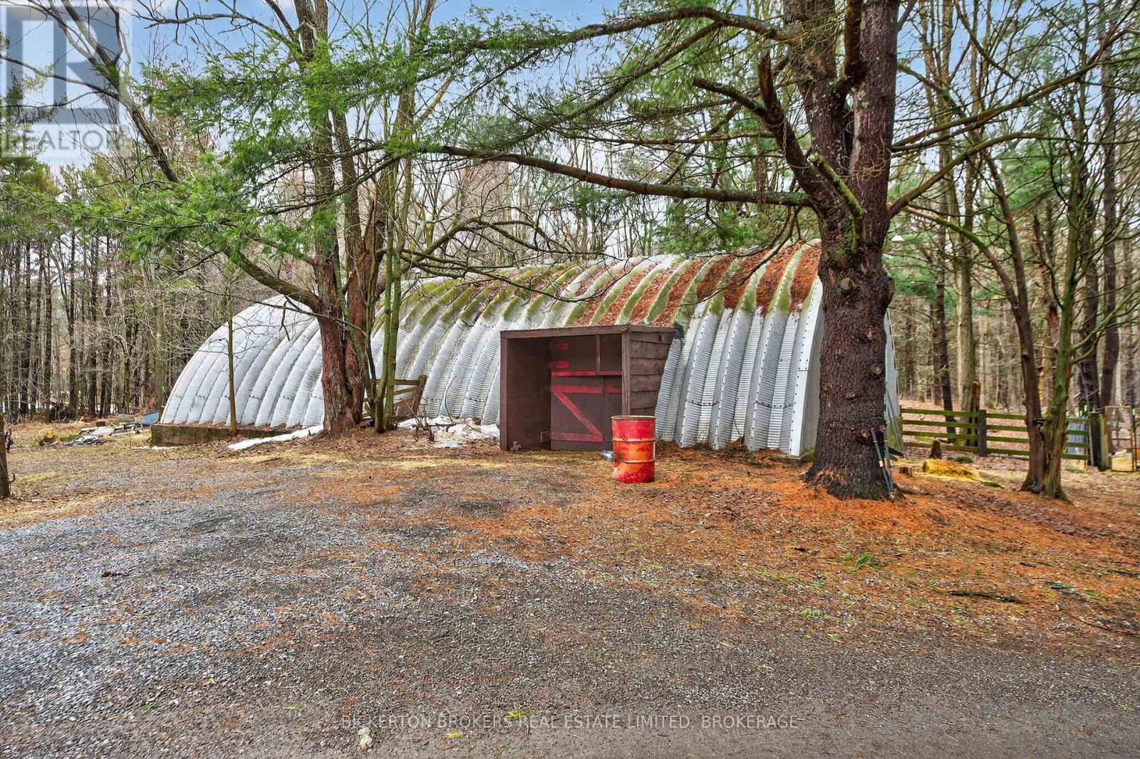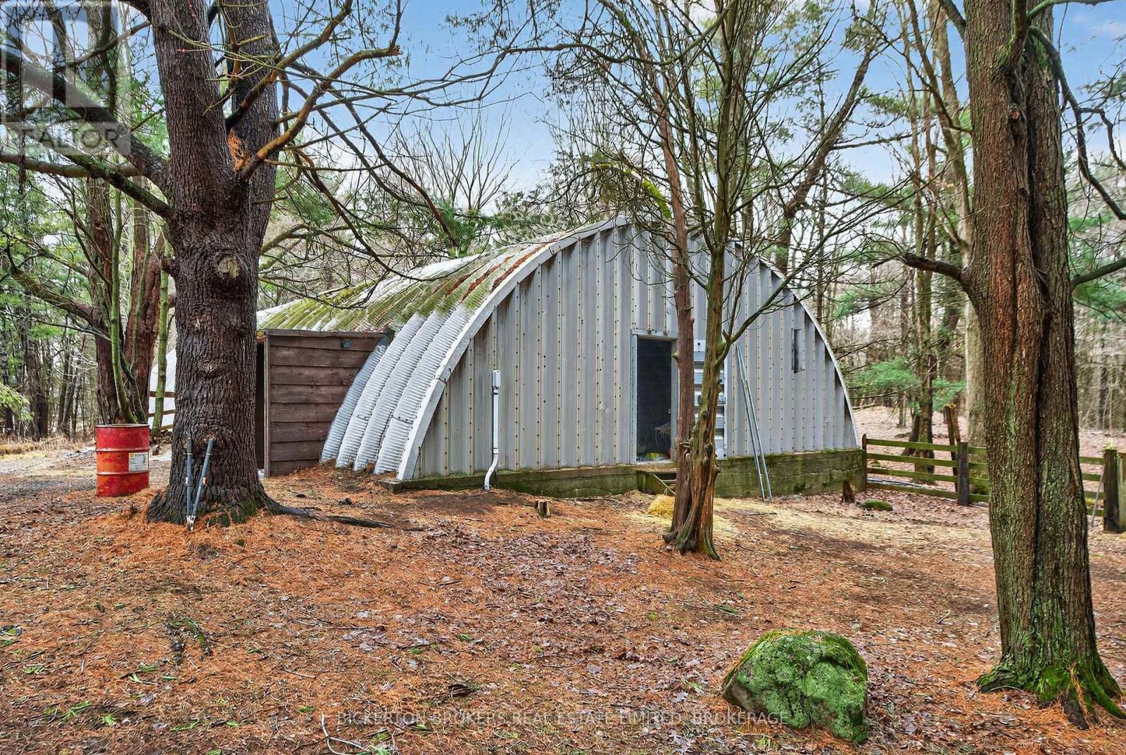 Nestled in the trees this 7-acre property has it all; conveniently located on a quiet road within walking distance to the 1000 Island Parkway waterfront trail, a marina, and a quick hop onto the 401 or to the bridge to the US. You have it all on one level with 2 bathrooms, 4 bedrooms, plus an office and large dedicated laundry room. An open concept kitchen, dining and living area takes advantage of the views and streams with sunlight. Vaulted ceilings make the space bright and airy a skylight adds even more light in the dining area. Lovely wood cabinetry in the kitchen with lots of storage and a handy breakfast bar or additional workspace. The living room is large, and light filled and you'll love to cozy up by the stove on those chilly nights. There is also a door for access to the wrap around deck. Outside there is plenty of room for all your hobbies to include a large shed with attached kennel or use as a chicken coop, a fenced area currently housed by chickens and a goat and to top it off a large steel Quonset hut that provides endless options. Maybe boat storage or it once was used for horses or a fabulous workshop equipped with power. To add to this paradise, you have a lovely in ground pool surrounded by decking that can handle all your entertaining or relaxing dreams. The pool and deck area are at the rear and offer complete privacy surrounded by your own woods. If you are a nature lover wildlife abounds at this gorgeous location. Nicely set back from the road and featuring a circular driveway. Do not miss out on this! (id:29295)