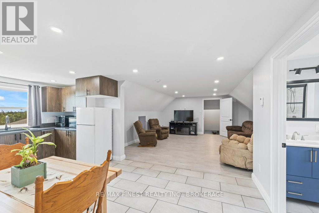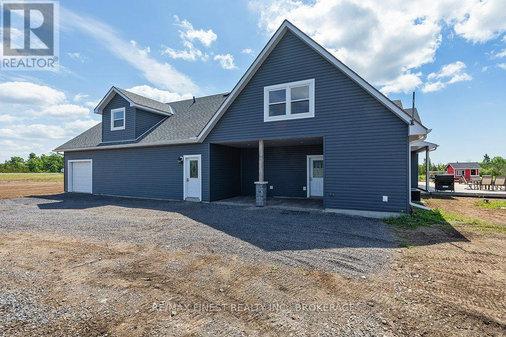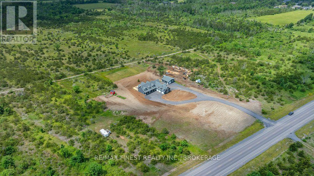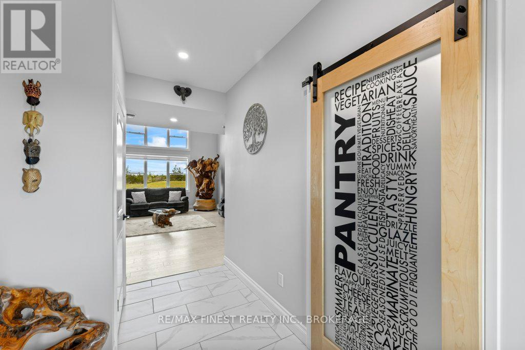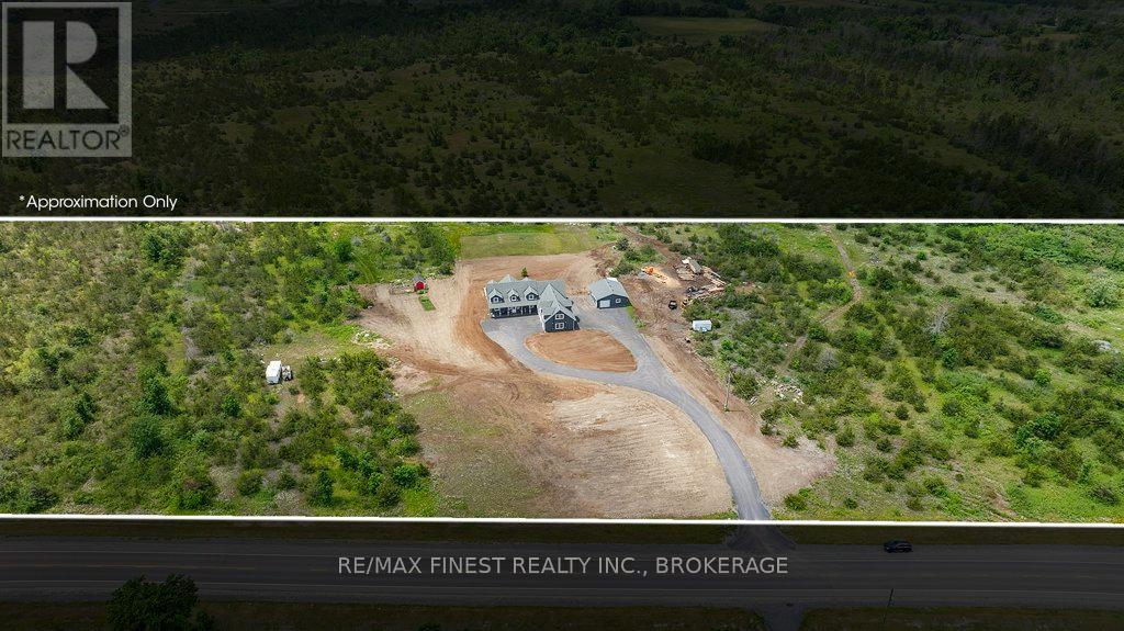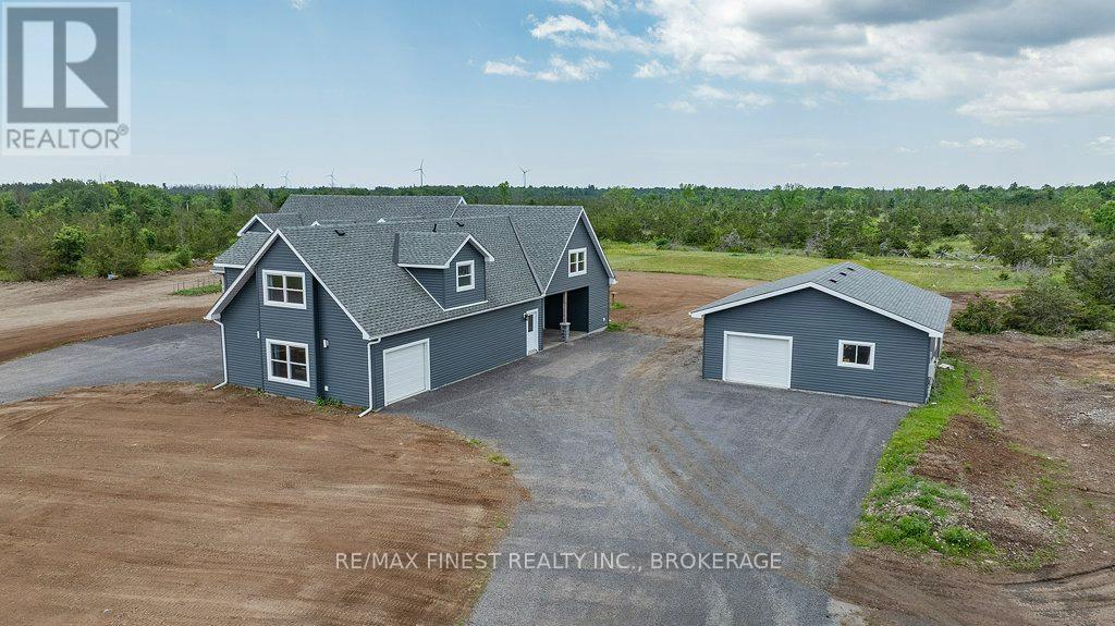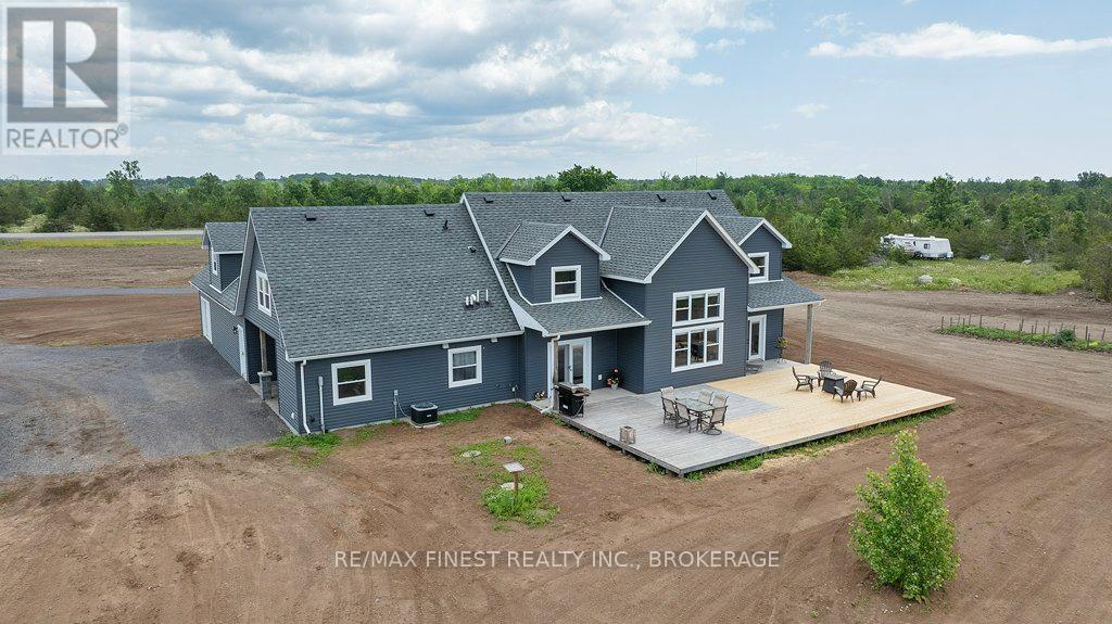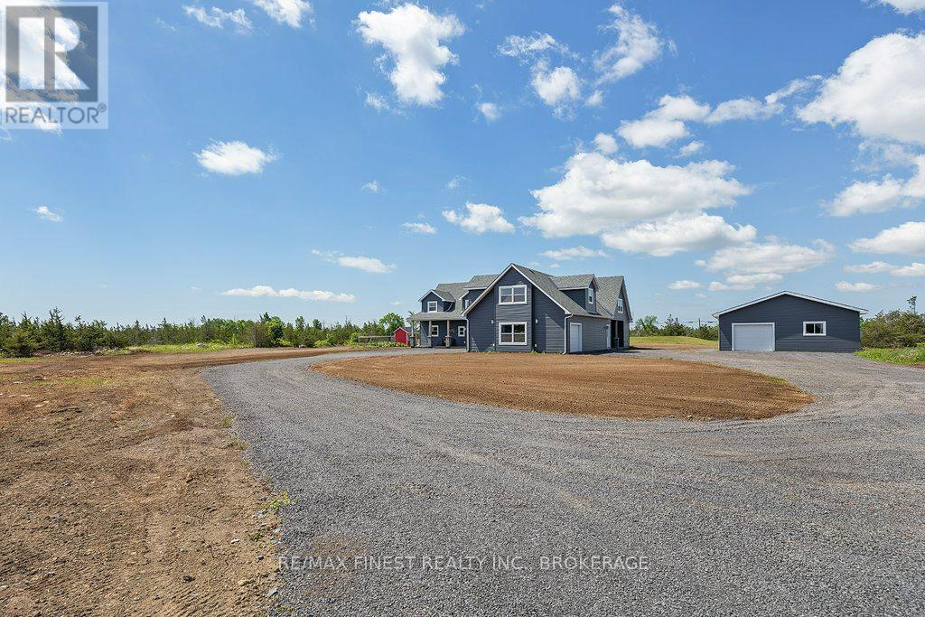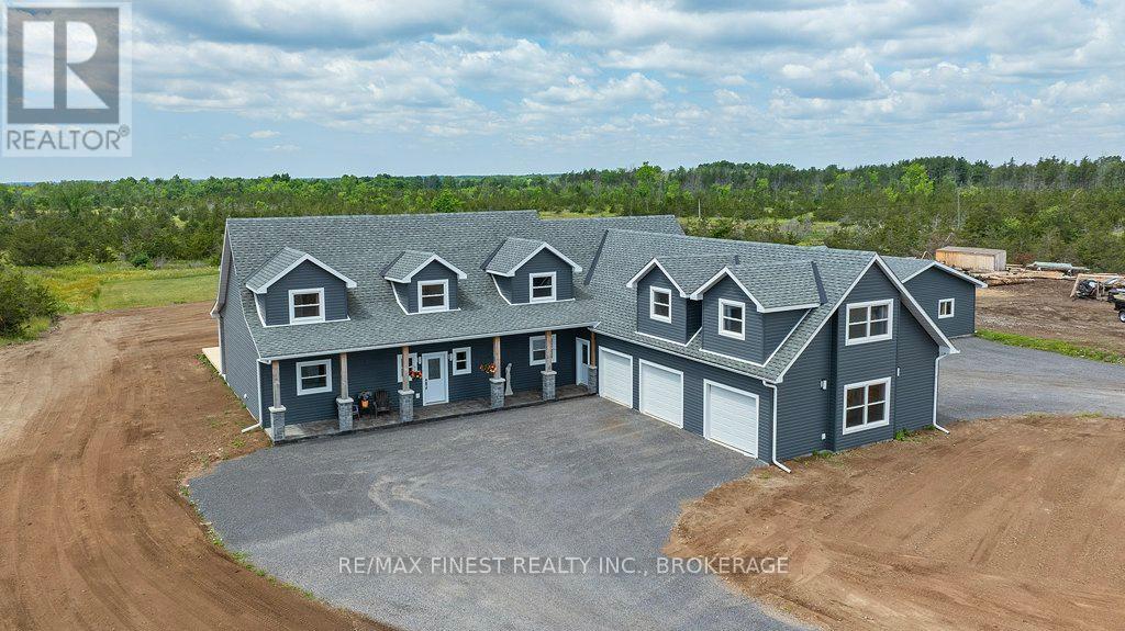Set on a private 42+ acre parcel, this stunning custom-built home offers a truly unique layout and exceptional space for both indoor comfort and outdoor living. The gourmet kitchen is a standout, featuring in-floor heating, quartz countertops, custom oak cabinetry, black stainless steel appliances including a gas stove, and a convenient dual-access pantry from both the kitchen and front entry. The impressive great room showcases soaring vaulted ceilings, expansive windows with custom electric blinds, built-in surround sound, and a sleek electric fireplace. Patio doors open to a generous deck and a 9x18 stamped concrete pad, ready for your future hot tub. Nature lovers will appreciate the walking trails just beyond the backyard, extending to Caton Road that are ideal for exploring or ATV use. The main-level primary suite offers executive-style comfort with a walk-in closet and a spacious 5-piece ensuite, complete with an extra-long soaker tub and walk-in shower. Upstairs, each bedroom features its own private ensuite, along with a versatile bonus space perfect for a home office, lounge, or recreation area. Function meets convenience with a main floor mudroom/laundry area, powder room, and direct access to the oversized 1,100+ sq ft insulated triple-car garage, including a drive-through bay. Above the garage, a self-contained one-bedroom apartment with separate entrance and parking provides excellent income potential, easily generating approximately $1,500/month. Built with efficiency in mind, the home includes in-floor heating throughout the main level, along with a propane furnace and HRV system servicing the entire property. A second detached 900+ sq ft garage offers even more storage for vehicles, equipment, or recreational toys. Ideally located just 10 minutes from Kingston's west end, with easy access to amenities, schools, shopping, and Highway 401. This property delivers privacy without sacrificing convenience. (id:29295)