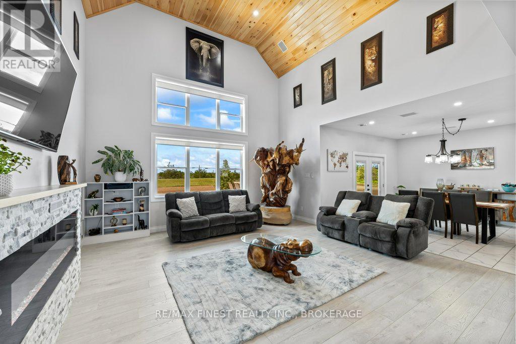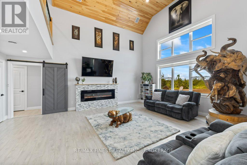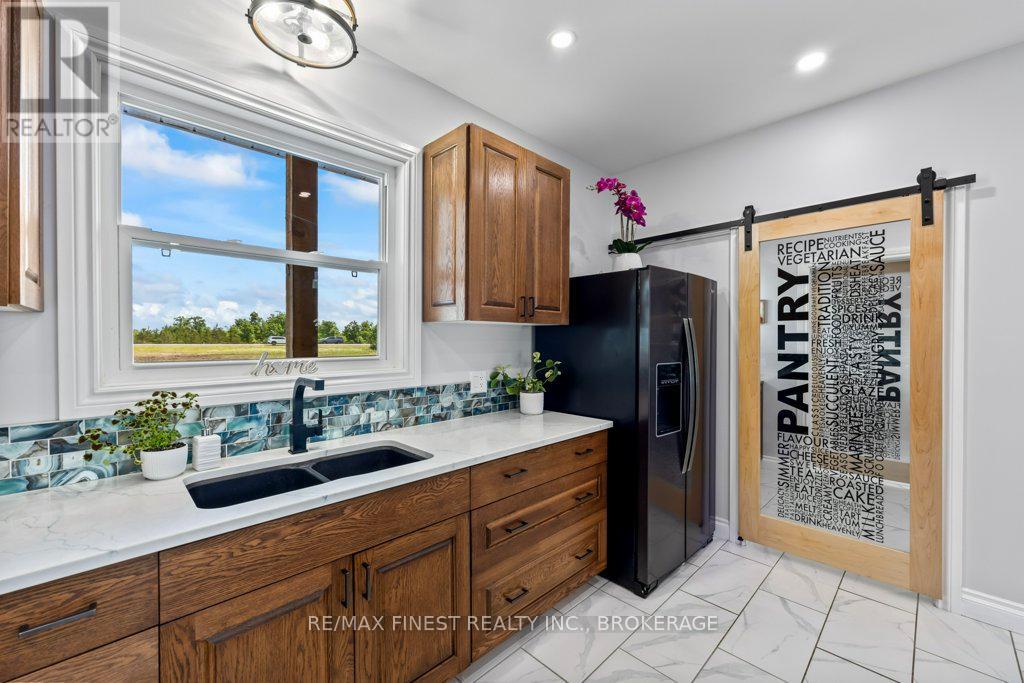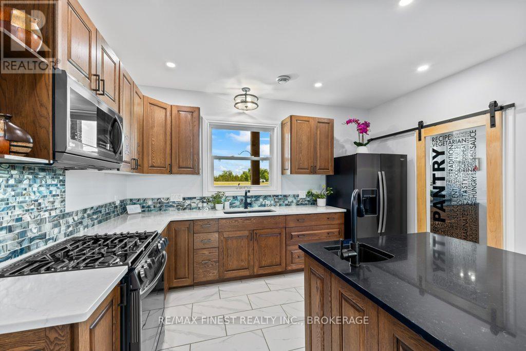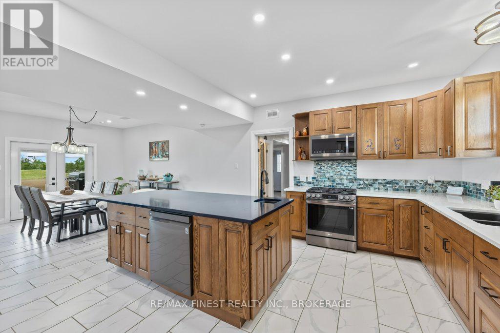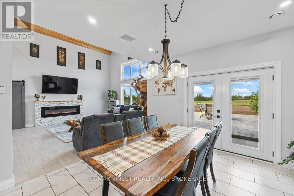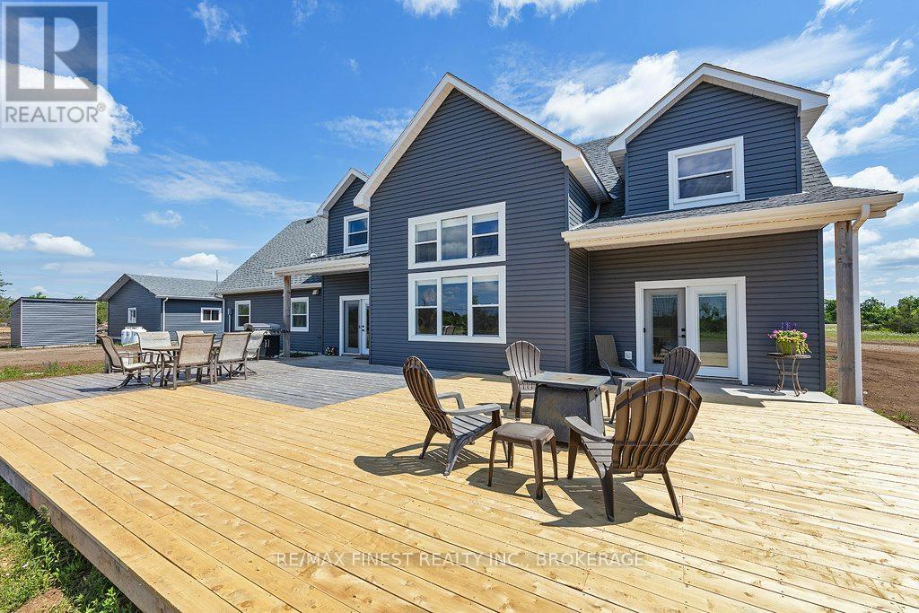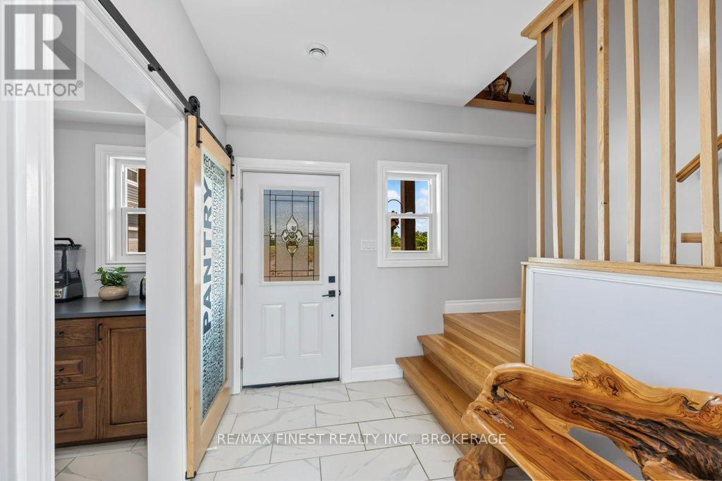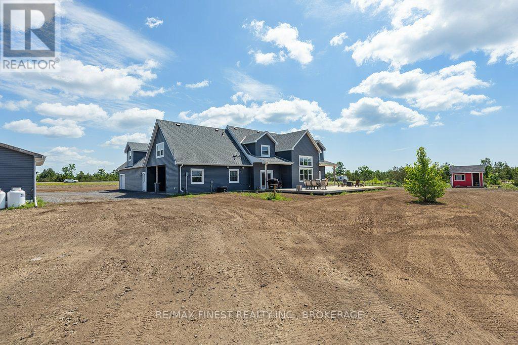 Set on a private 42+ acre parcel, this stunning custom-built home offers a truly unique layout and exceptional space for both indoor comfort and outdoor living. The gourmet kitchen is a standout, featuring in-floor heating, quartz countertops, custom oak cabinetry, black stainless steel appliances including a gas stove, and a convenient dual-access pantry from both the kitchen and front entry. The impressive great room showcases soaring vaulted ceilings, expansive windows with custom electric blinds, built-in surround sound, and a sleek electric fireplace. Patio doors open to a generous deck and a 9x18 stamped concrete pad, ready for your future hot tub. Nature lovers will appreciate the walking trails just beyond the backyard, extending to Caton Road that are ideal for exploring or ATV use. The main-level primary suite offers executive-style comfort with a walk-in closet and a spacious 5-piece ensuite, complete with an extra-long soaker tub and walk-in shower. Upstairs, each bedroom features its own private ensuite, along with a versatile bonus space perfect for a home office, lounge, or recreation area. Function meets convenience with a main floor mudroom/laundry area, powder room, and direct access to the oversized 1,100+ sq ft insulated triple-car garage, including a drive-through bay. Above the garage, a self-contained one-bedroom apartment with separate entrance and parking provides excellent income potential, easily generating approximately $1,500/month. Built with efficiency in mind, the home includes in-floor heating throughout the main level, along with a propane furnace and HRV system servicing the entire property. A second detached 900+ sq ft garage offers even more storage for vehicles, equipment, or recreational toys. Ideally located just 10 minutes from Kingston's west end, with easy access to amenities, schools, shopping, and Highway 401. This property delivers privacy without sacrificing convenience. (id:29295)